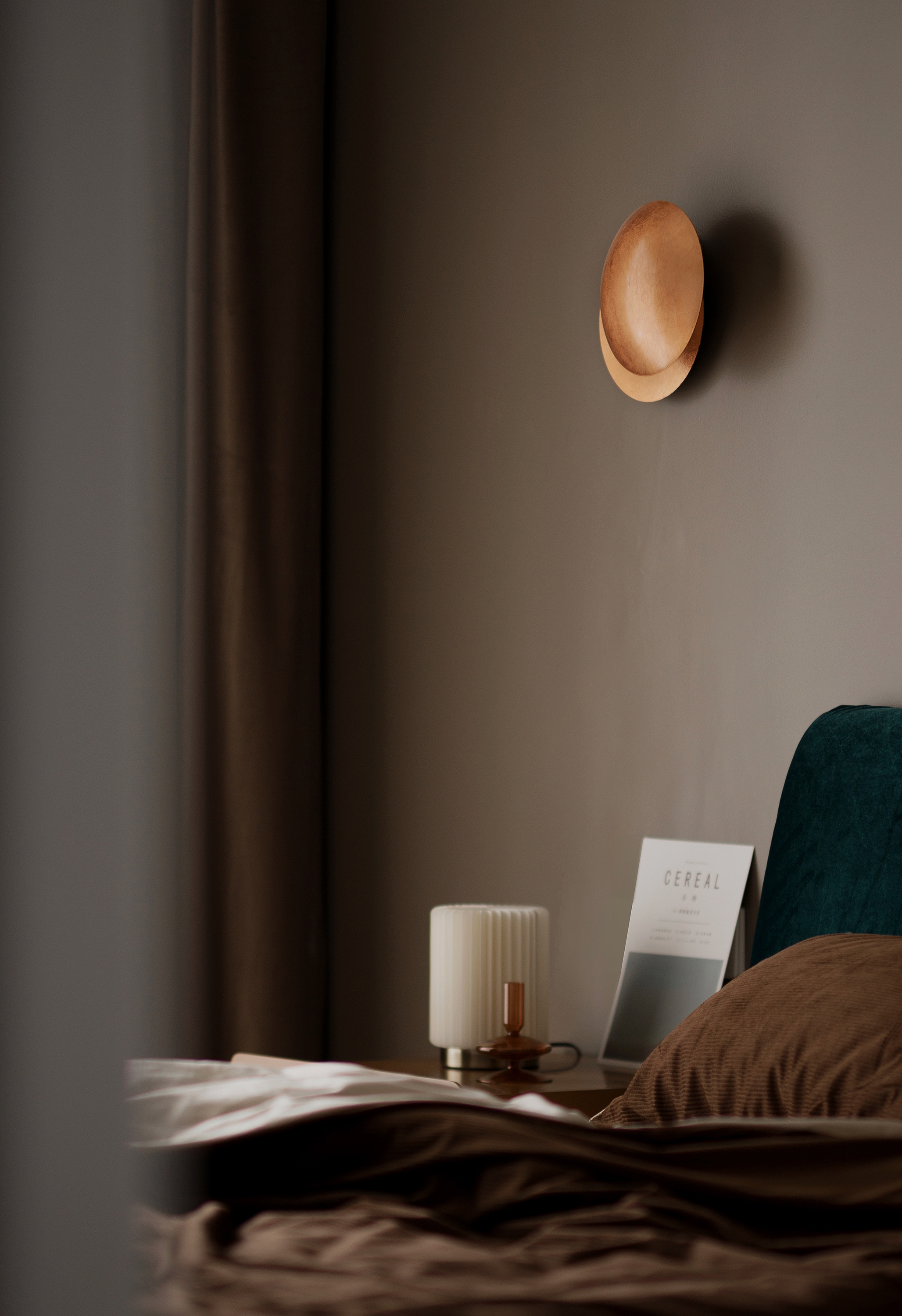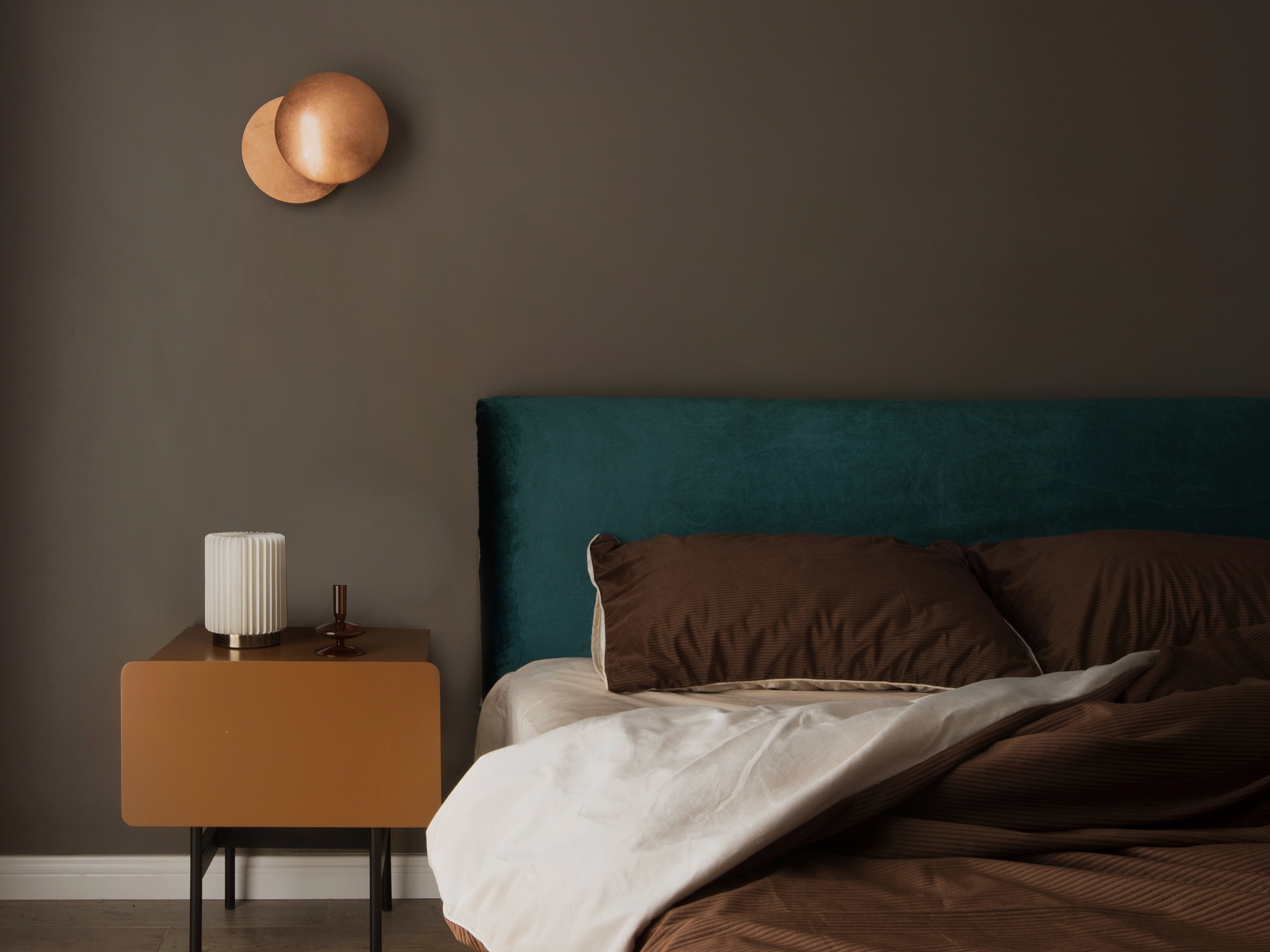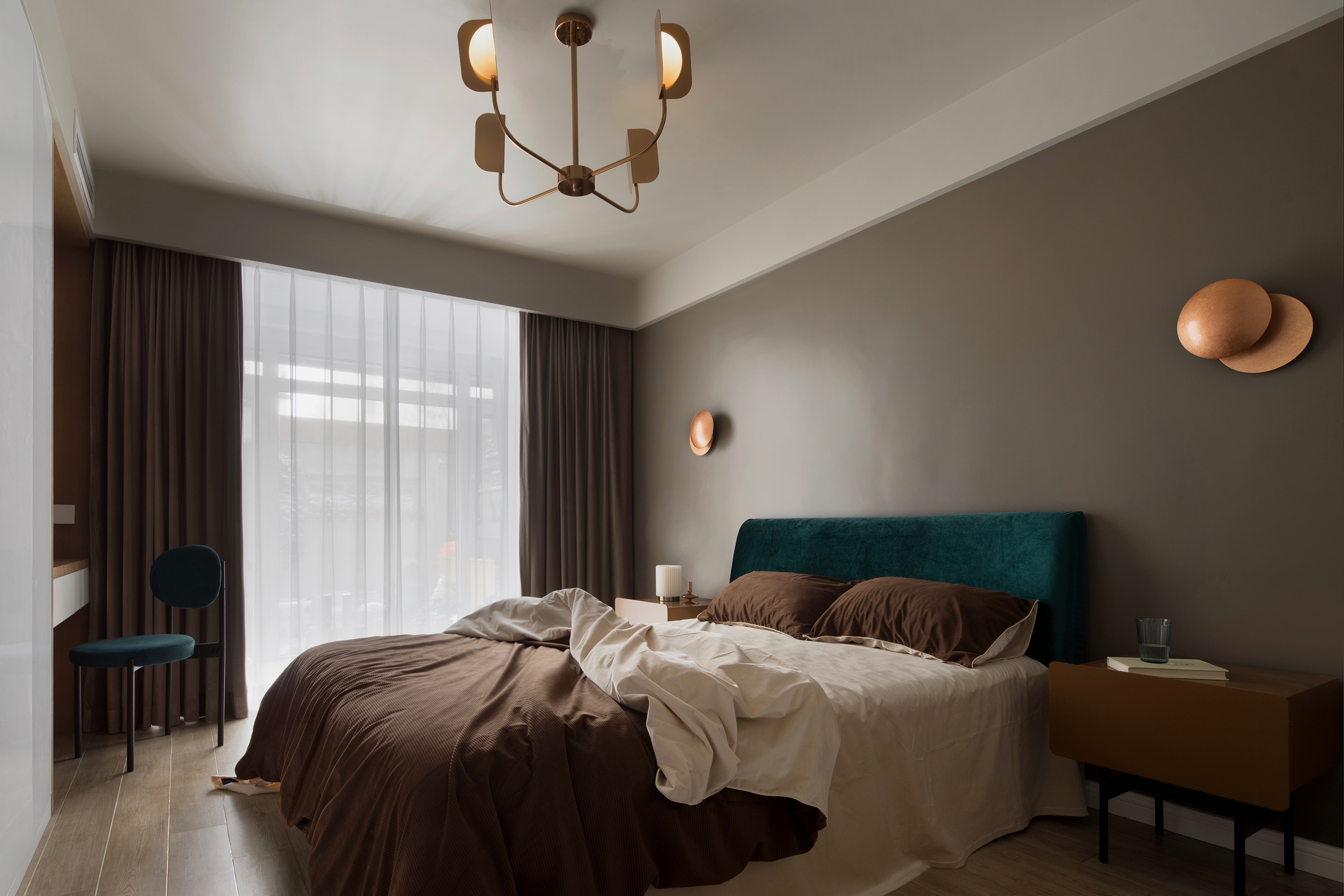 主卧室在布置上主要考虑色彩方面的搭配,给人一种小复古的气息,以同类色为主,只是深浅不同,顶部也是淡淡的黄,卧室宽度足够,所以在床对面定制了一整排的储物柜,还集成了一个工作写字台,床侧面没有衣柜,空出位置刚好暂时放置小二宝的小床。