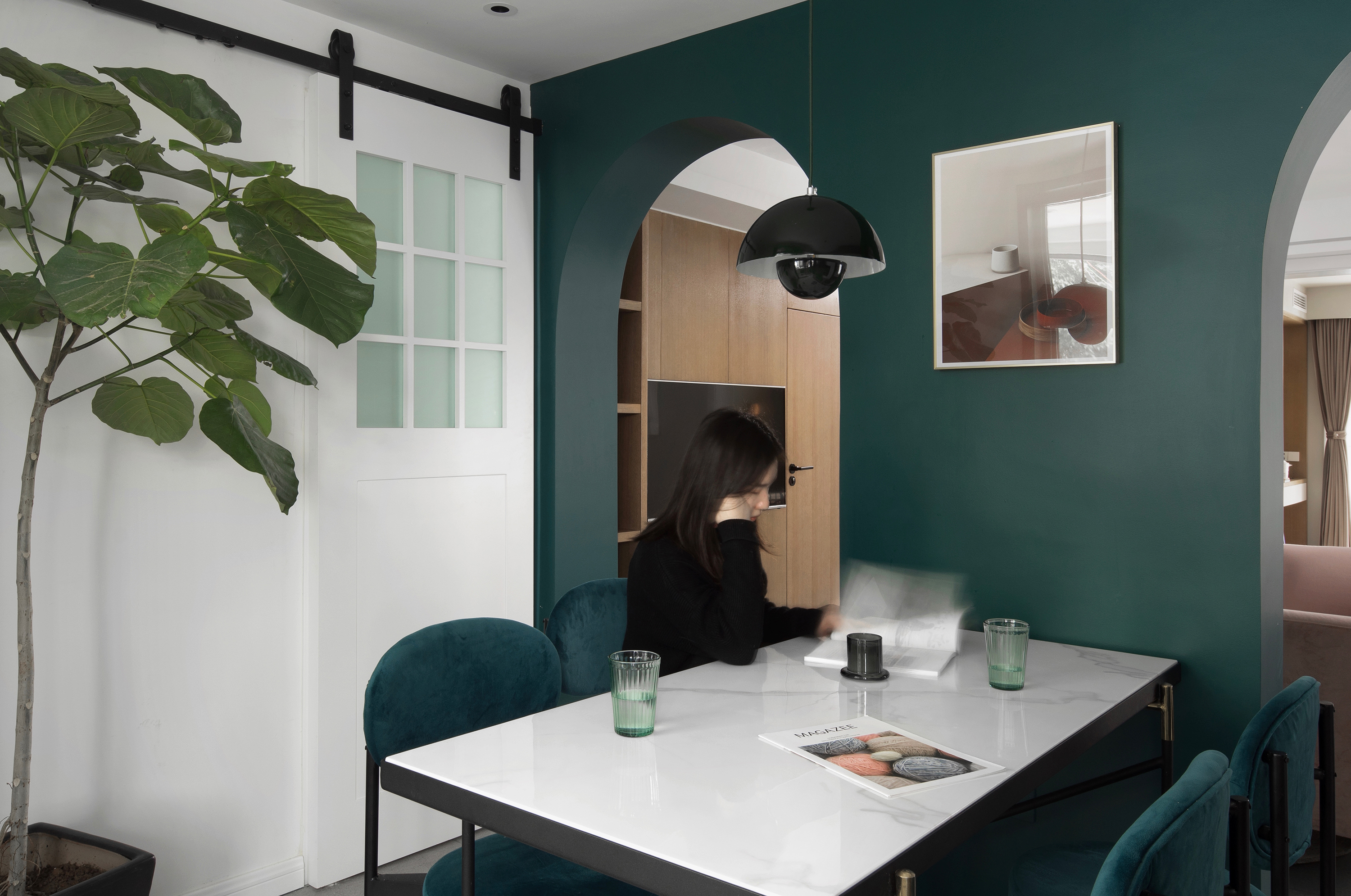 餐厅延续整体风格,在餐厅西墙面定制柜体,布置了冰箱和蒸烤箱,增加了储物空间,更是对原本比较小的厨房做了外扩的补充。东墙面是卫生间干区的谷仓门。其实现在餐厅是原先厨房的位置,现在厨房是原北阳台的位置。橱柜、灯、餐桌椅、装饰画等的选择在内容上和整体呼应,色彩是互补色的运用。