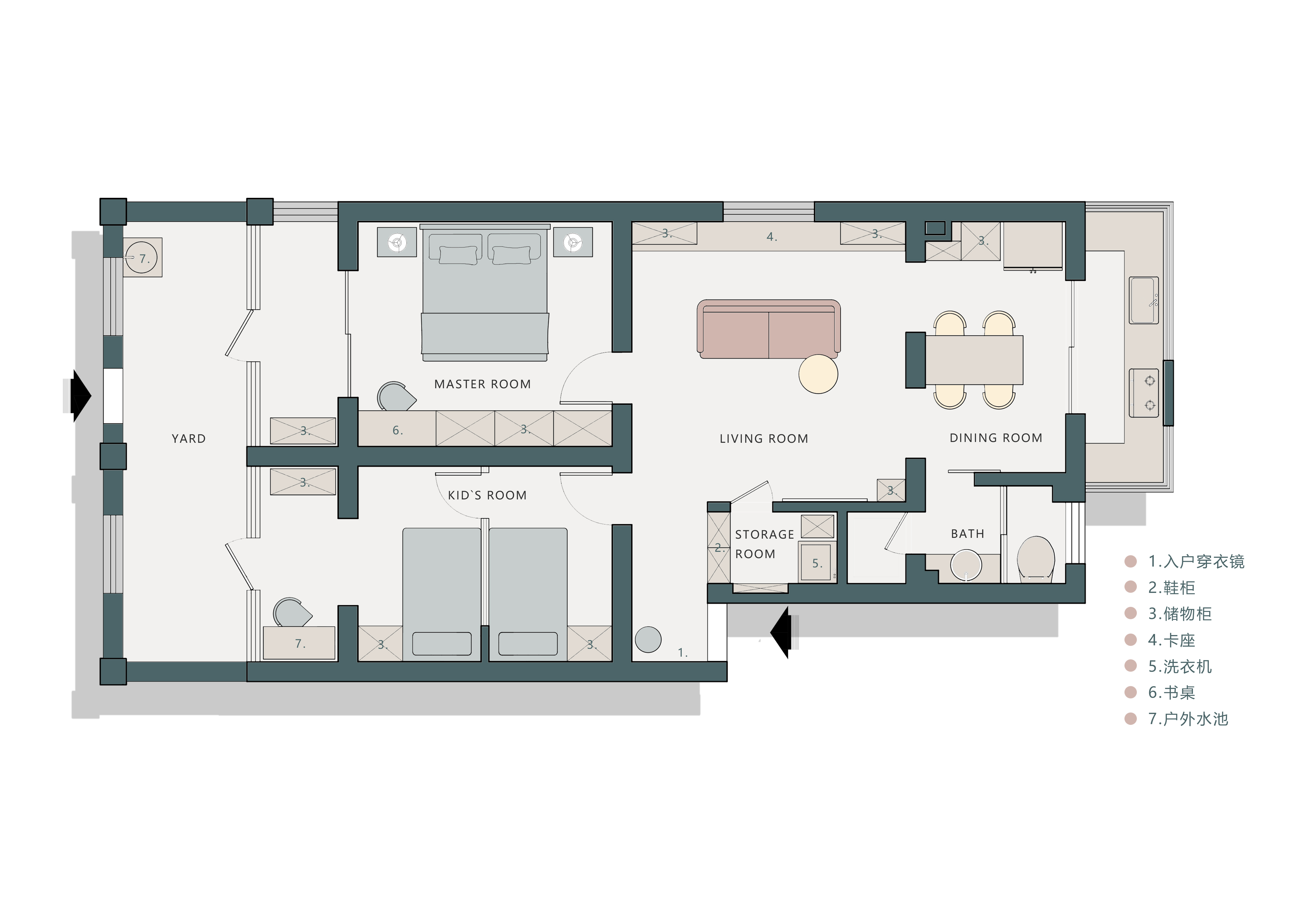 空间布局:本案位于南京市凤凰西街,是一套老房改造纯设计案例,四口之家居住其中。 业主希望有独立的客厅、餐厅、厨房,还希望有一个三分离的卫生间,让两个宝宝有各自独立的空间。 通过思考分析,改变了原有入户门的位置,划分出比较规整客厅的同时,也规划出了一个独立储物洗衣间,同时也有了入户玄关。客厅沙发后面留有过道,在原有窗户处,定制卡座和书柜,让客厅多一点灵活性和实用性。 通过两个拱形门洞,可进入餐厅,现有餐厅是原有结构的厨房位置,放置四人桌,一家四口可轻松就餐。在餐厅西墙布置设备柜放置冰箱和蒸烤箱,增加了储物空间更实用。