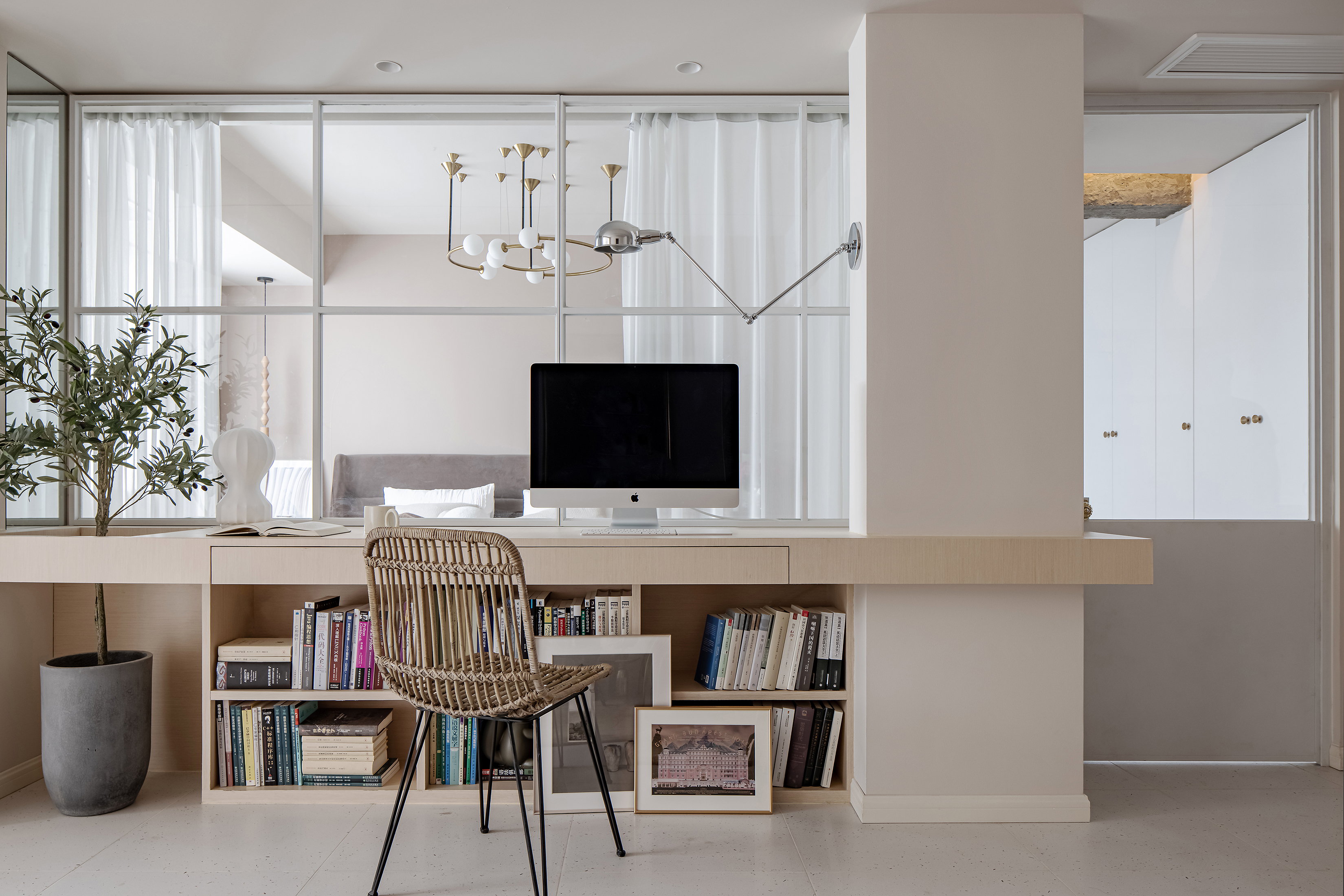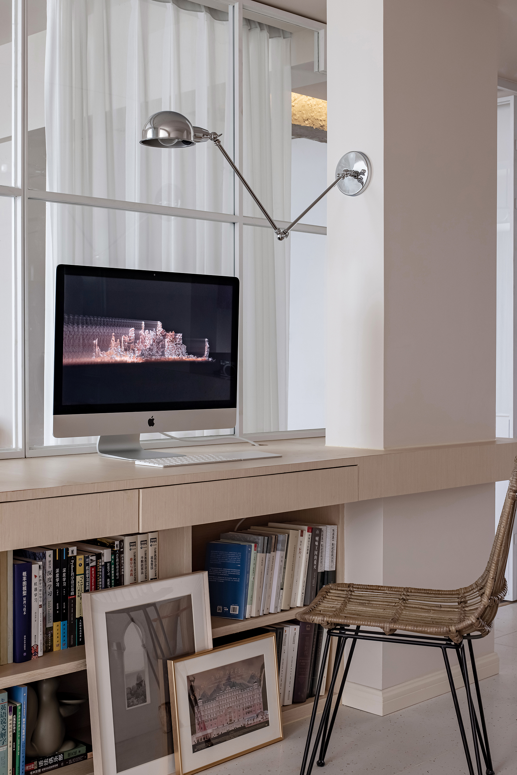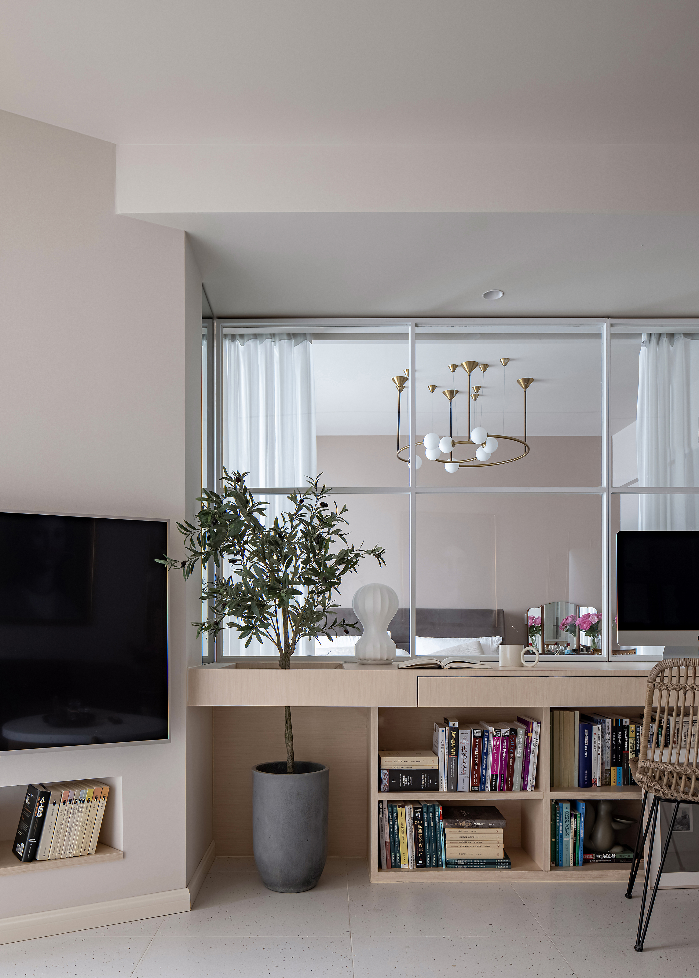 写字台下方书柜放置常用备课书籍,客厅与卧室之间仅用通透玻璃纱帘分隔。