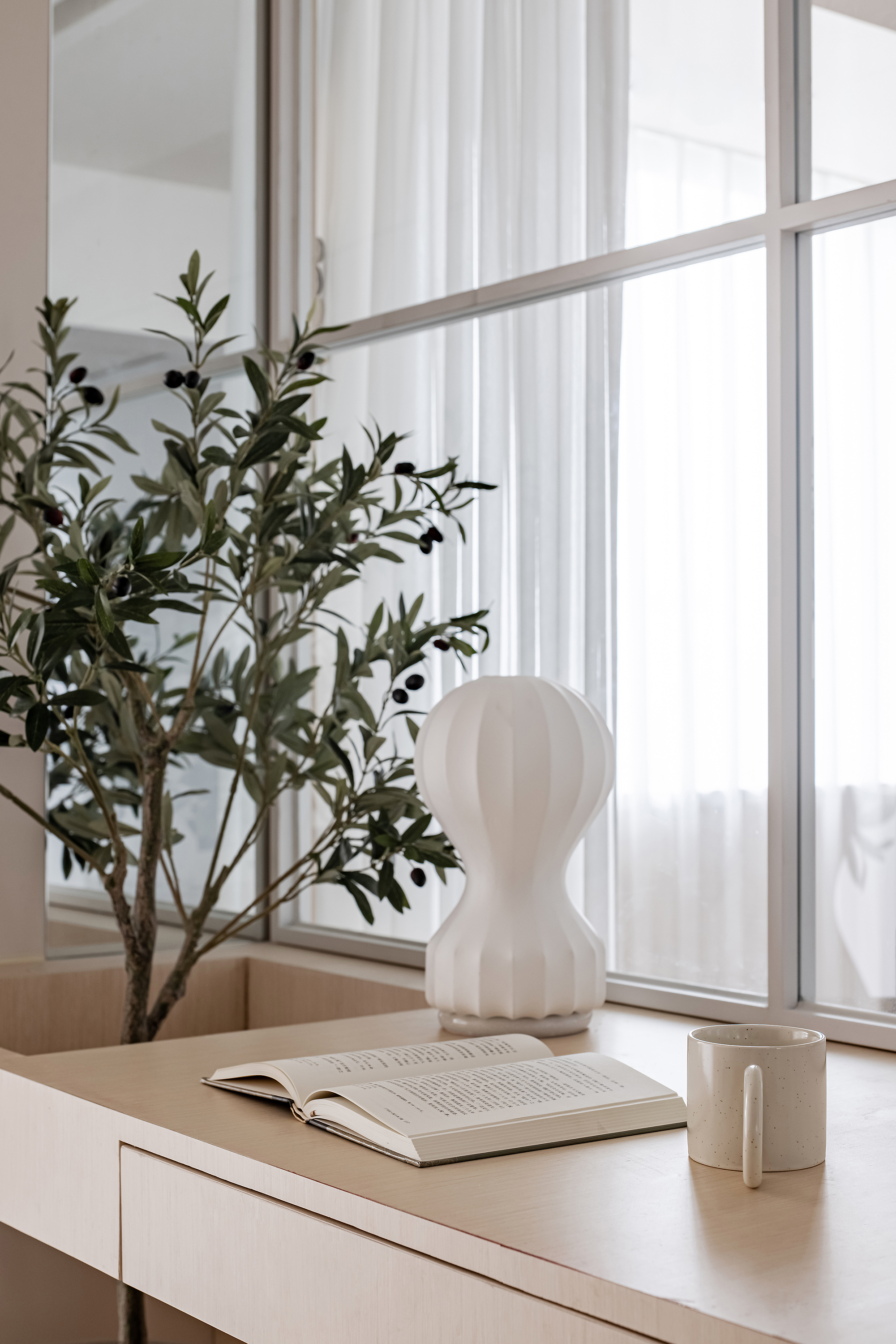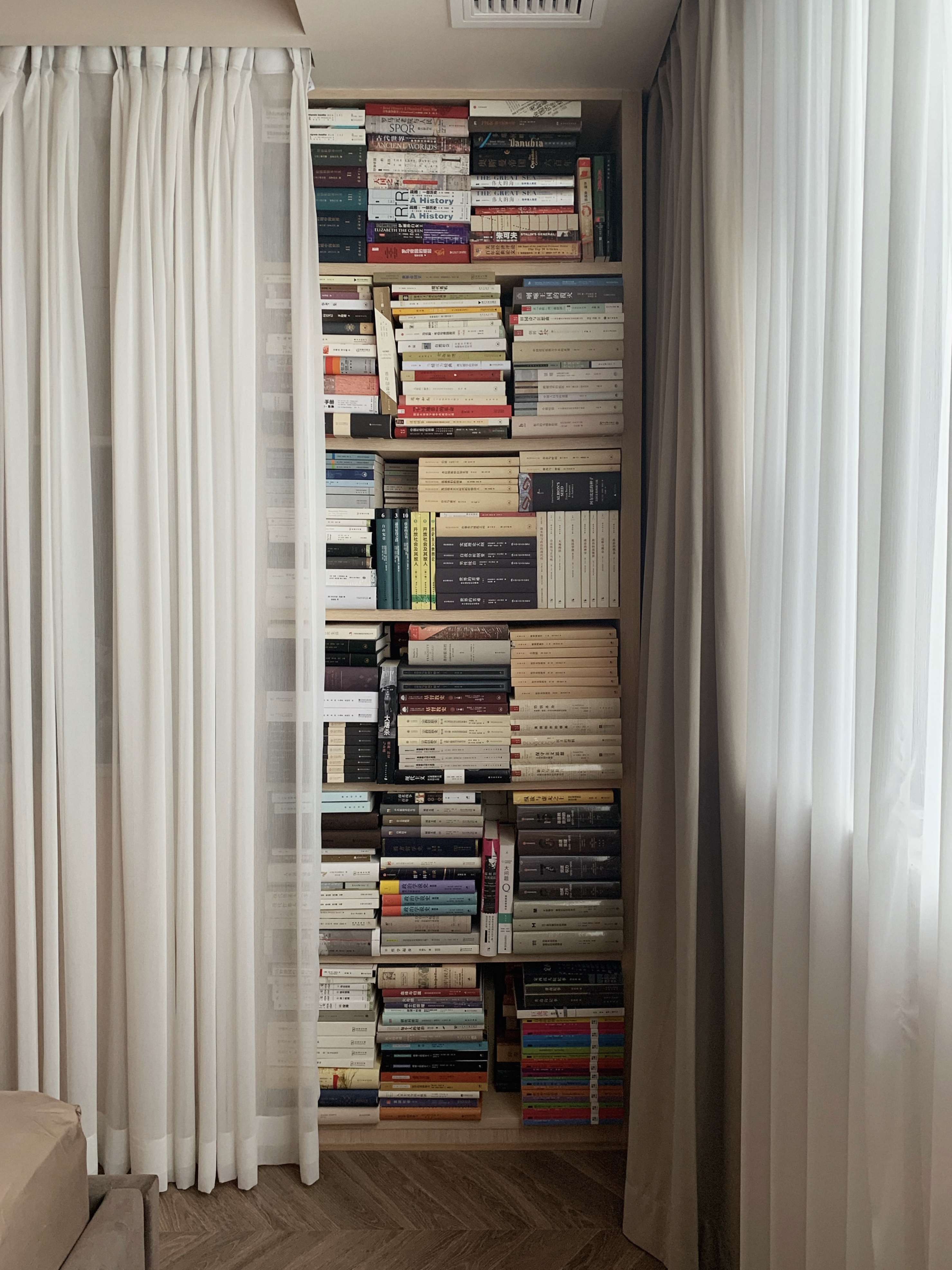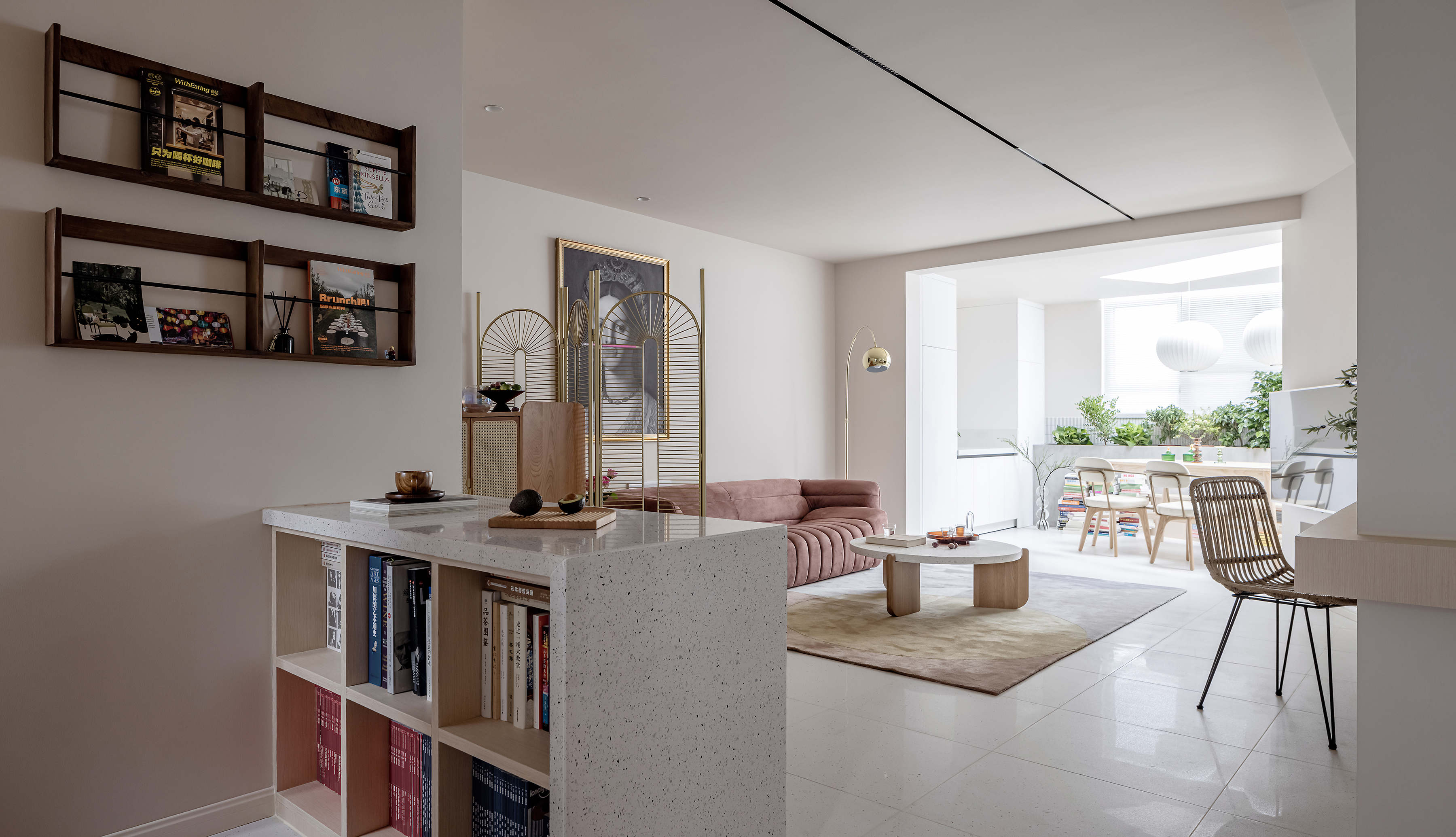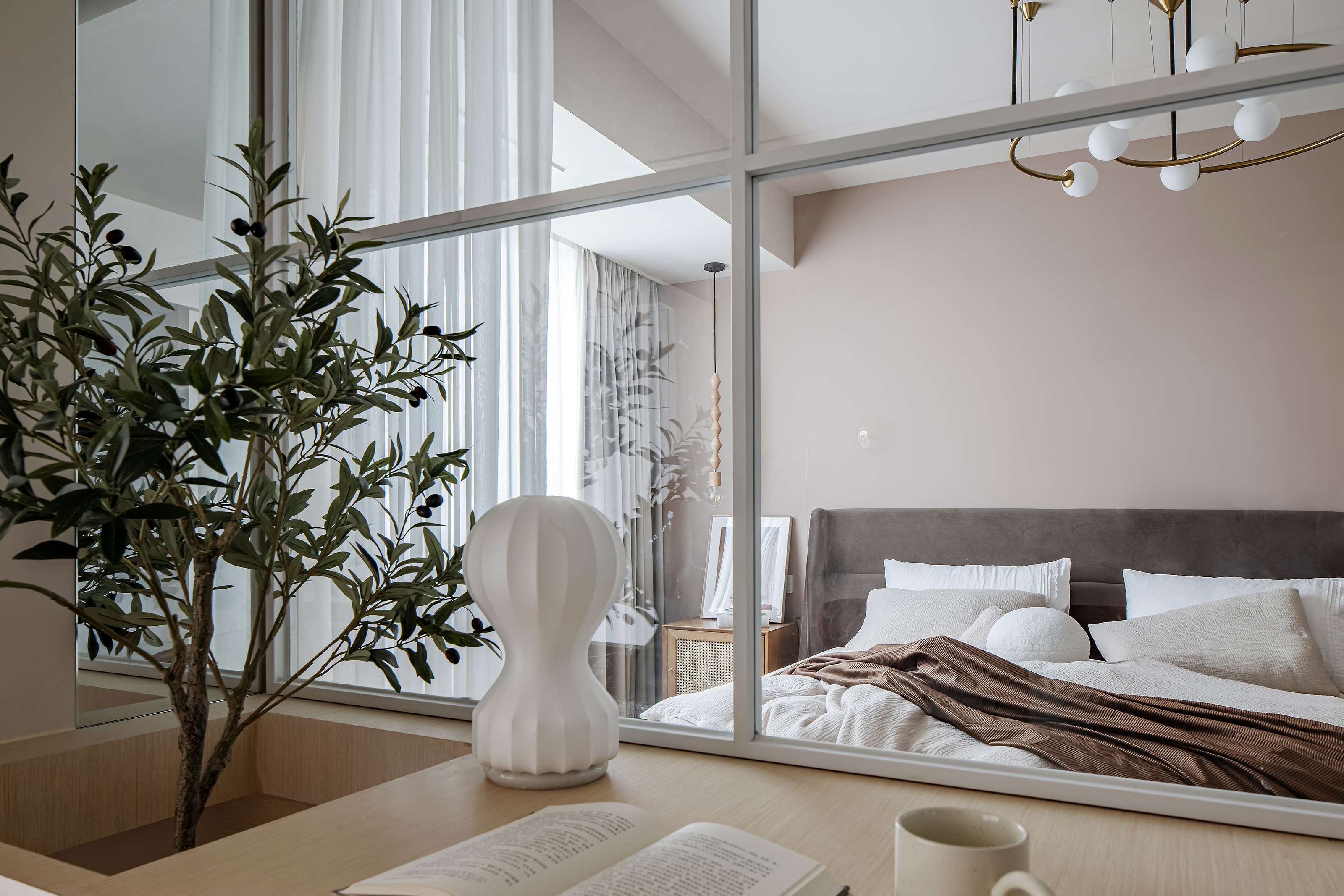 写字台下方书柜放置常用备课书籍,客厅与卧室之间仅用通透玻璃纱帘分隔。