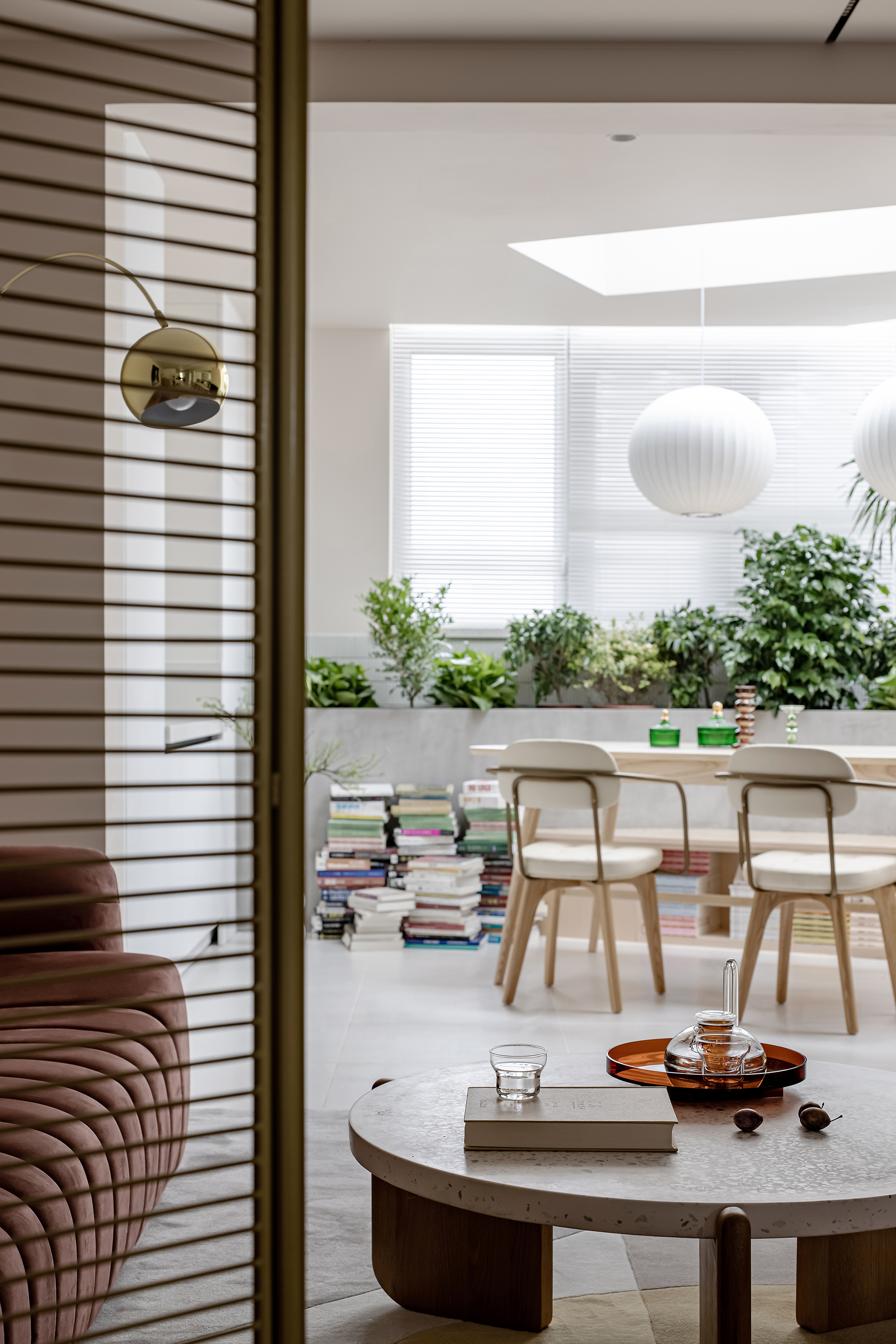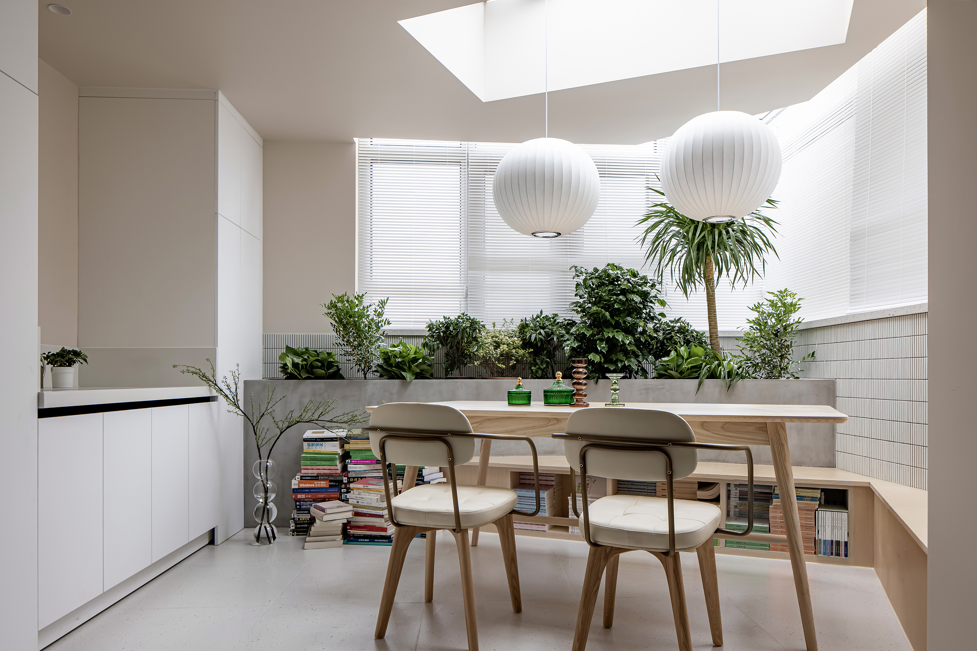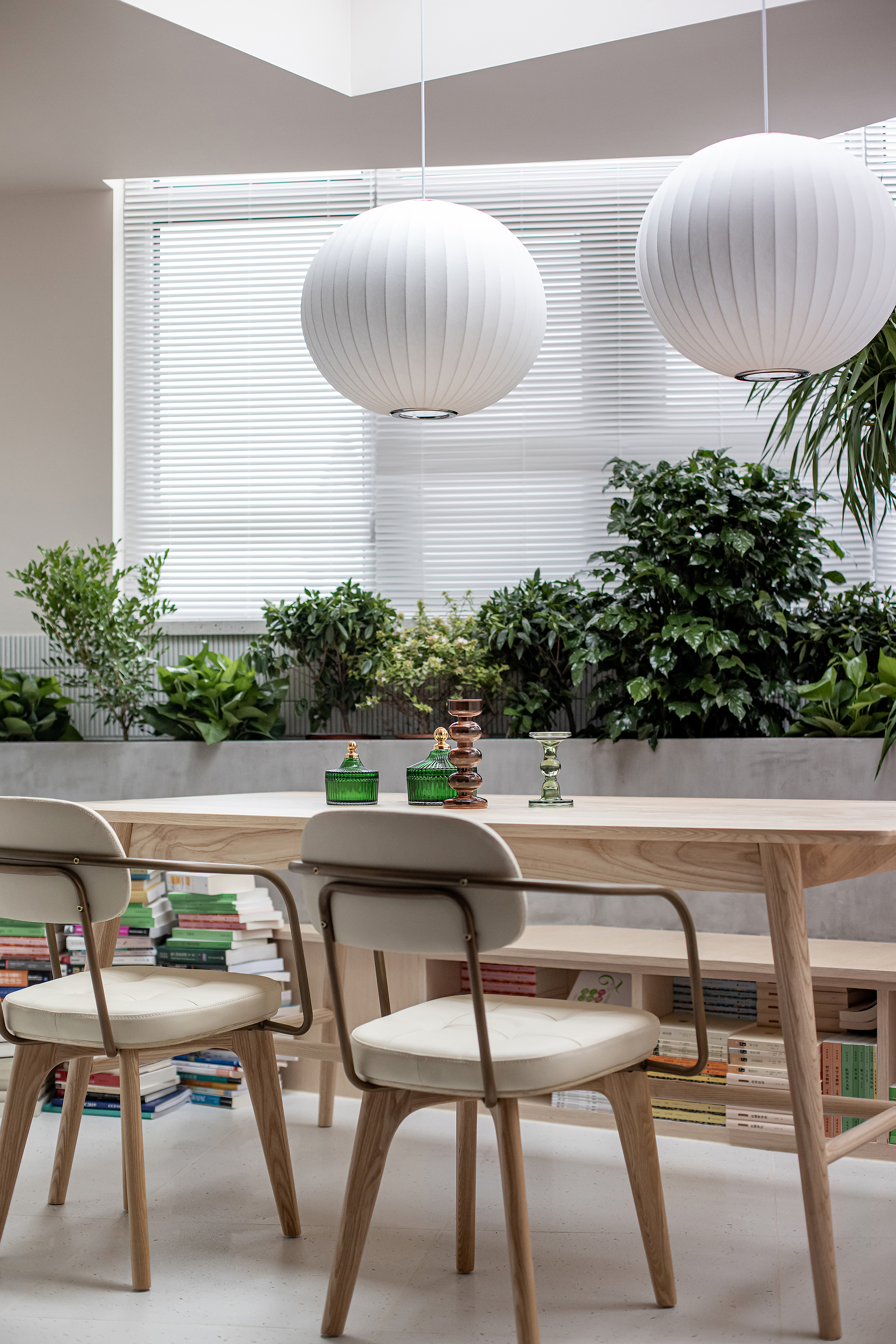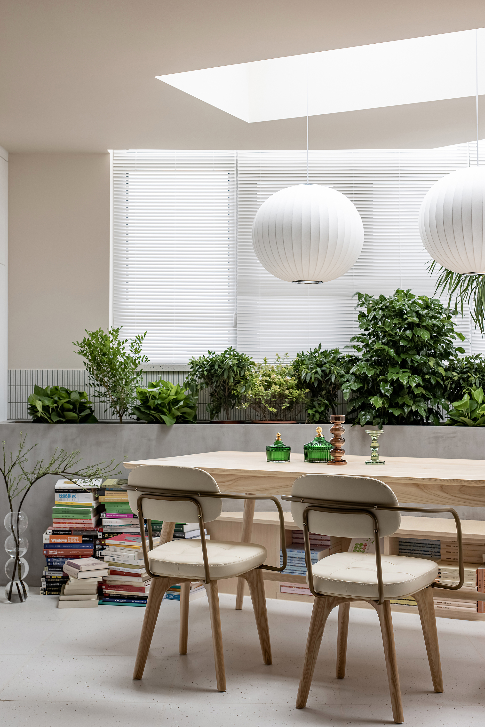 餐厅将户外阳台封闭,开设天窗,增加植物景观,下设木制卡座,集合书柜,搭配原木色餐桌与皮制餐椅进行混搭,整体色系将客厅空间与餐厅空间氛围融合过渡。