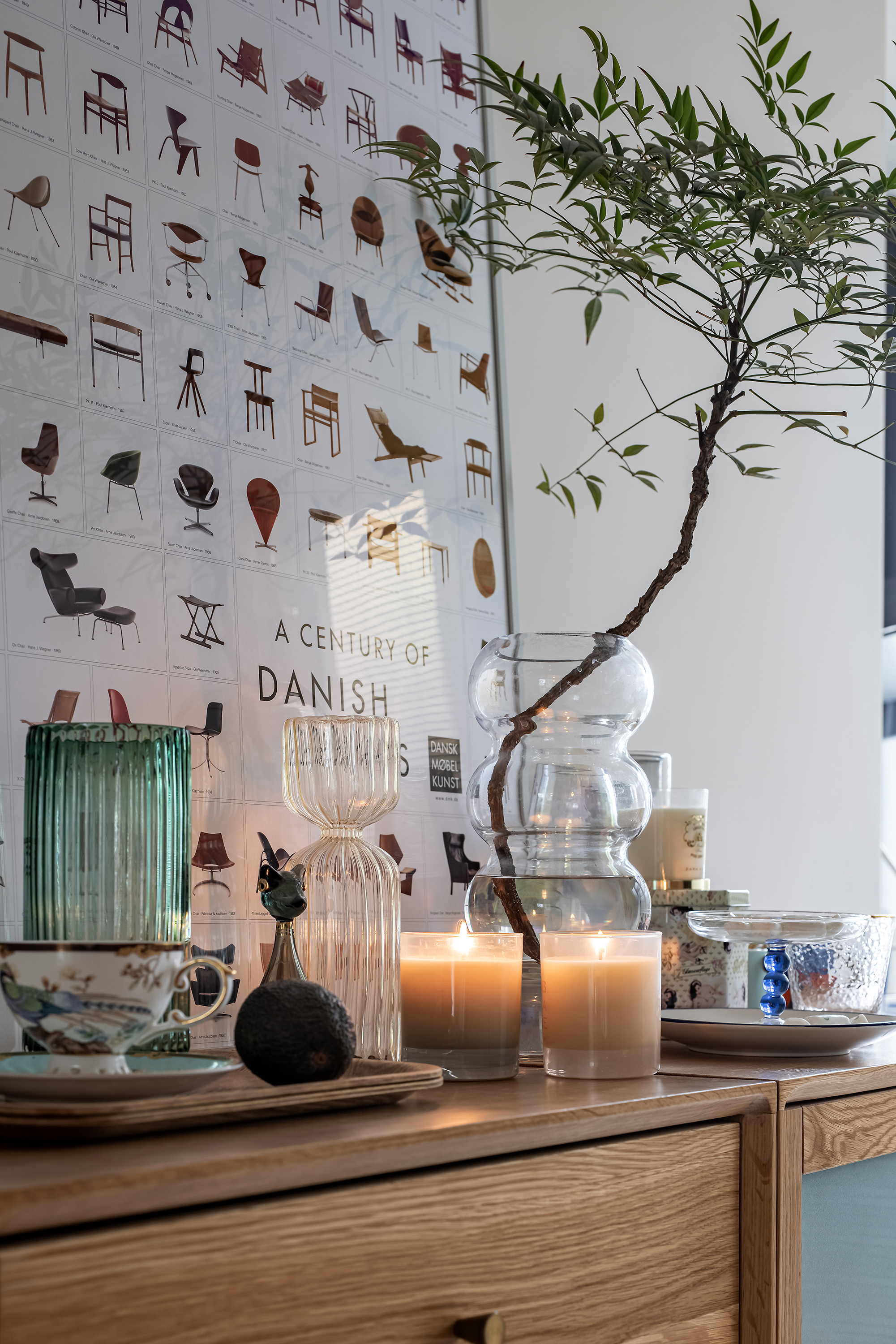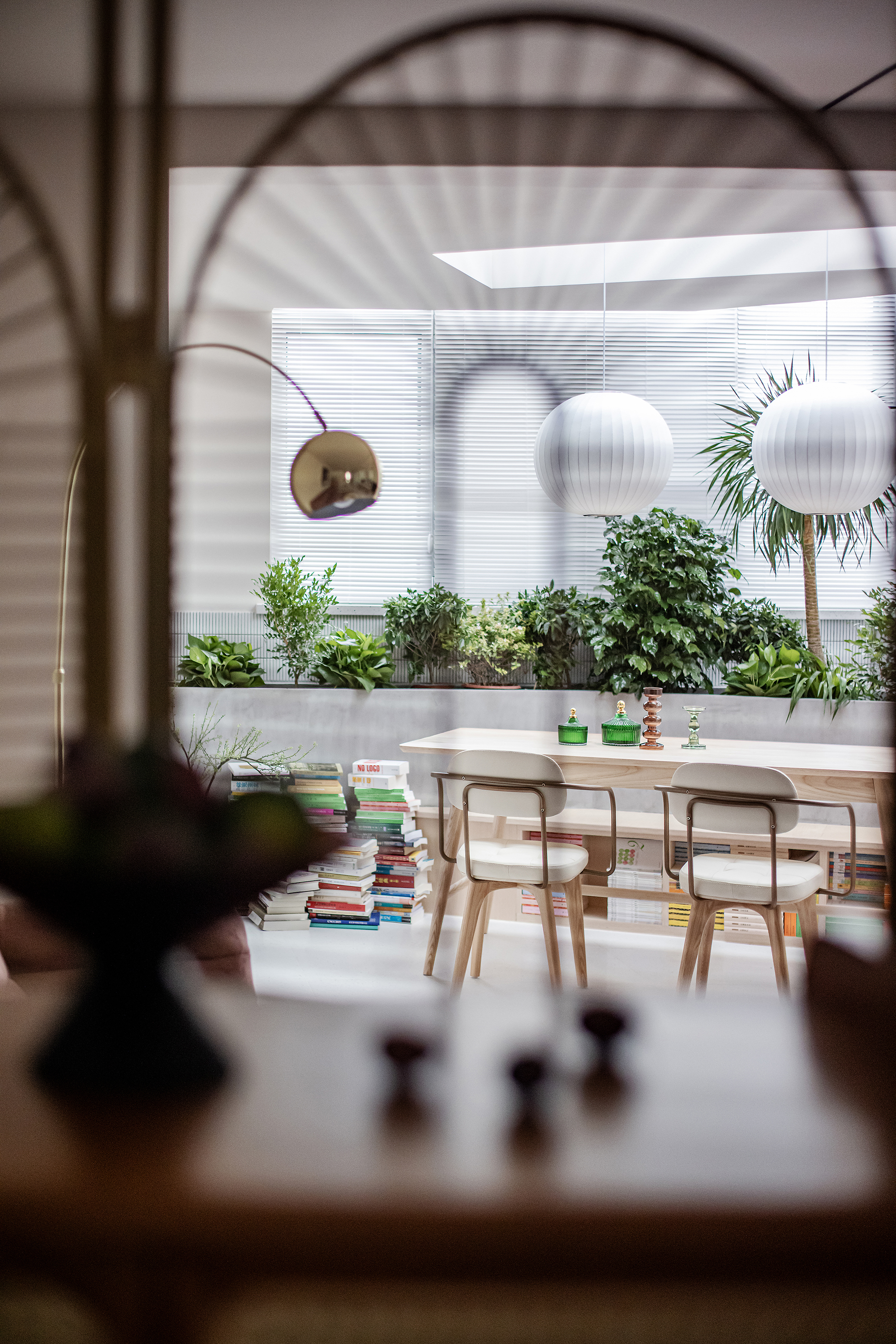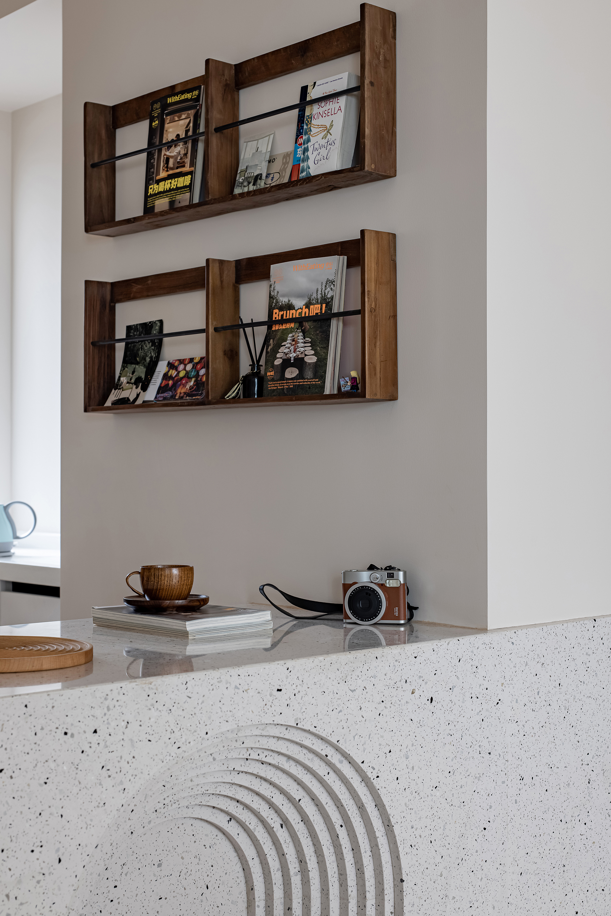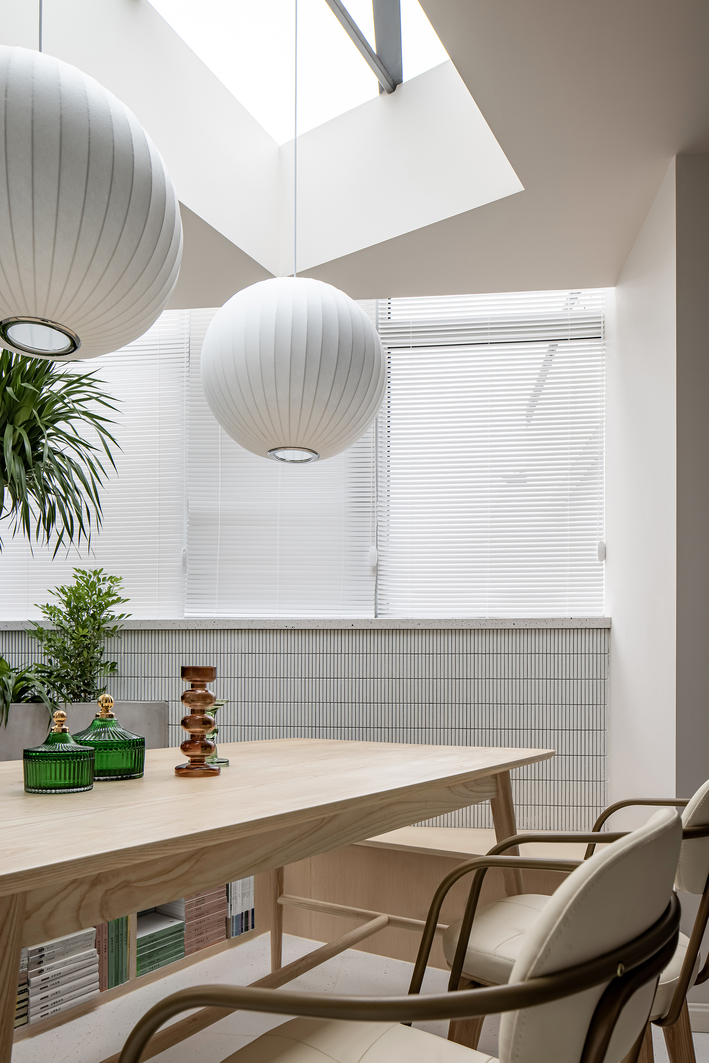餐厅将户外阳台封闭,开设天窗,增加植物景观,下设木制卡座,集合书柜,搭配原木色餐桌与皮制餐椅进行混搭,整体色系将客厅空间与餐厅空间氛围融合过渡。