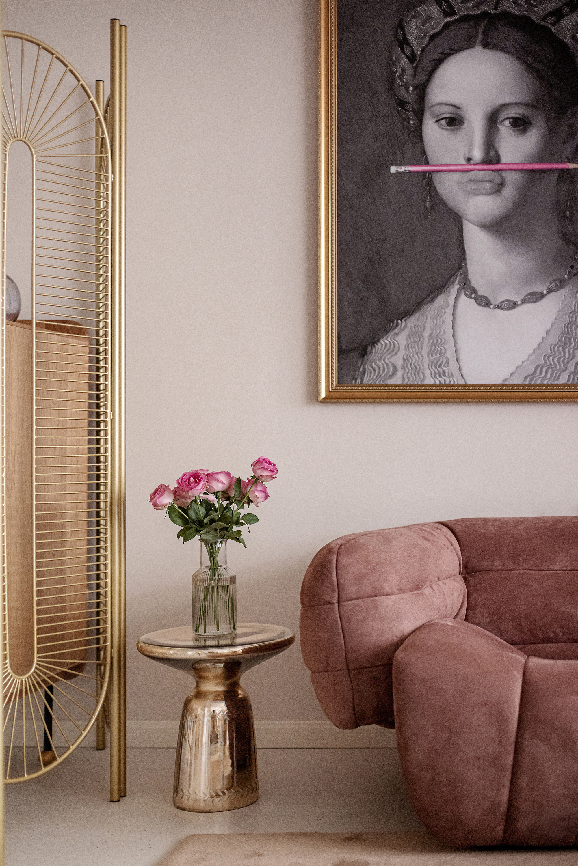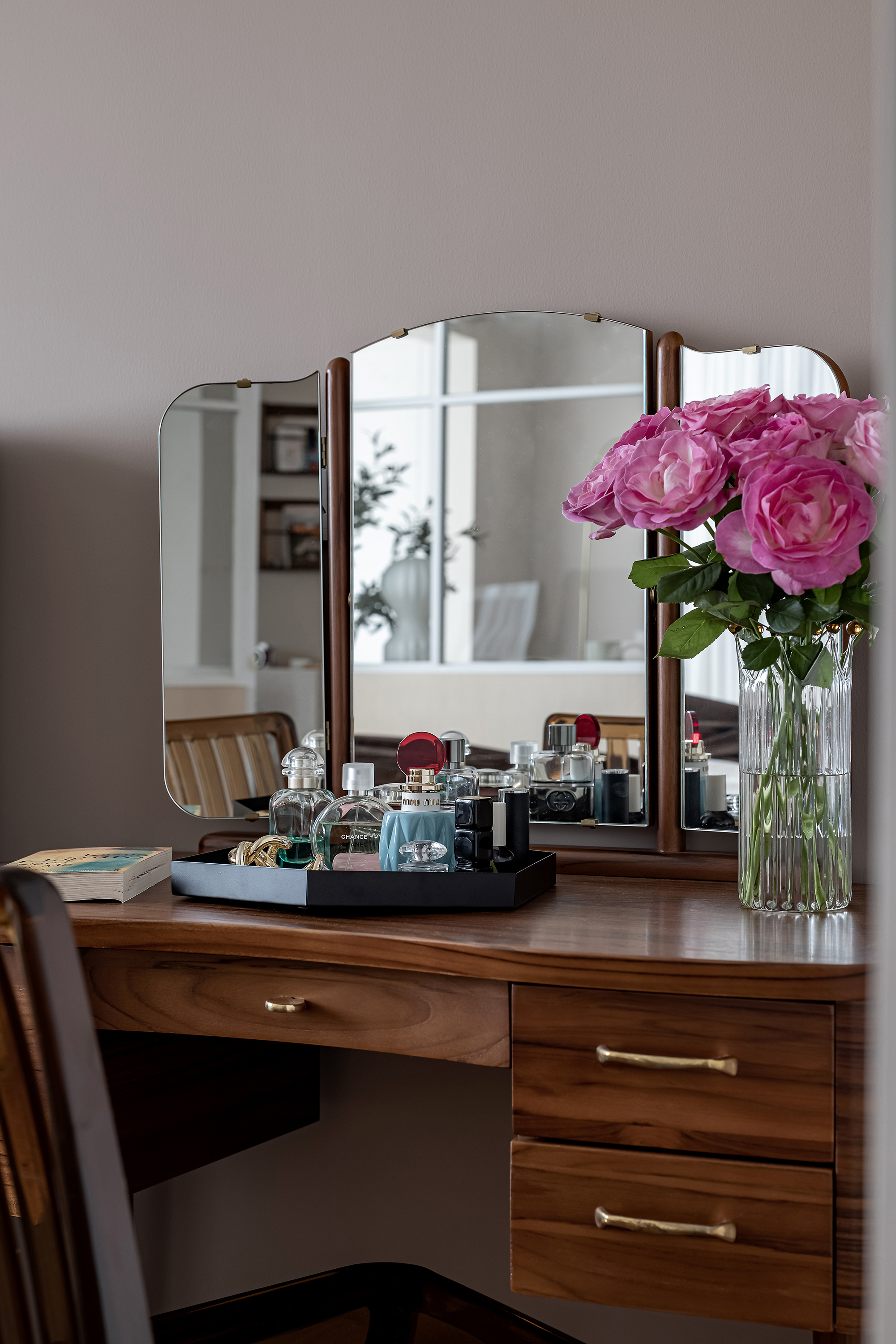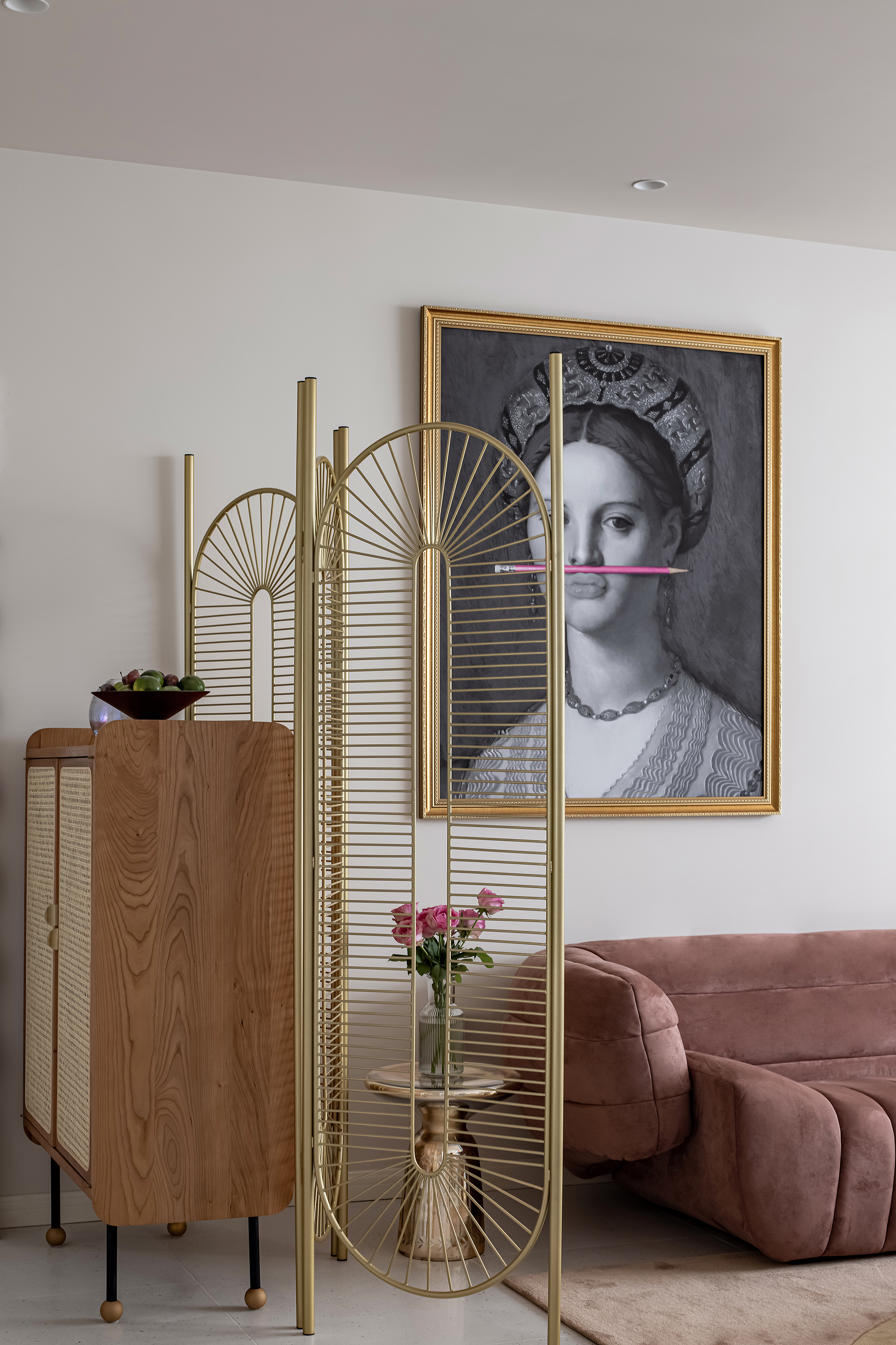 进门区域采用传统手法,选用金色屏风与复古鞋柜当作玄关。