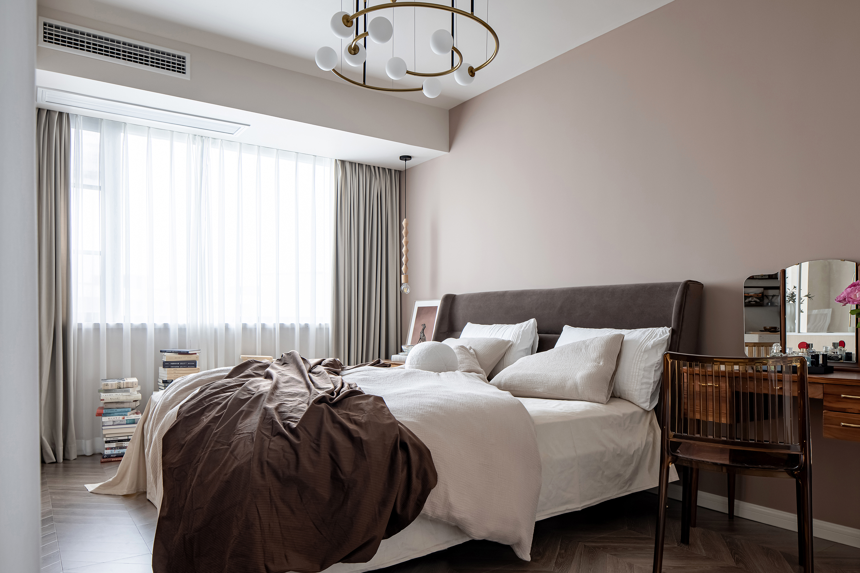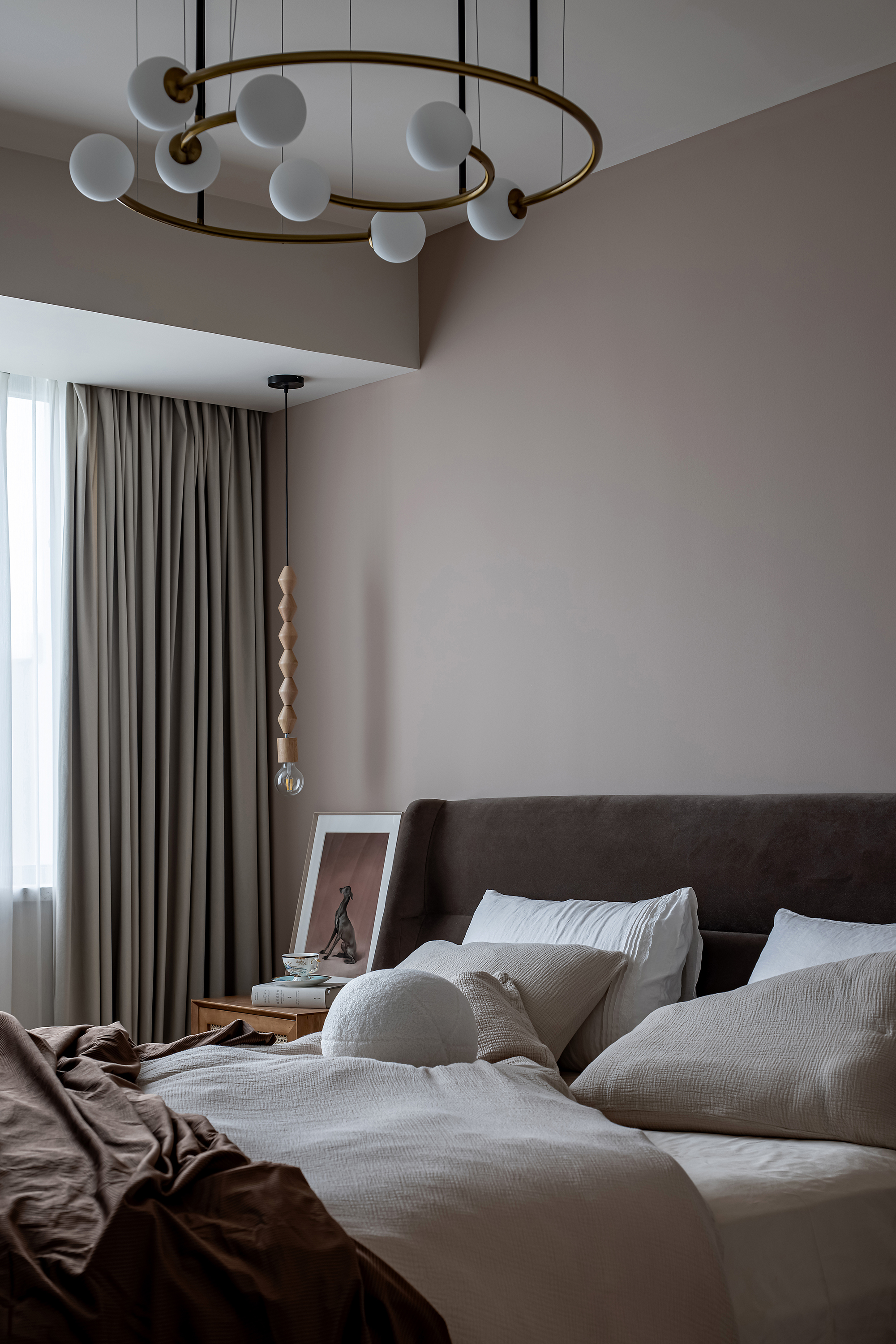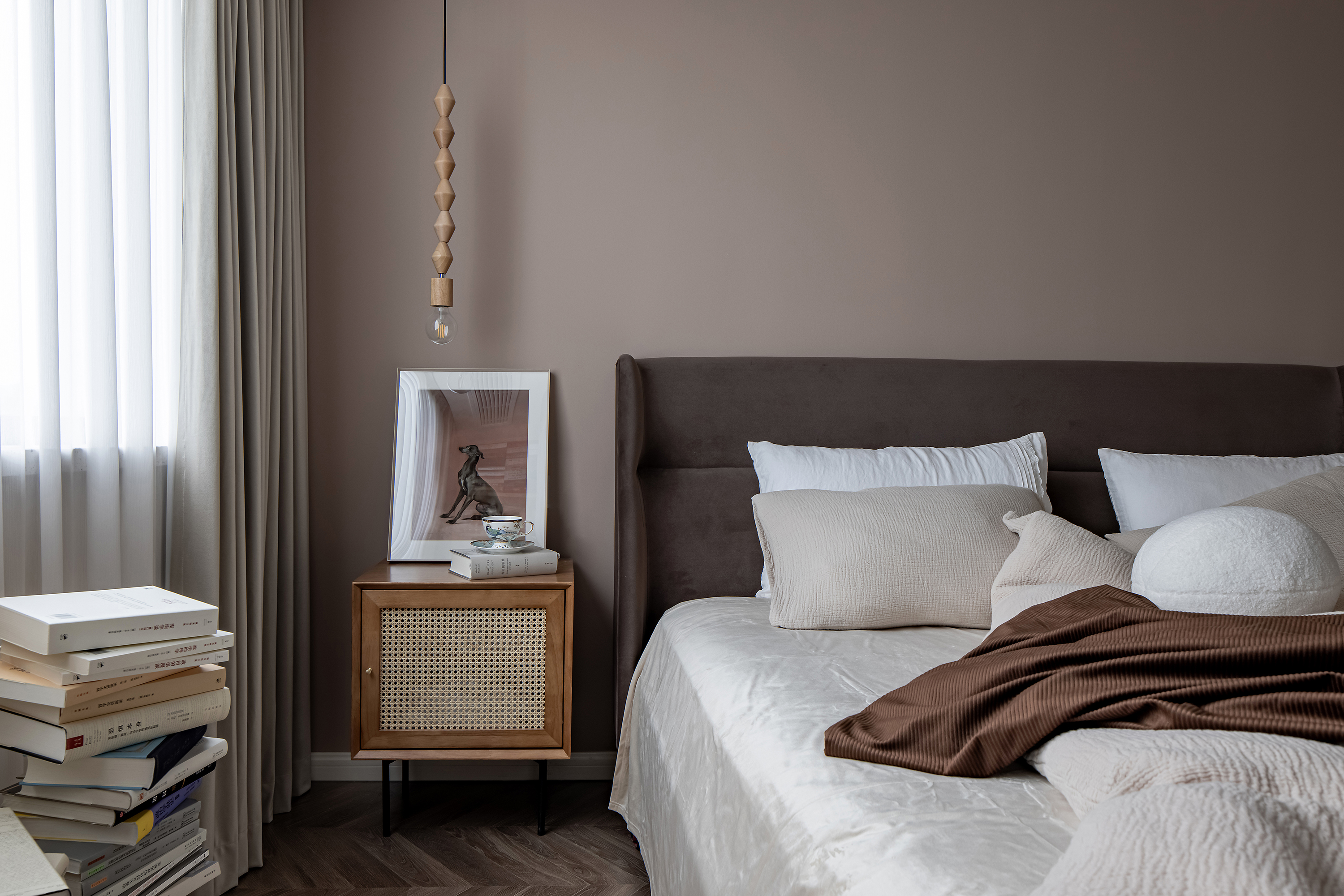 主卧室同样采用温柔大地色系和整体进行呼应,咖色绒布床头和棉质床品,让家居氛围更加温馨。