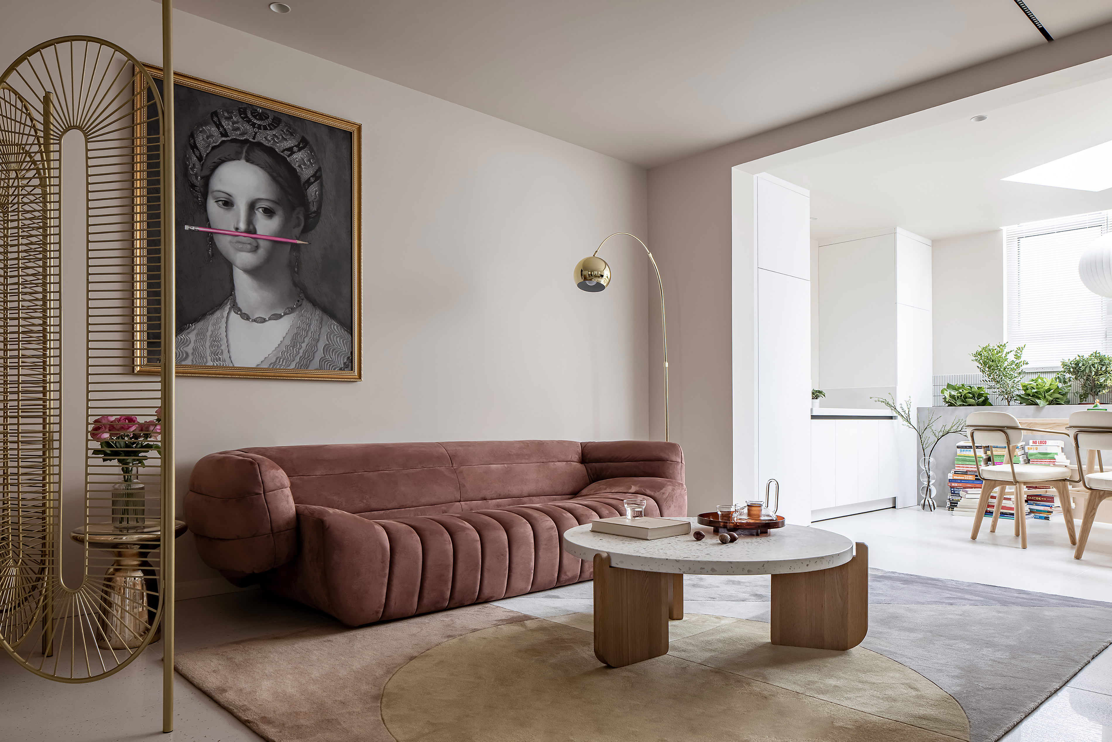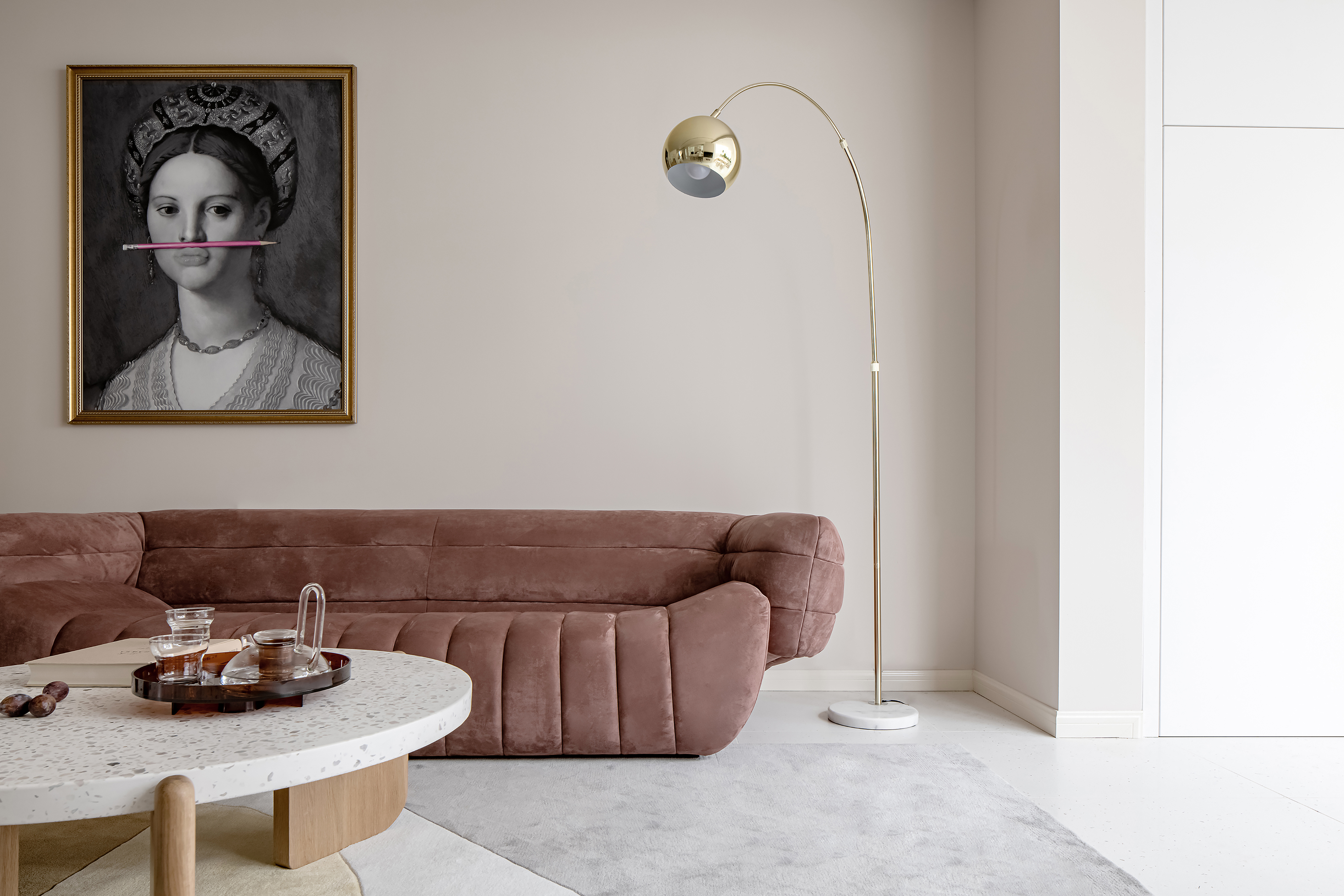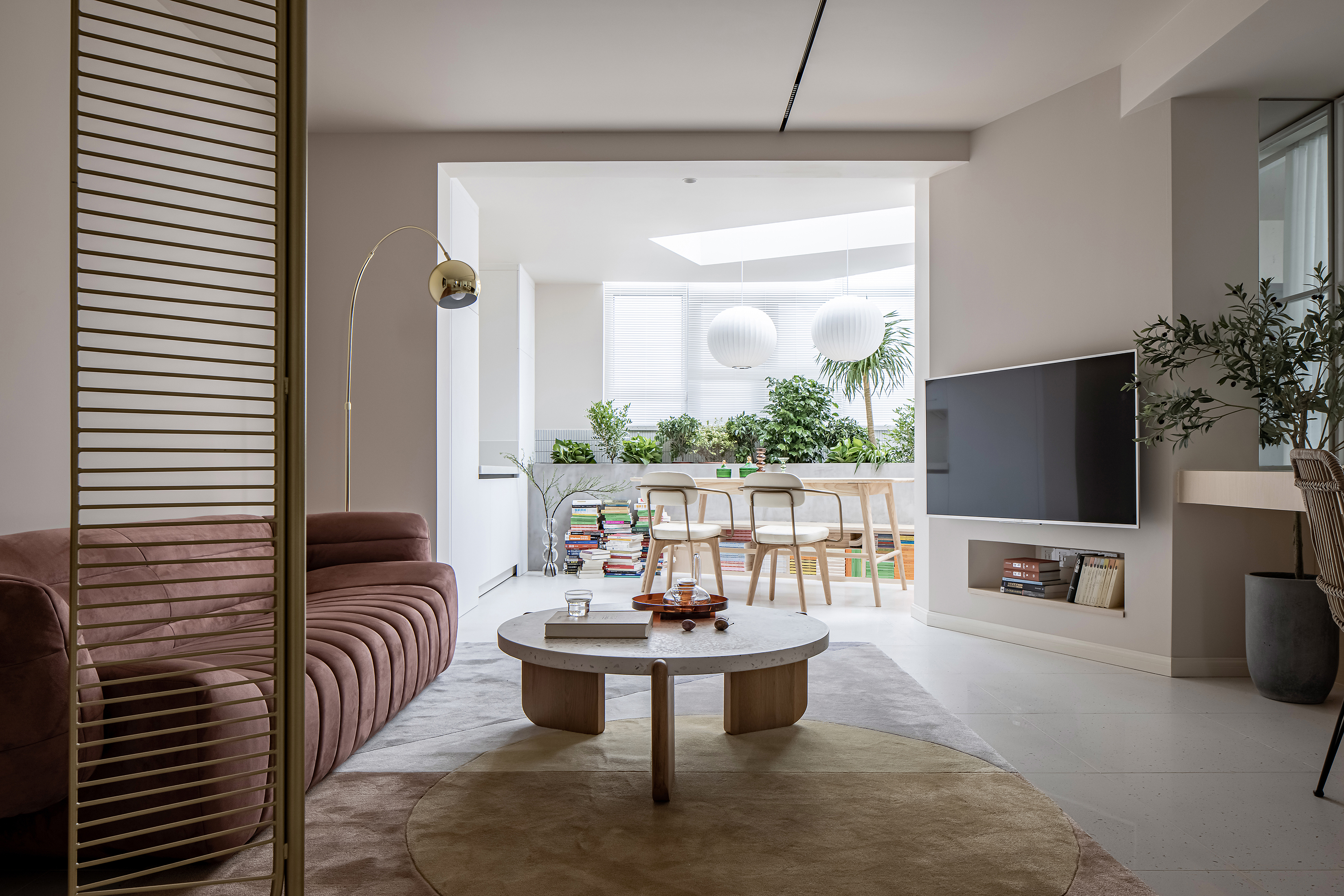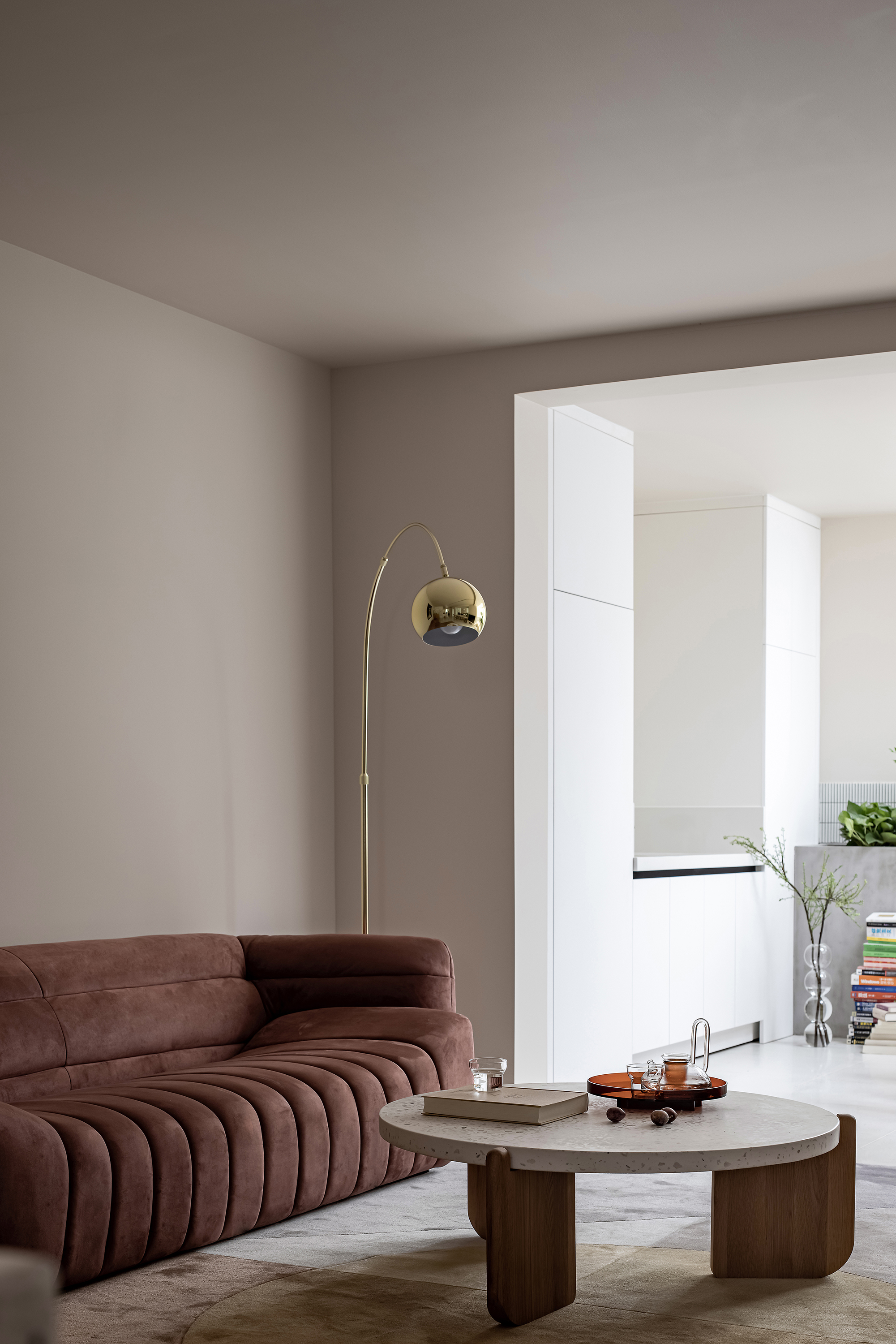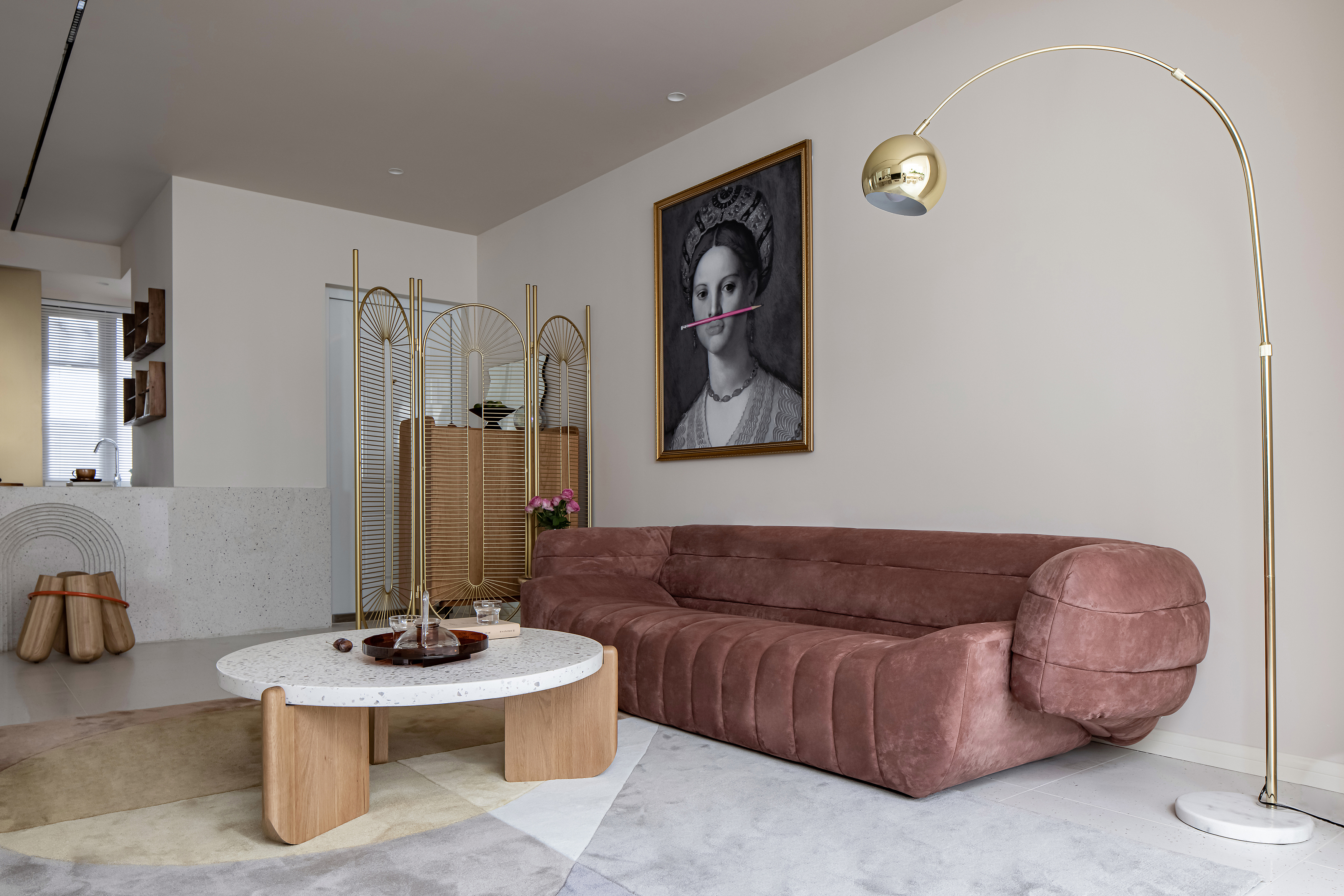 墙顶面使用非常浅的咖色包裹,使用同色系棕色沙发压住画面,地面采用同色系哑光地砖铺设,搭配黄铜屏风与金色落地灯,空间使用复古元素连续穿插,整体使用大地色系制造温柔。