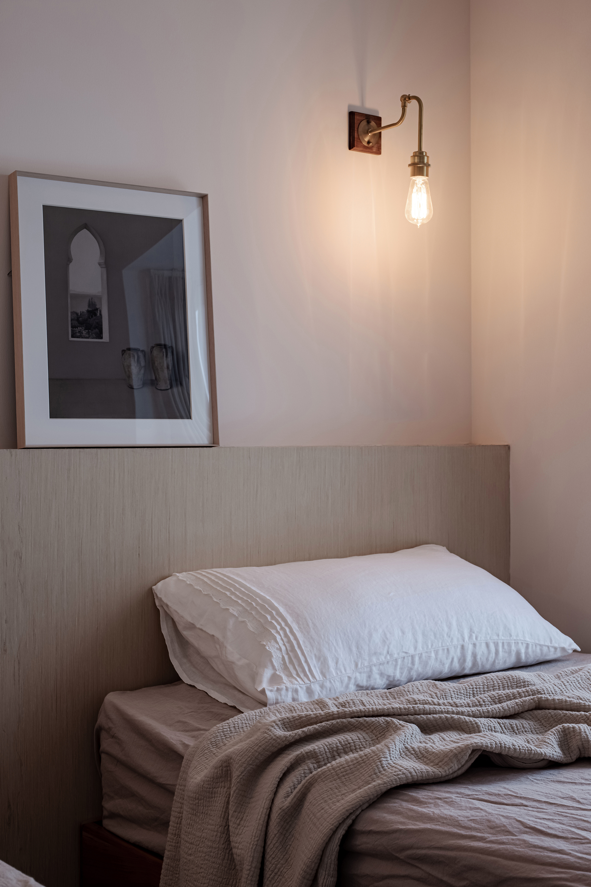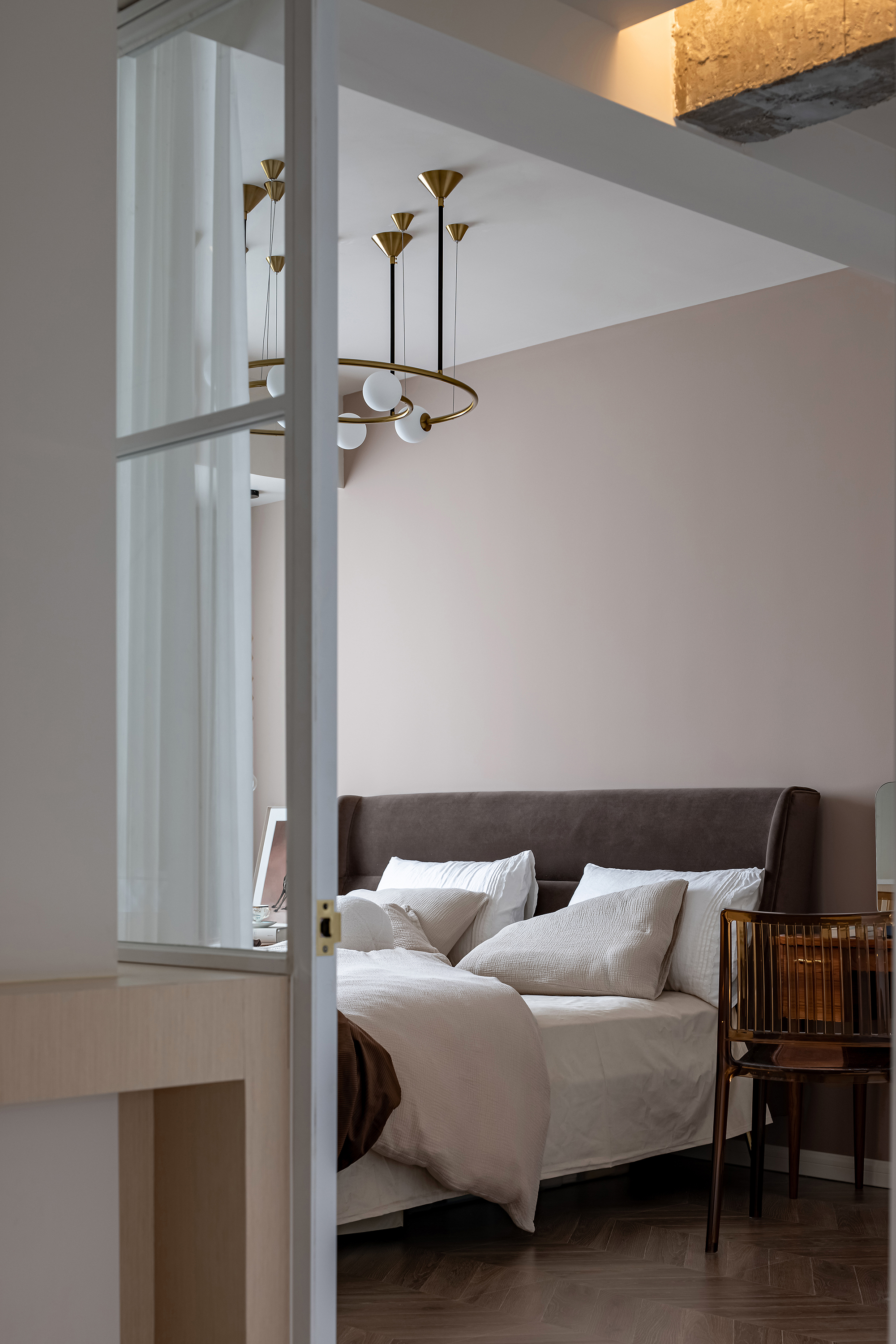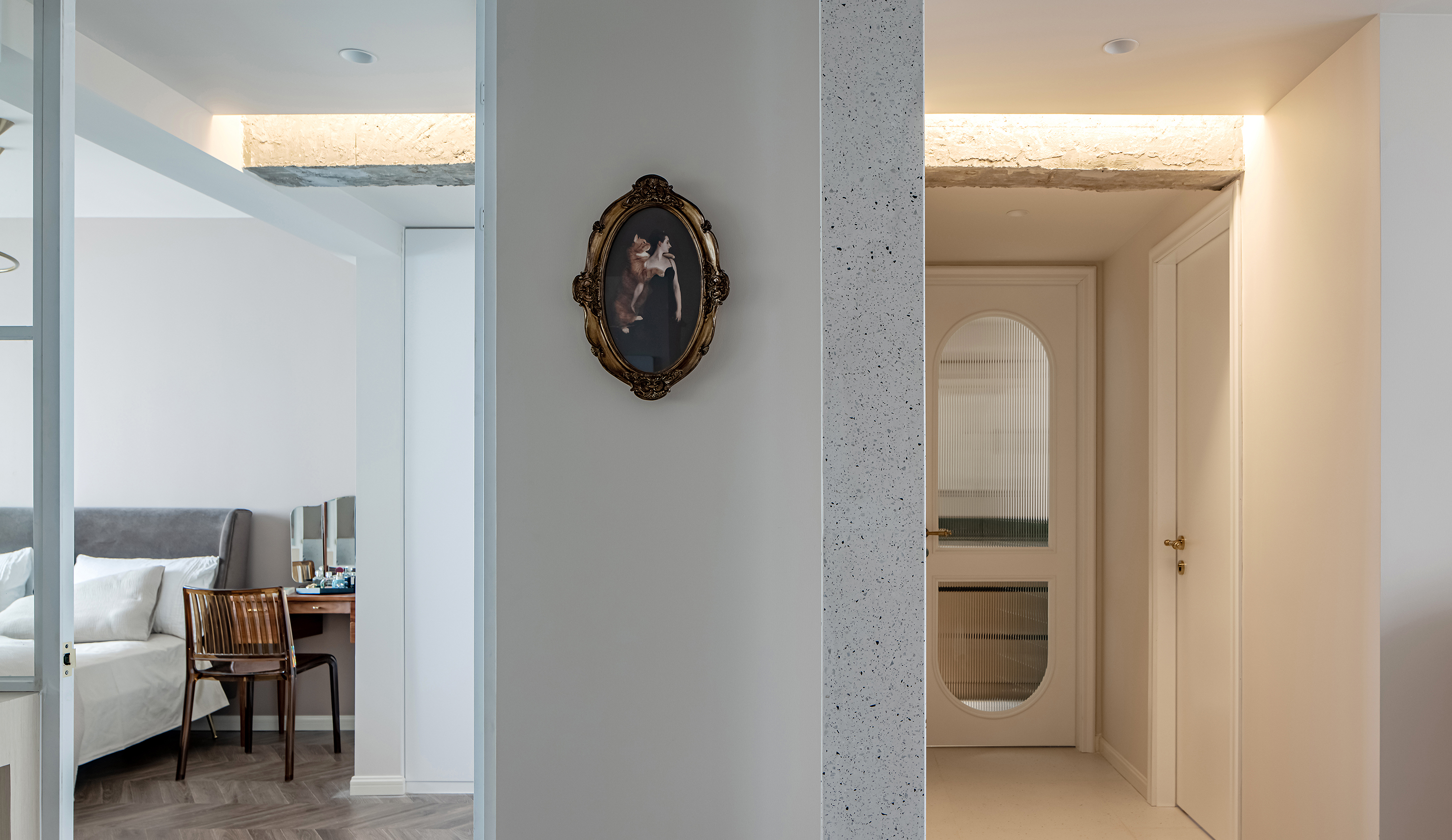 吧台处看向主卧室和过道。原有建筑中梁贯穿了卧室和过道,保留原有粗狂质感,配合灯光,制造出别样之美。