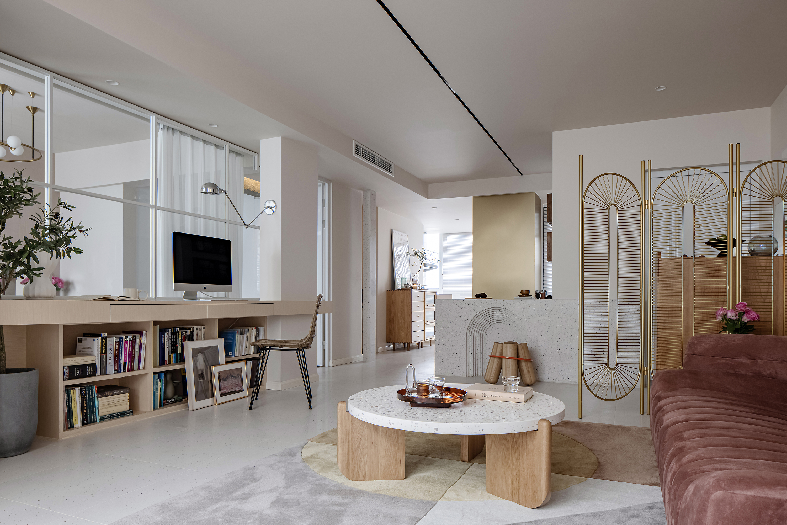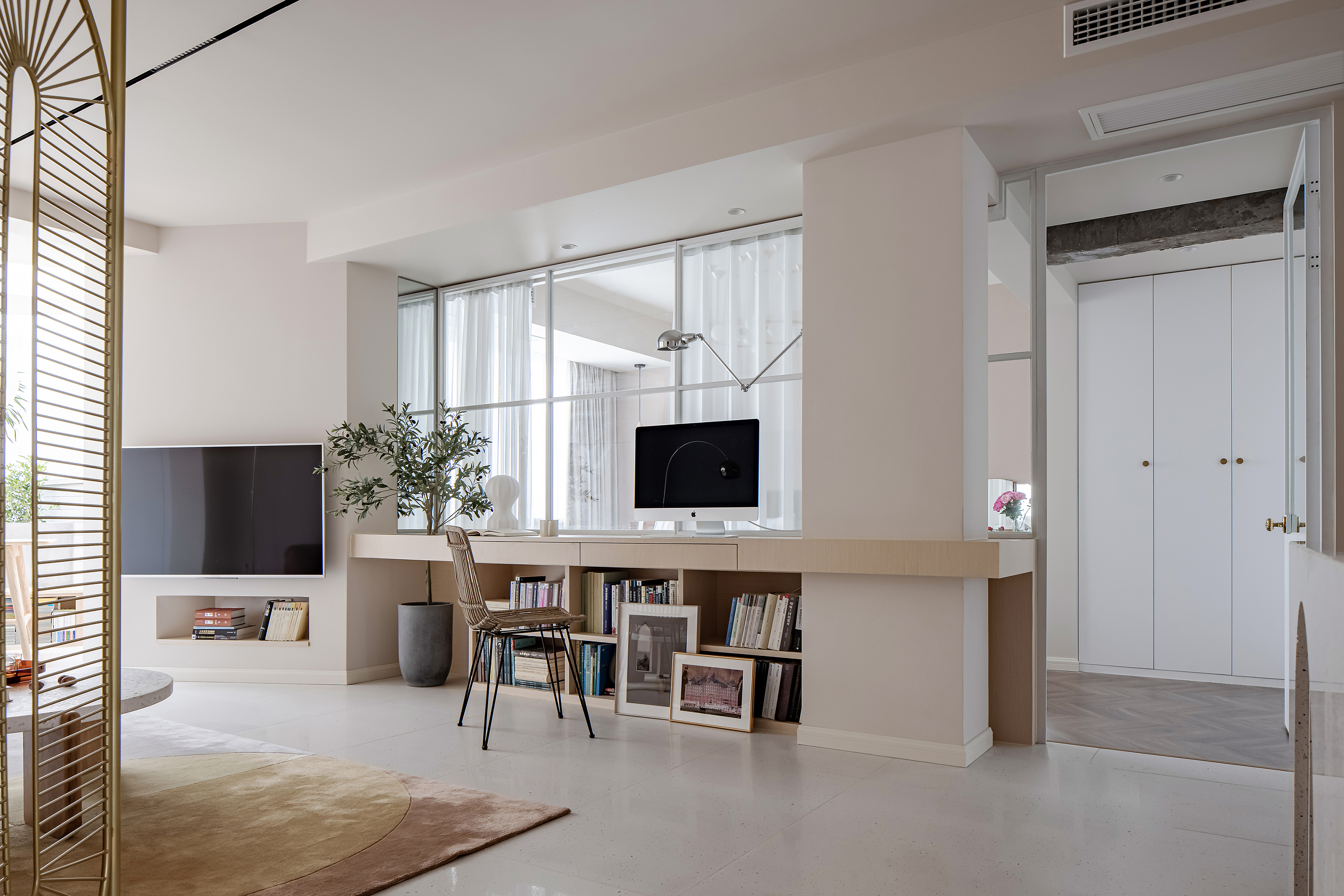 在客厅现场制作可供两人使用的办公写字台,下方用书柜支撑,写字台也起到划分客厅与卧室的功能,弱化电视背景,整体为业主量身打造。