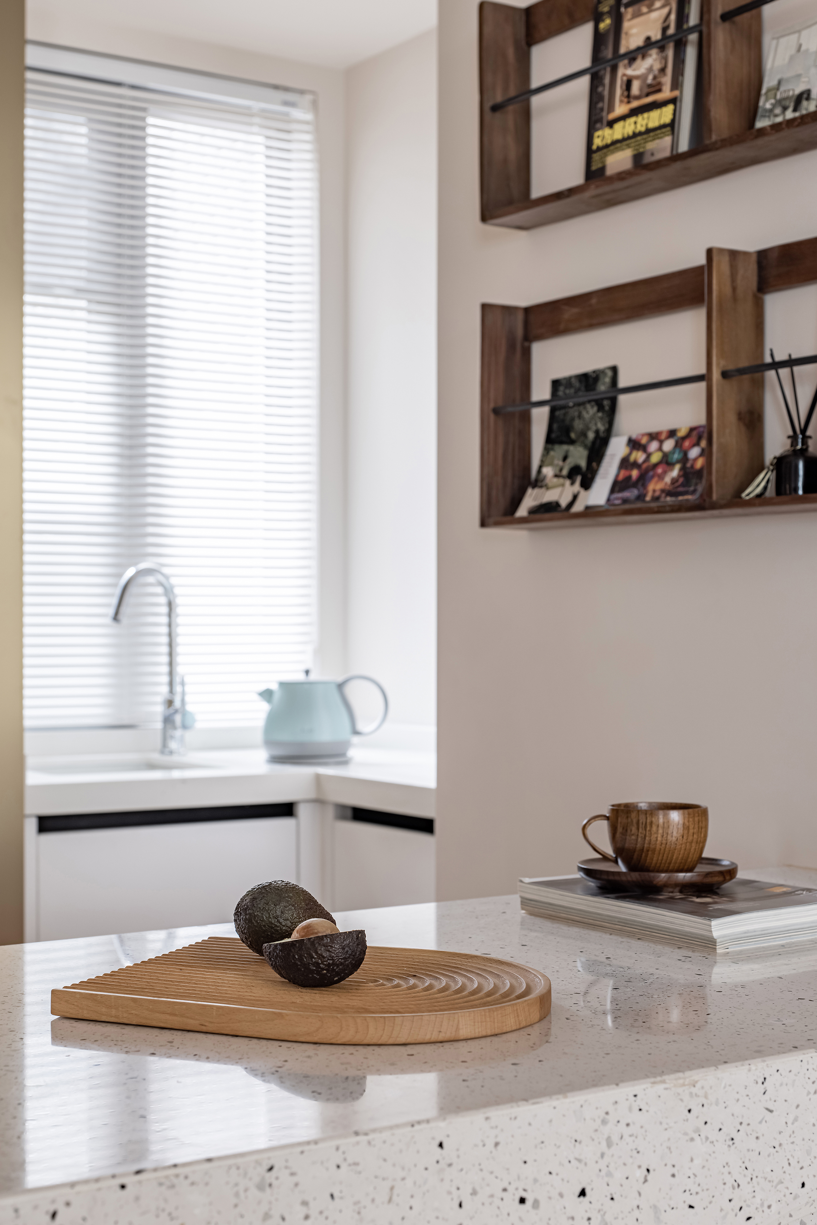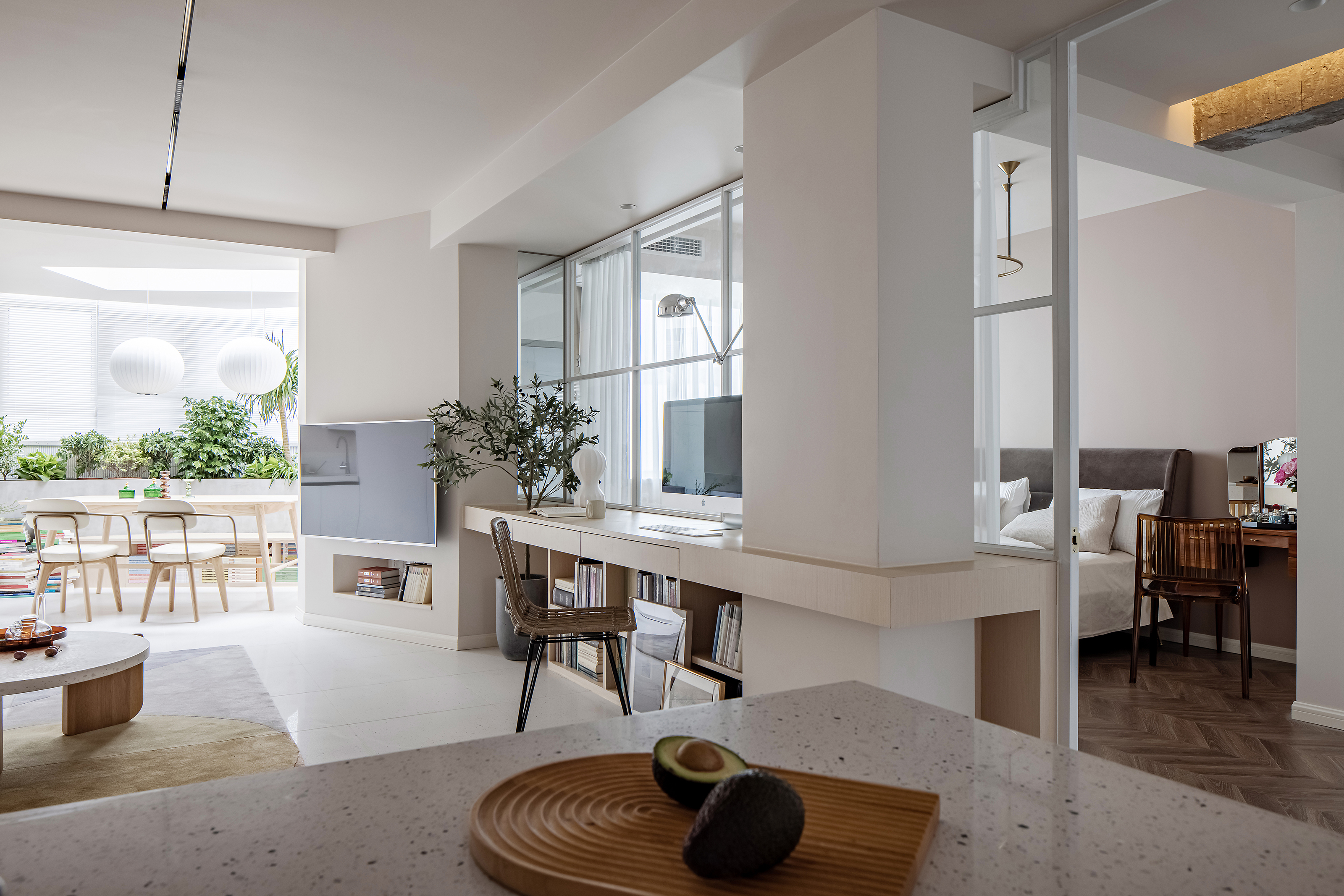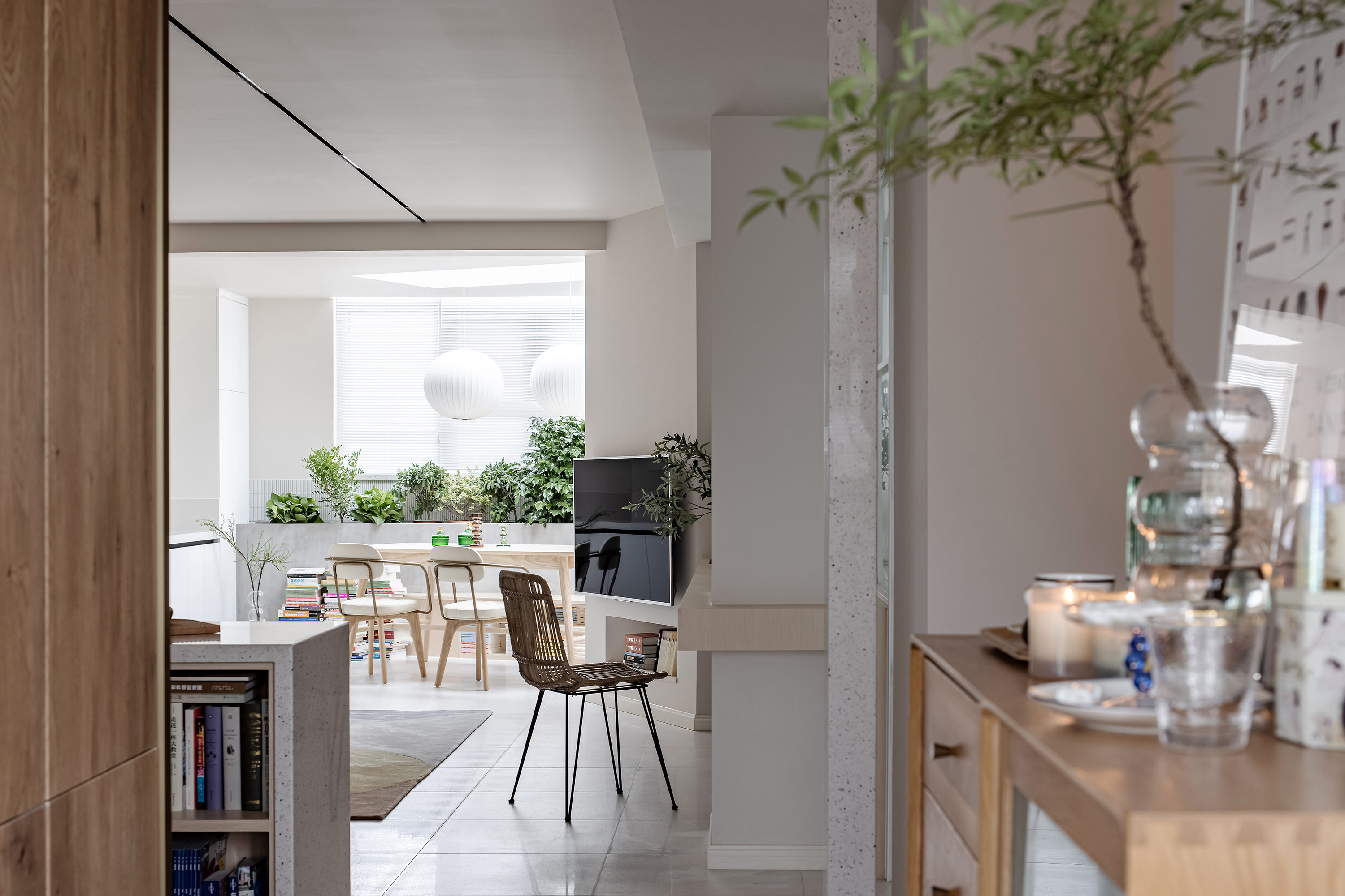 我们从户型分析,原户型中客厅、餐厅、厨房的面积、采光和通风都不是非常的理想,结合业主平时的生活方式和工作学习等具体情况,将每个空间的功能界限模糊化,客厅可会客,可工作;阳台也是餐厅,也可阅读;厨房可烹饪也可就餐。给我们的生活多样且自由。 -