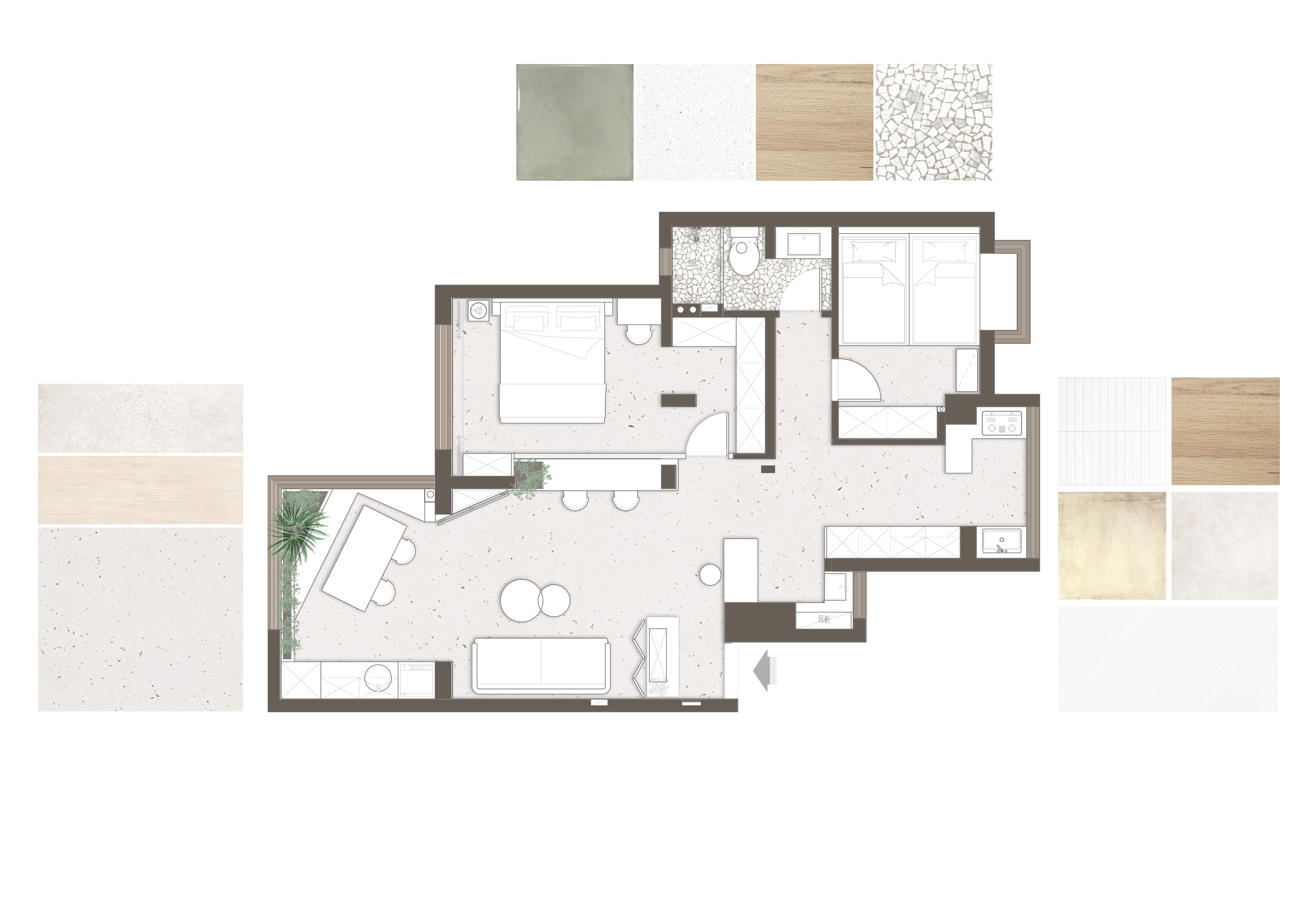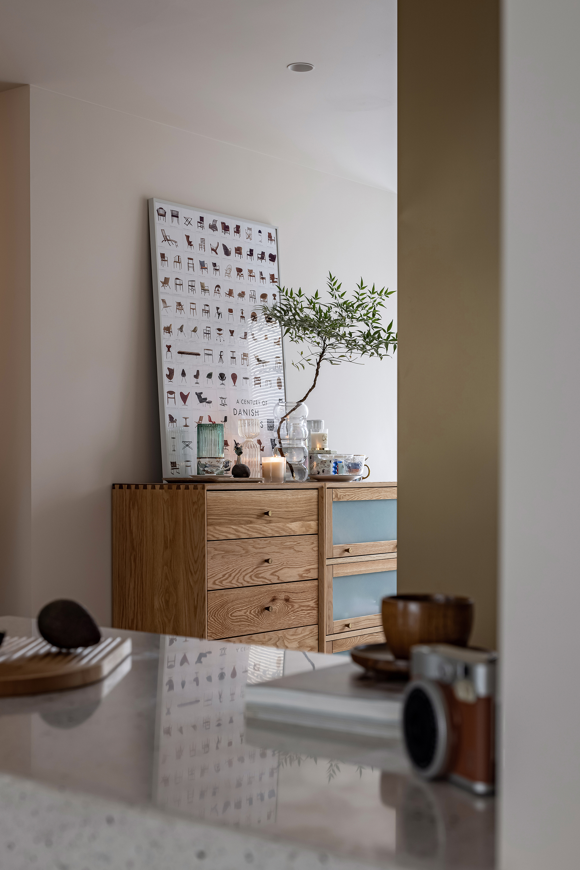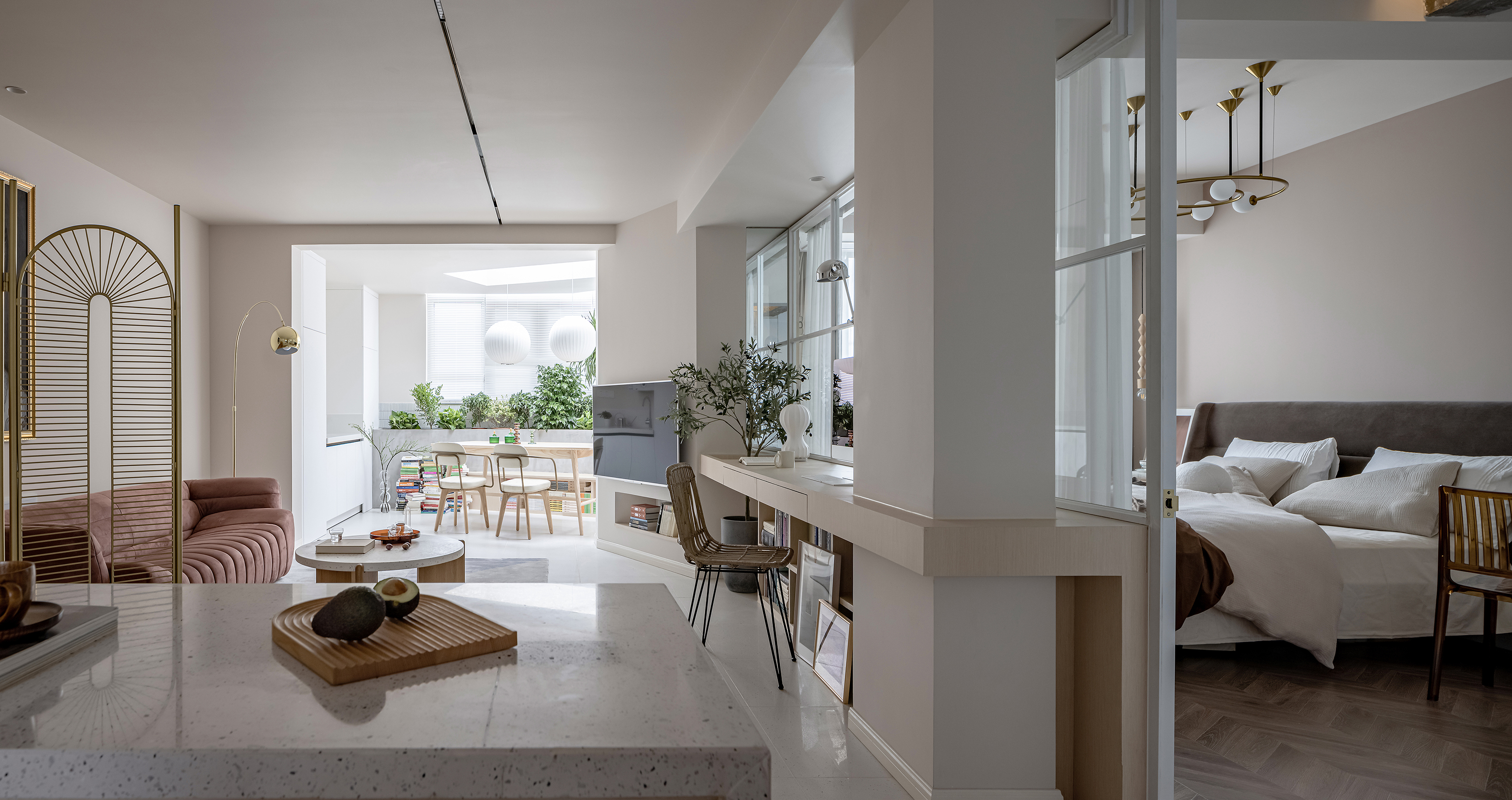 我们从户型分析,原户型中客厅、餐厅、厨房的面积、采光和通风都不是非常的理想,结合业主平时的生活方式和工作学习等具体情况,将每个空间的功能界限模糊化,客厅可会客,可工作;阳台也是餐厅,也可阅读;厨房可烹饪也可就餐。给我们的生活多样且自由。 -