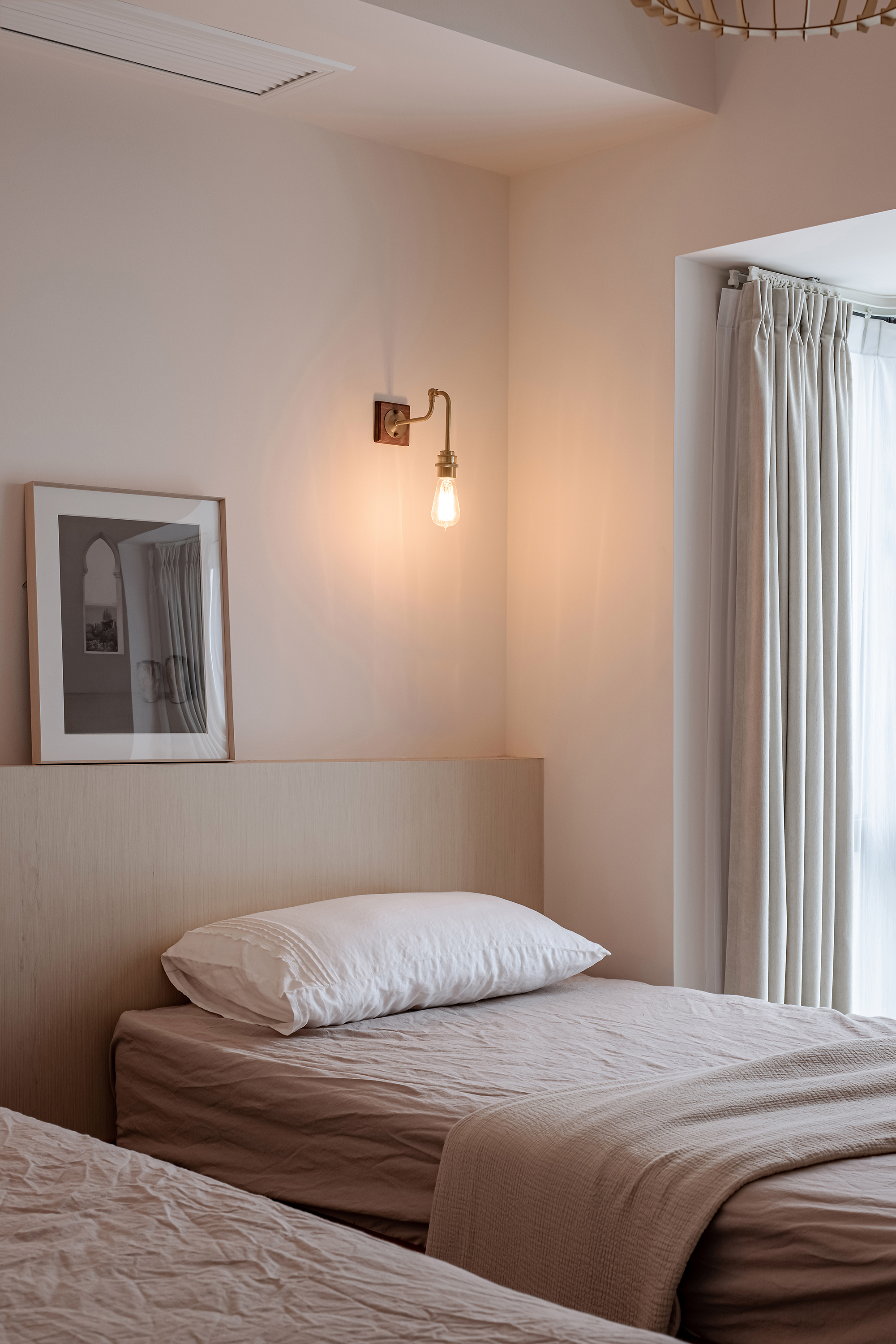 次卧室采用双单人床设计,方便父母偶尔来住时可分床休息,平时也可二床合一,业主可在此观看投影。