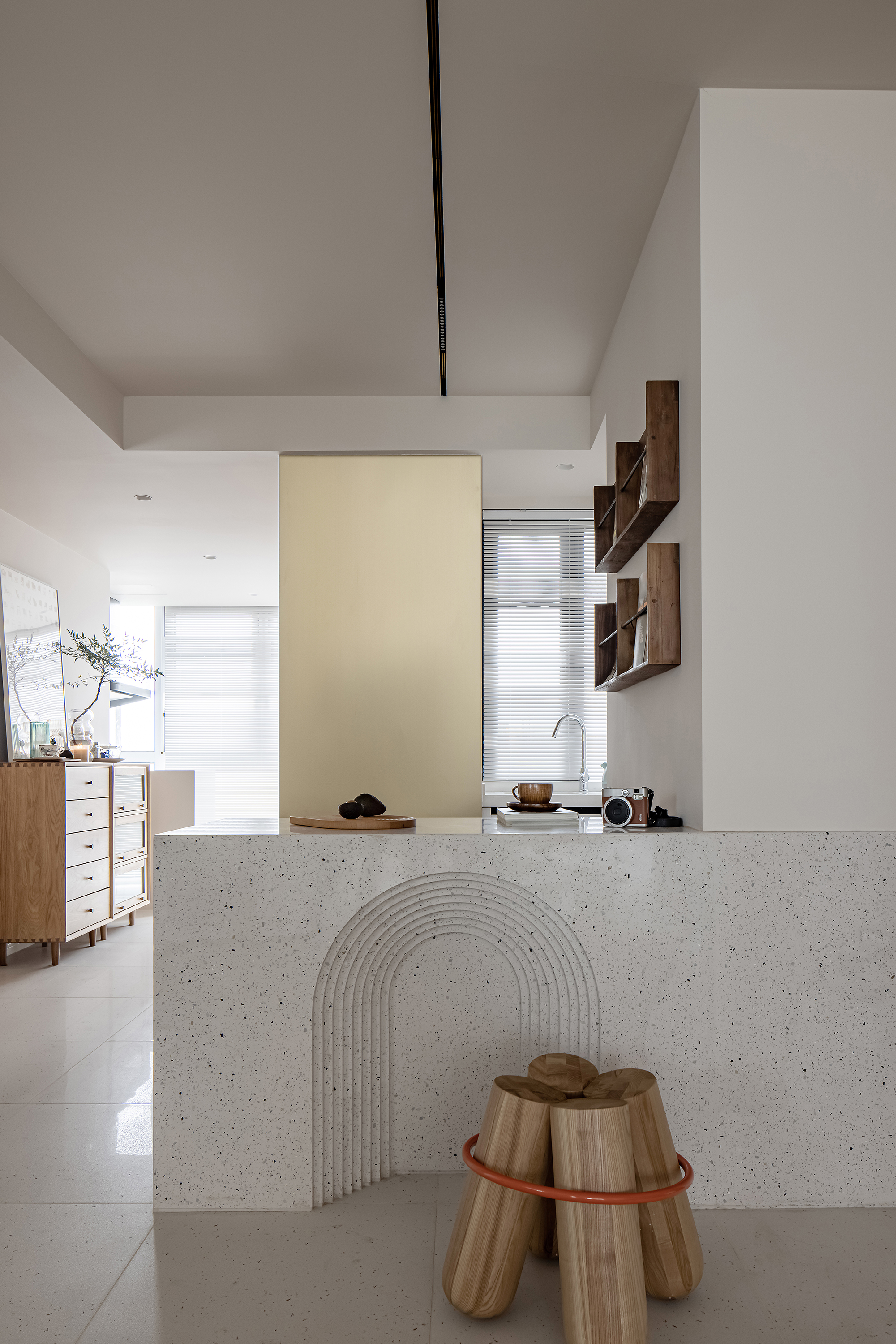 水吧台采用水磨石一体化造型台面及侧板,立面内凹多层拱形,满足美观同时亦可为矮凳提供放脚区域,矮凳可兼做换鞋凳,吧台背景使用金色铜板包墙和整个空间进行呼应。