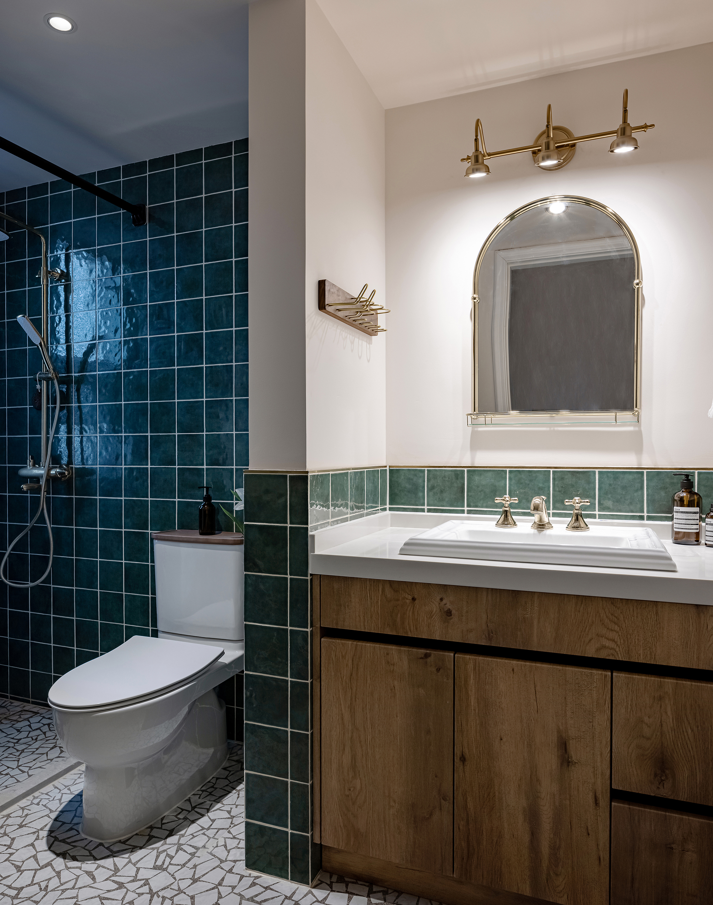 卫生间选用墨绿色小方砖和金色五金件进行搭配,温馨古典。