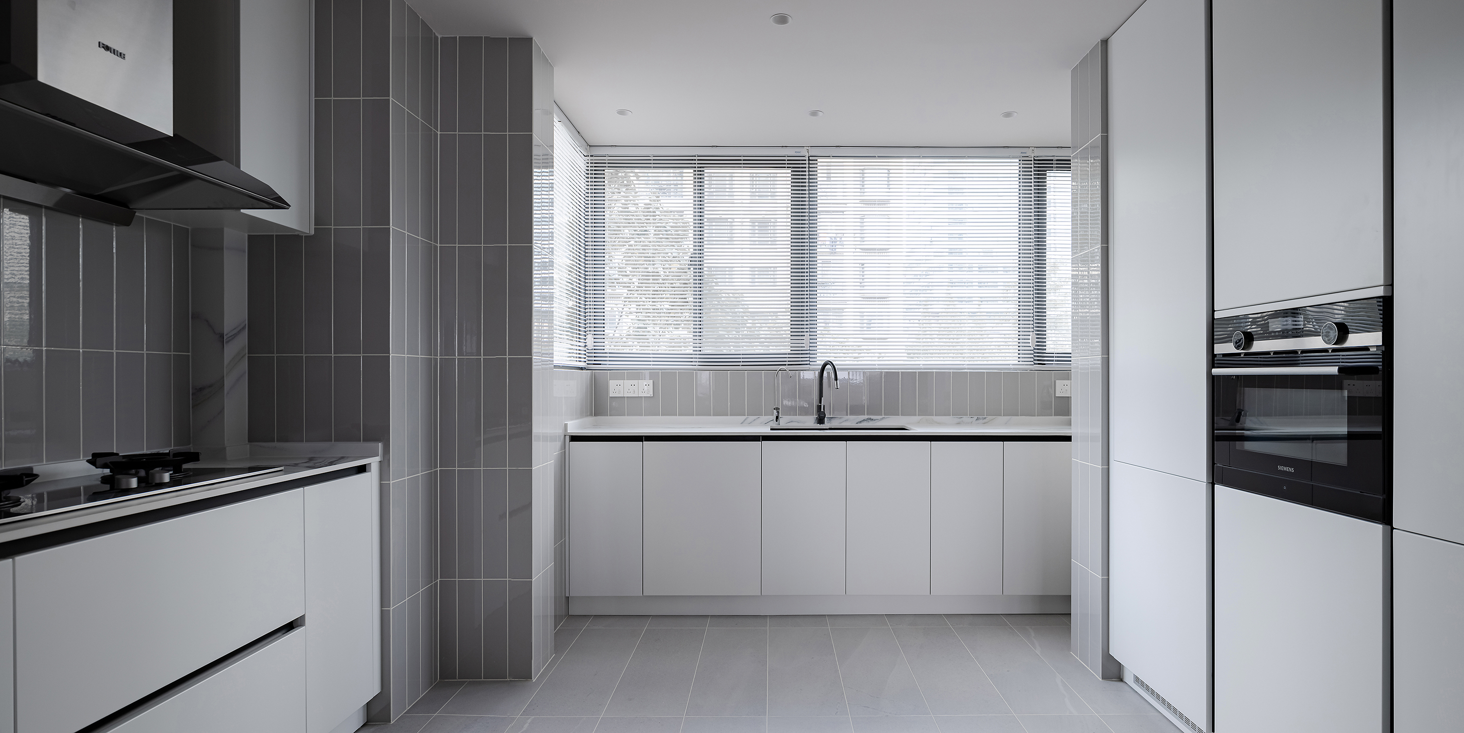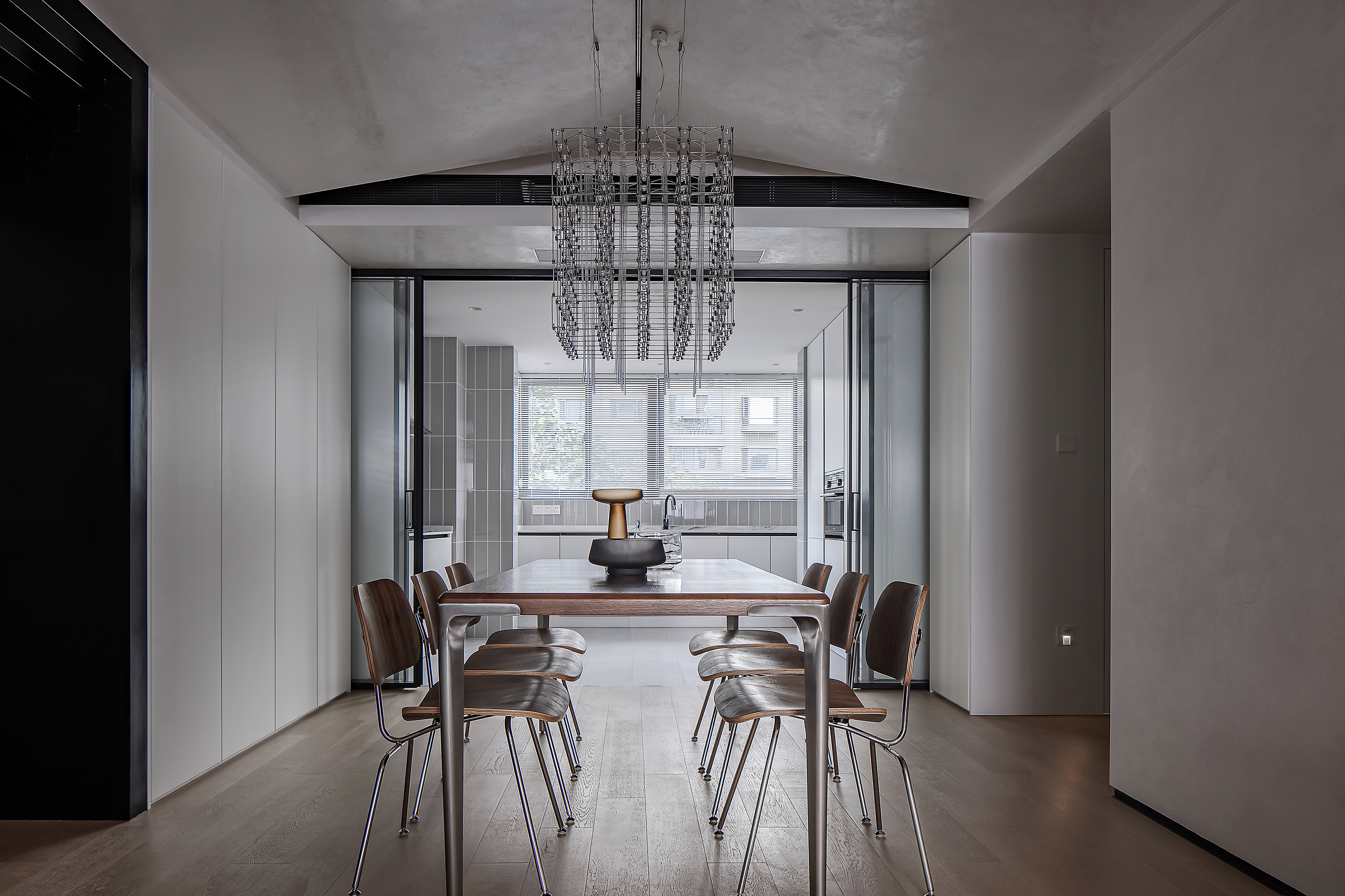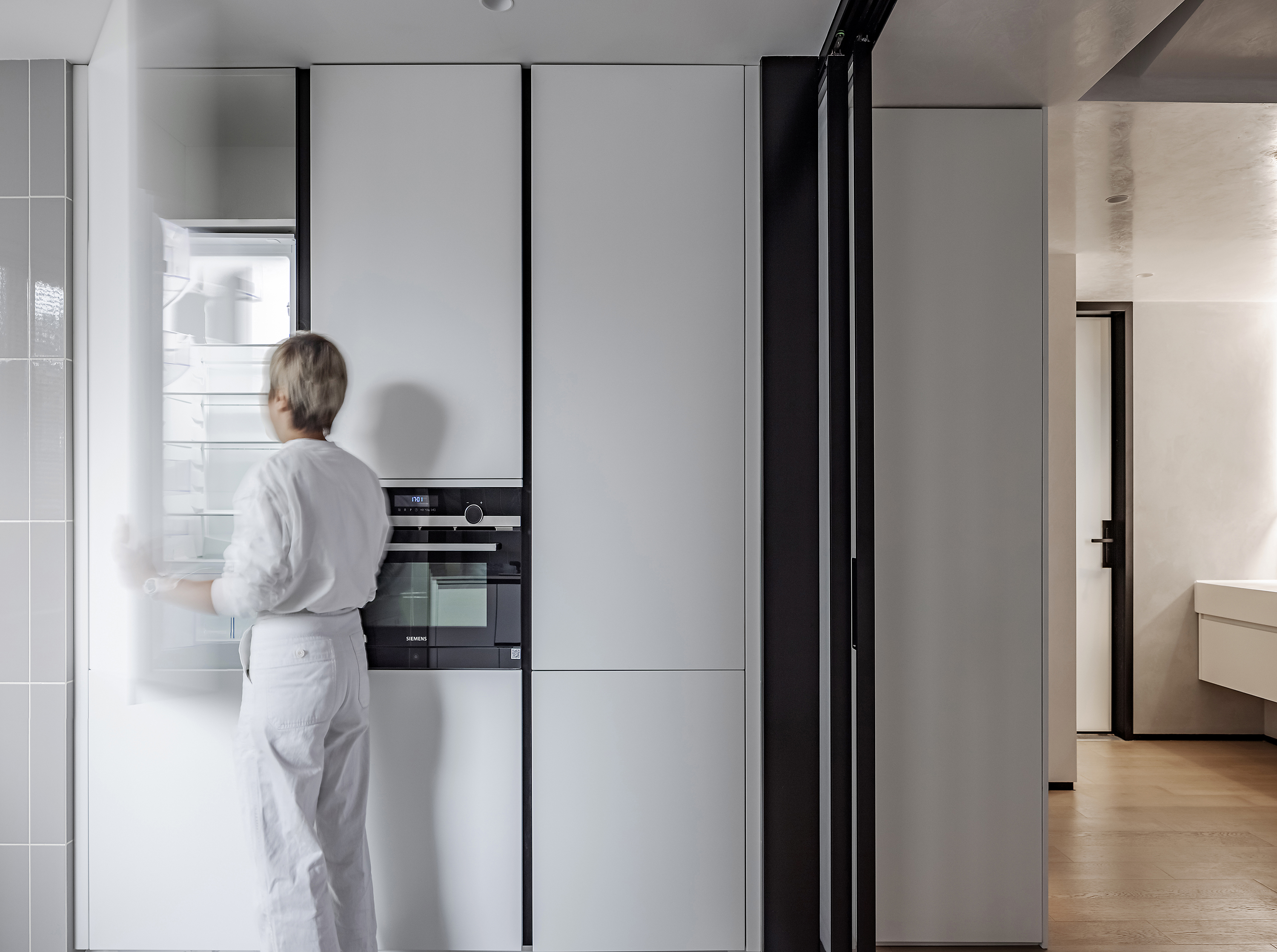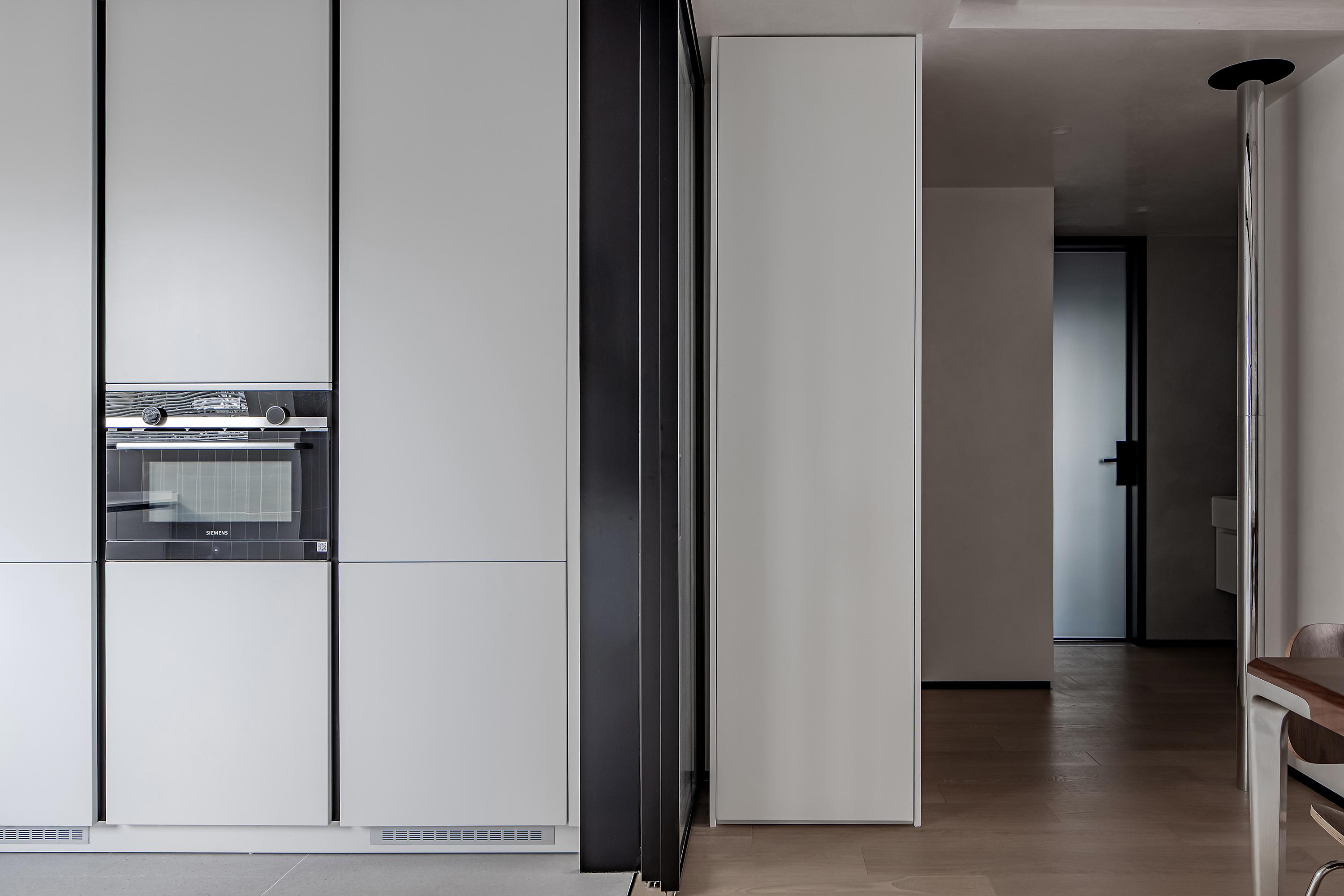 餐厅看向厨房。左侧为定制的鞋柜衣柜,黑色区域为入户门边框。厨房采用窄框同步移门,增加开启范围,有开放式厨房的体验,也保留关上后隔绝油烟的功能。