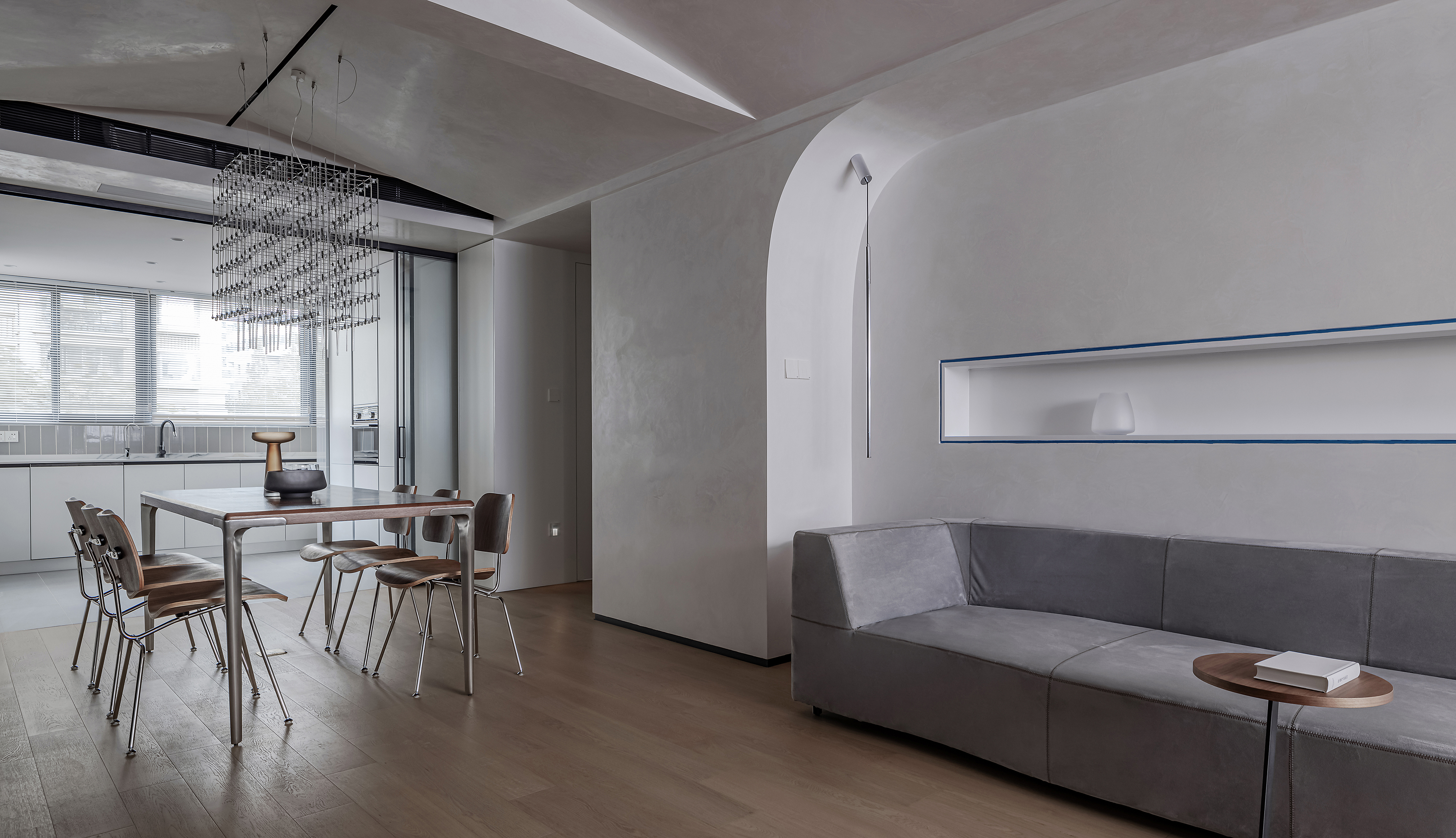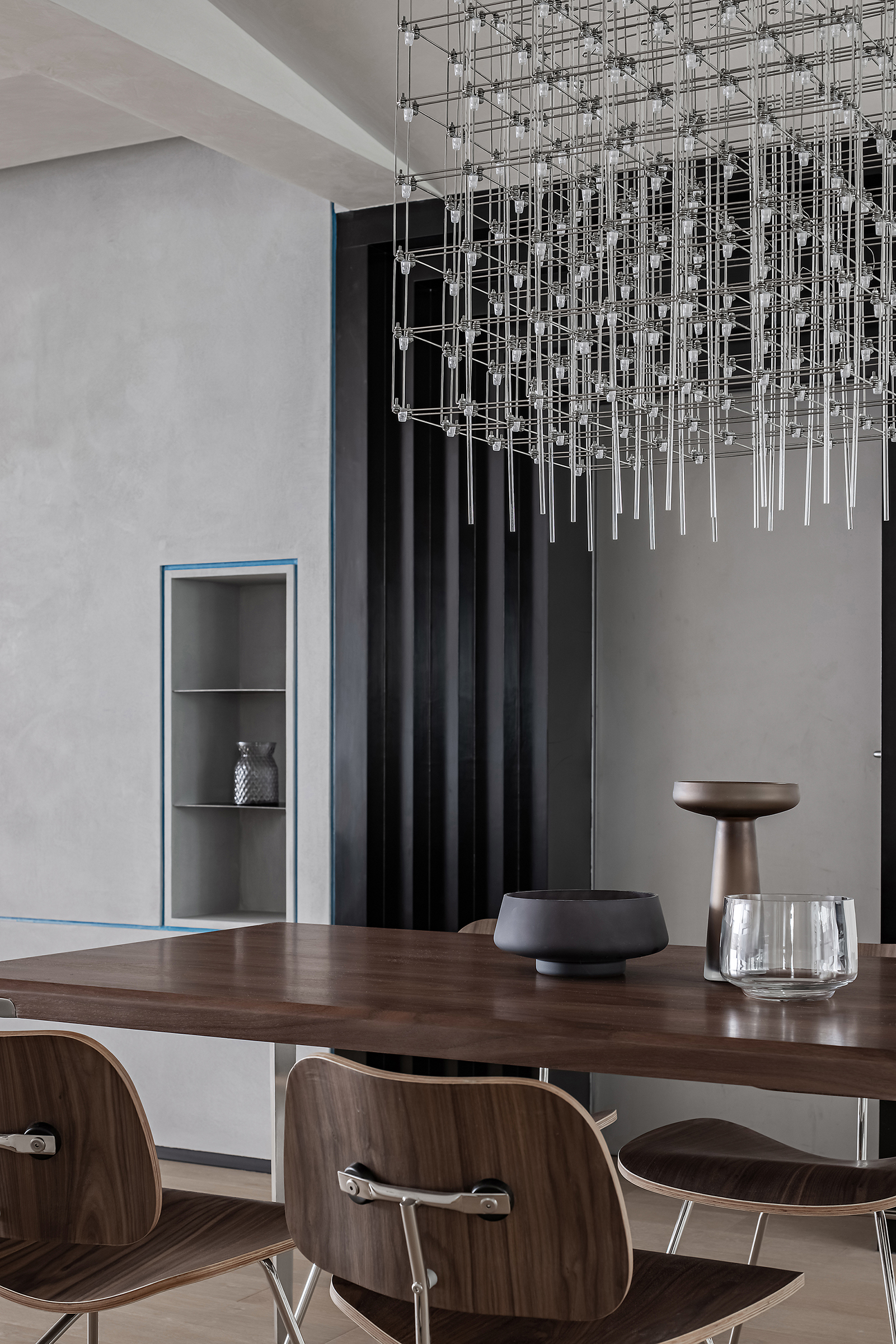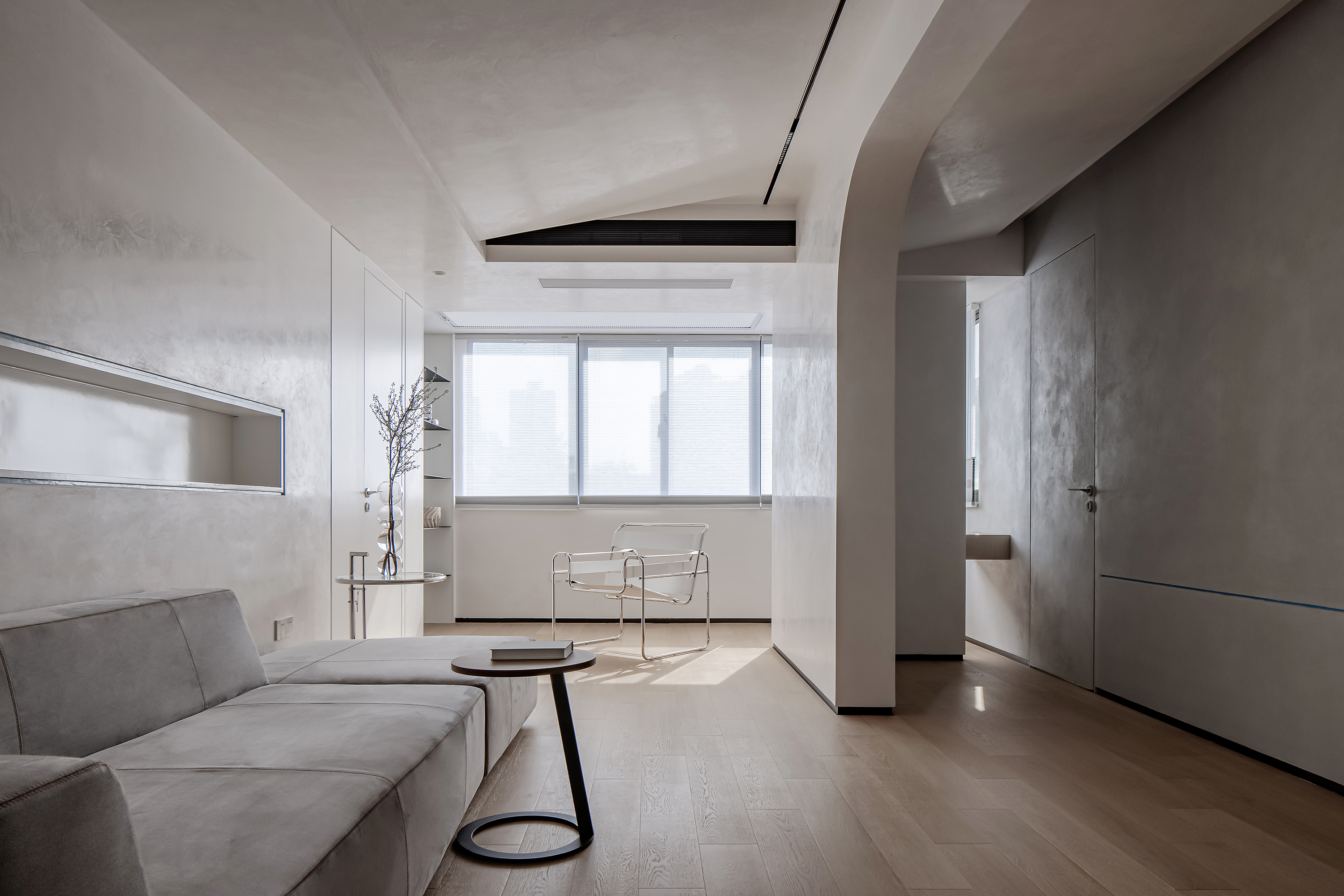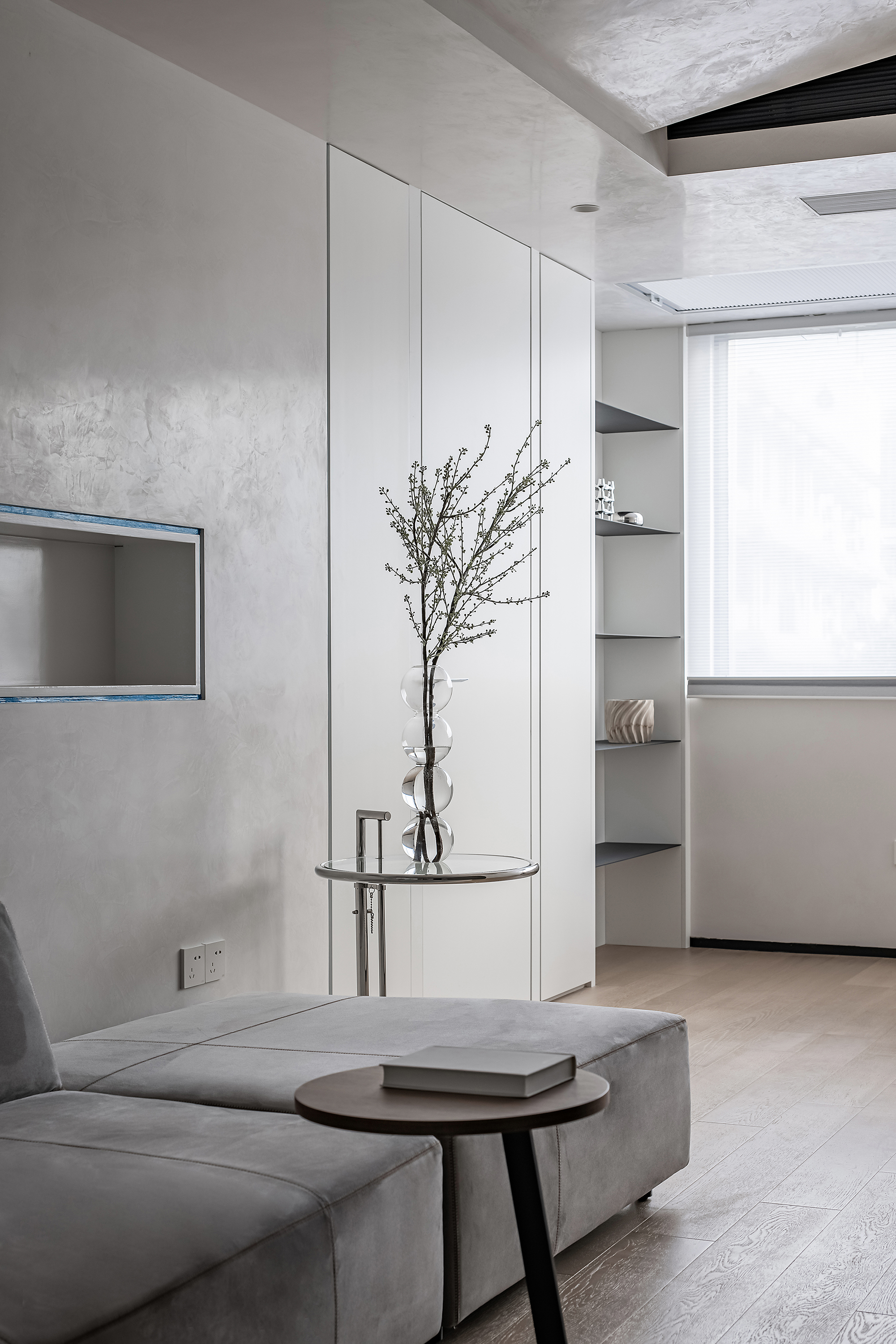 客厅整体色系控制为统一,去除对比,灰色、白色、木色、铬色交叉出现,彼此包容、平衡。全屋客餐厅区域采用内凹黑色金属踢脚线,增加细节处理。