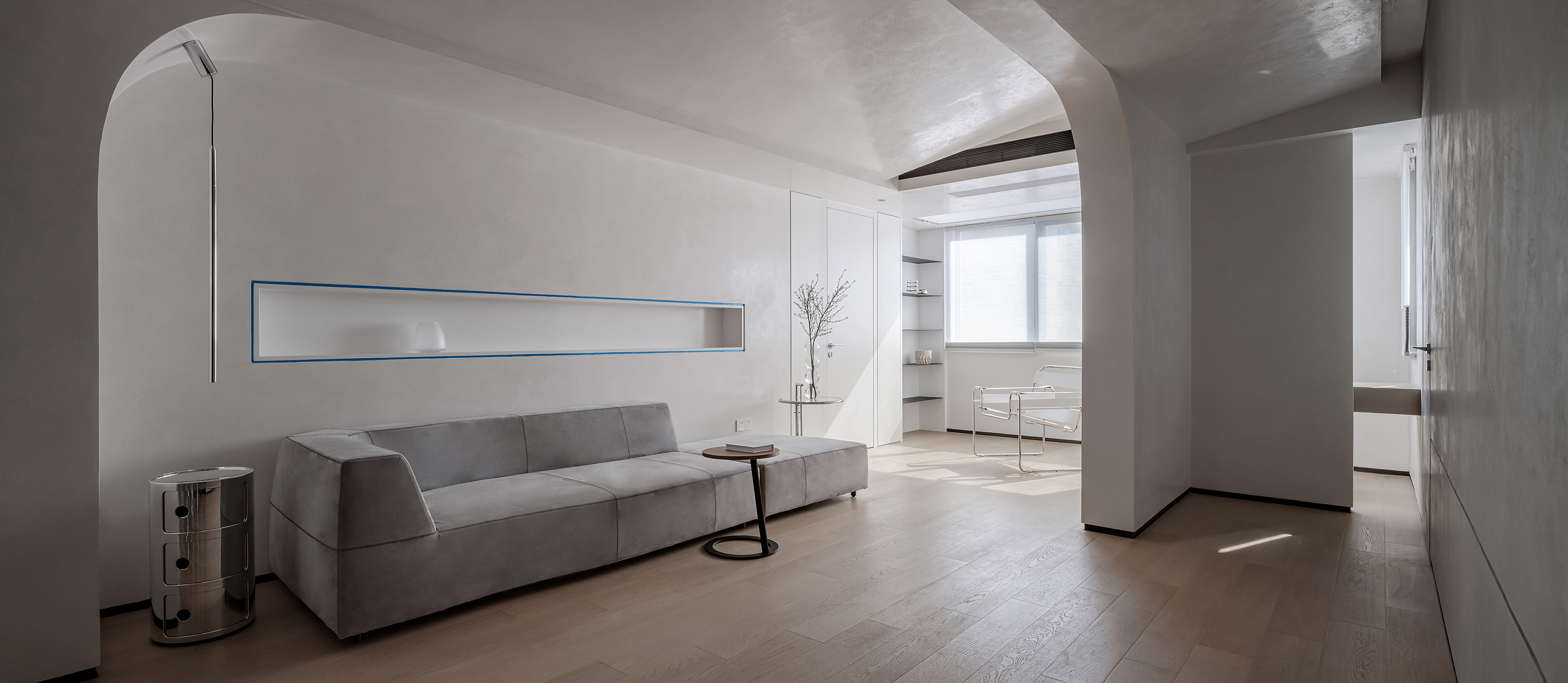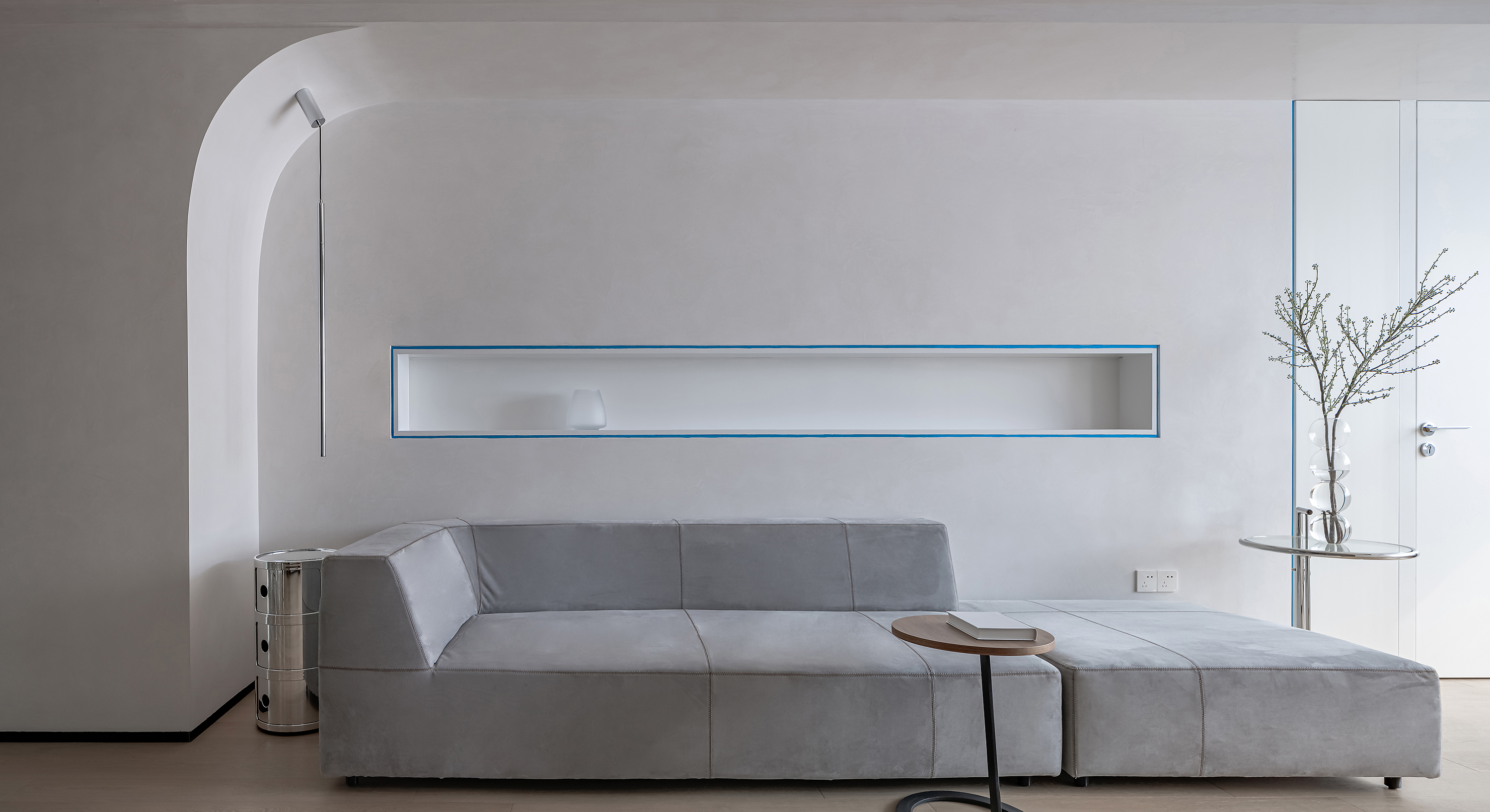 沙发墙面,铬色、白色、灰色,少量的蓝色。壁龛内也暗藏线性灯光。