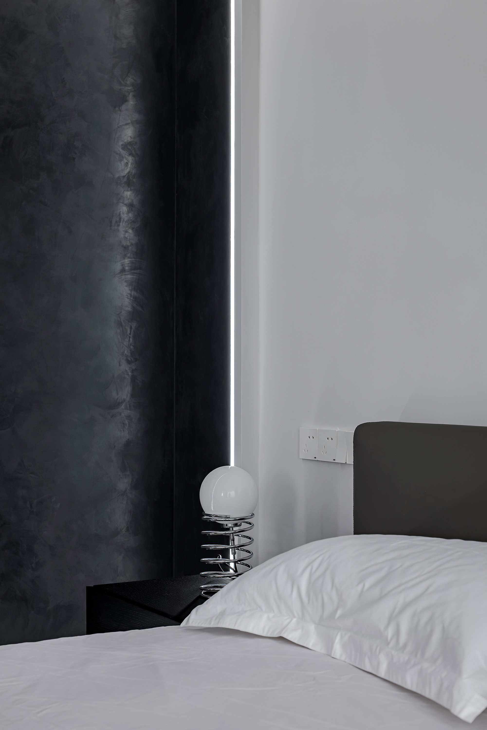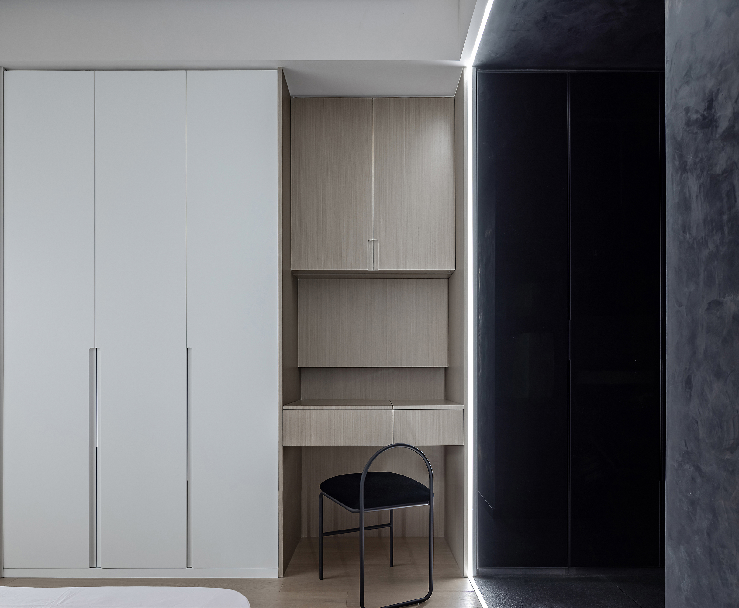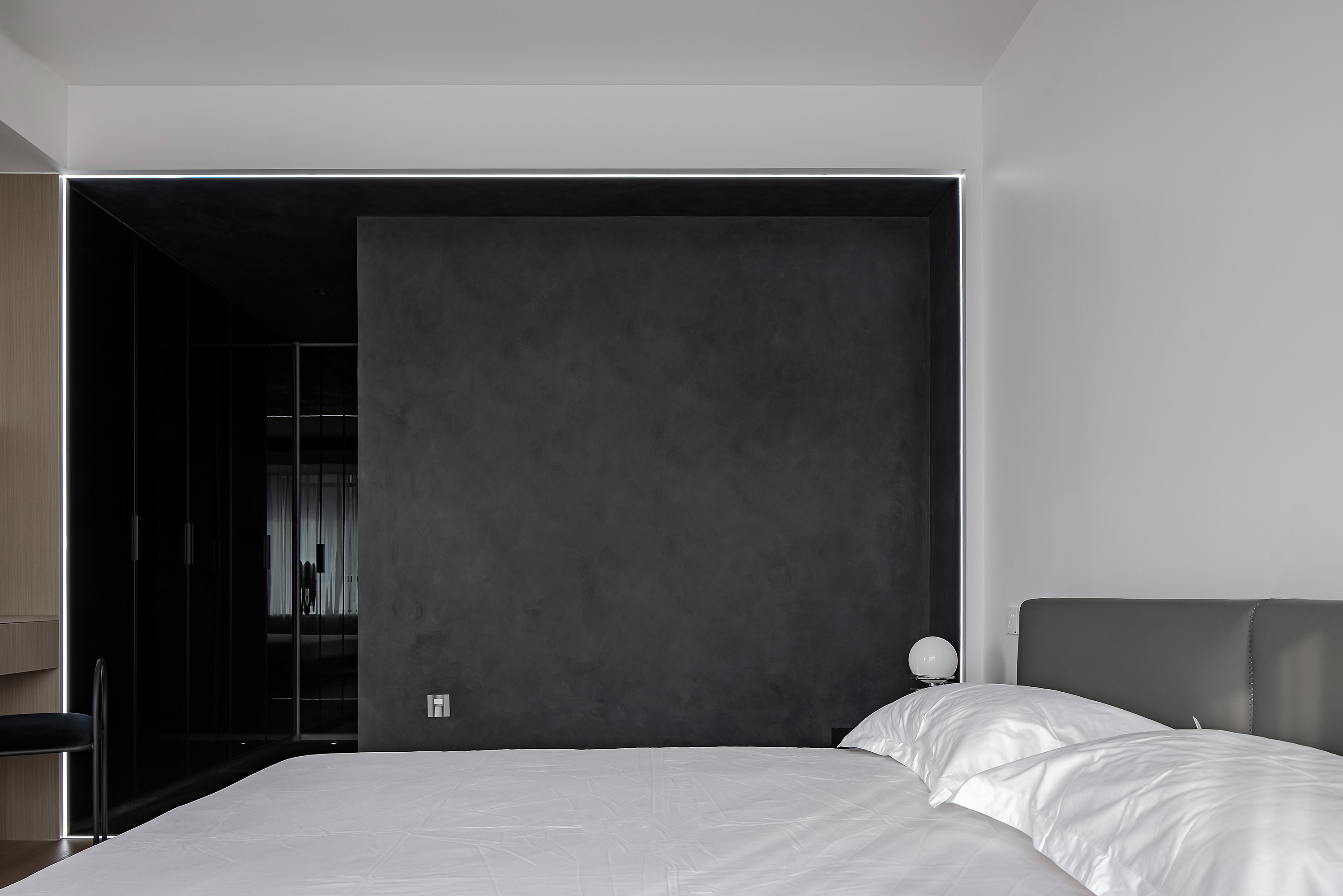 主卧和通往卫生间的过道处理上,通过黑白色彩的强烈对比,色块分界处嵌入可调色温和亮度的线性光源,和整体氛围协调,时尚现代。