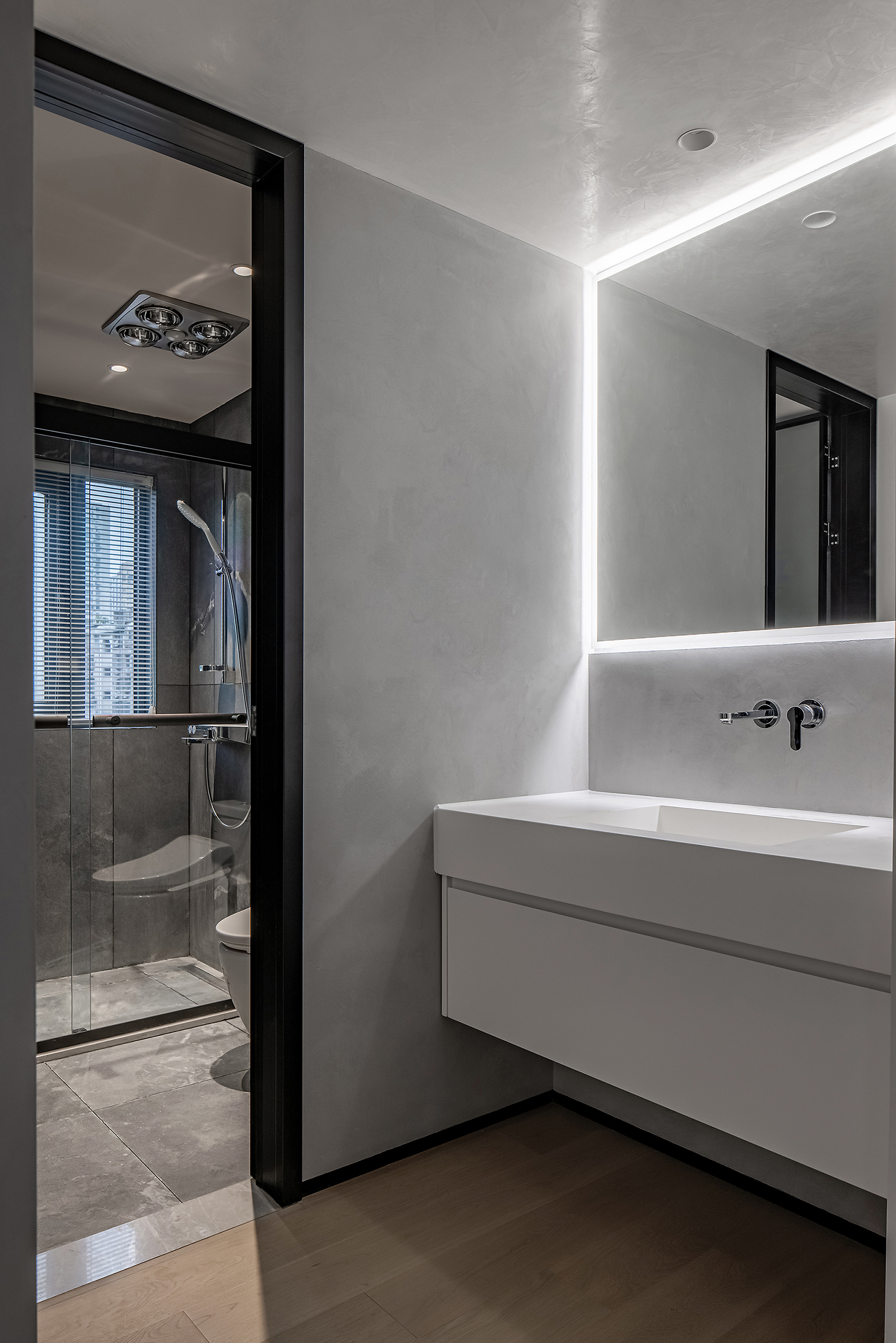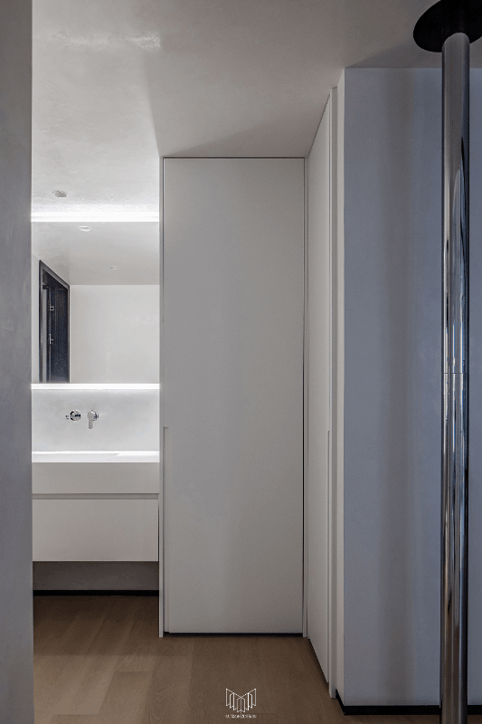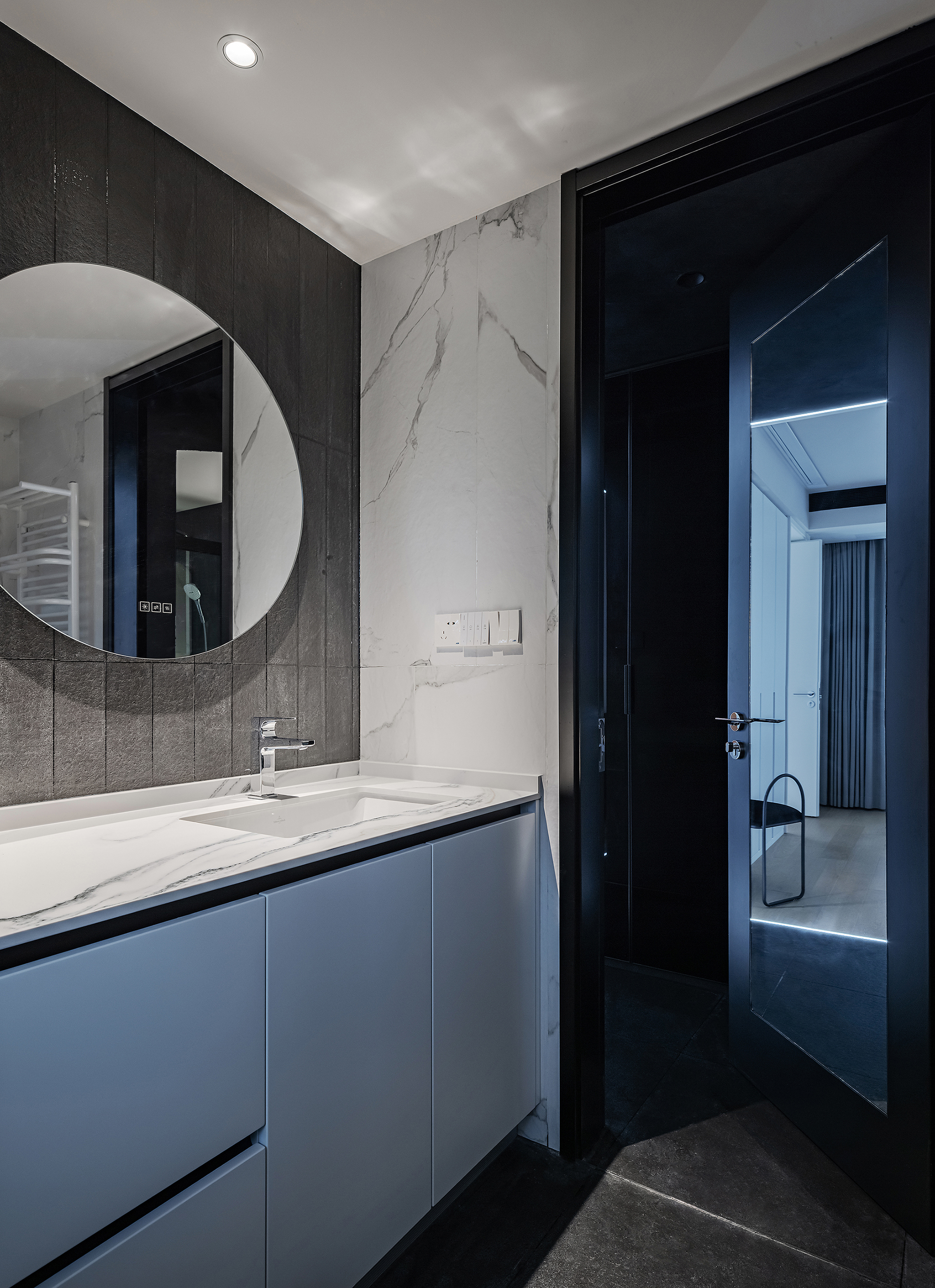 主卧和通往卫生间的过道处理上,通过黑白色彩的强烈对比,色块分界处嵌入可调色温和亮度的线性光源,和整体氛围协调,时尚现代。