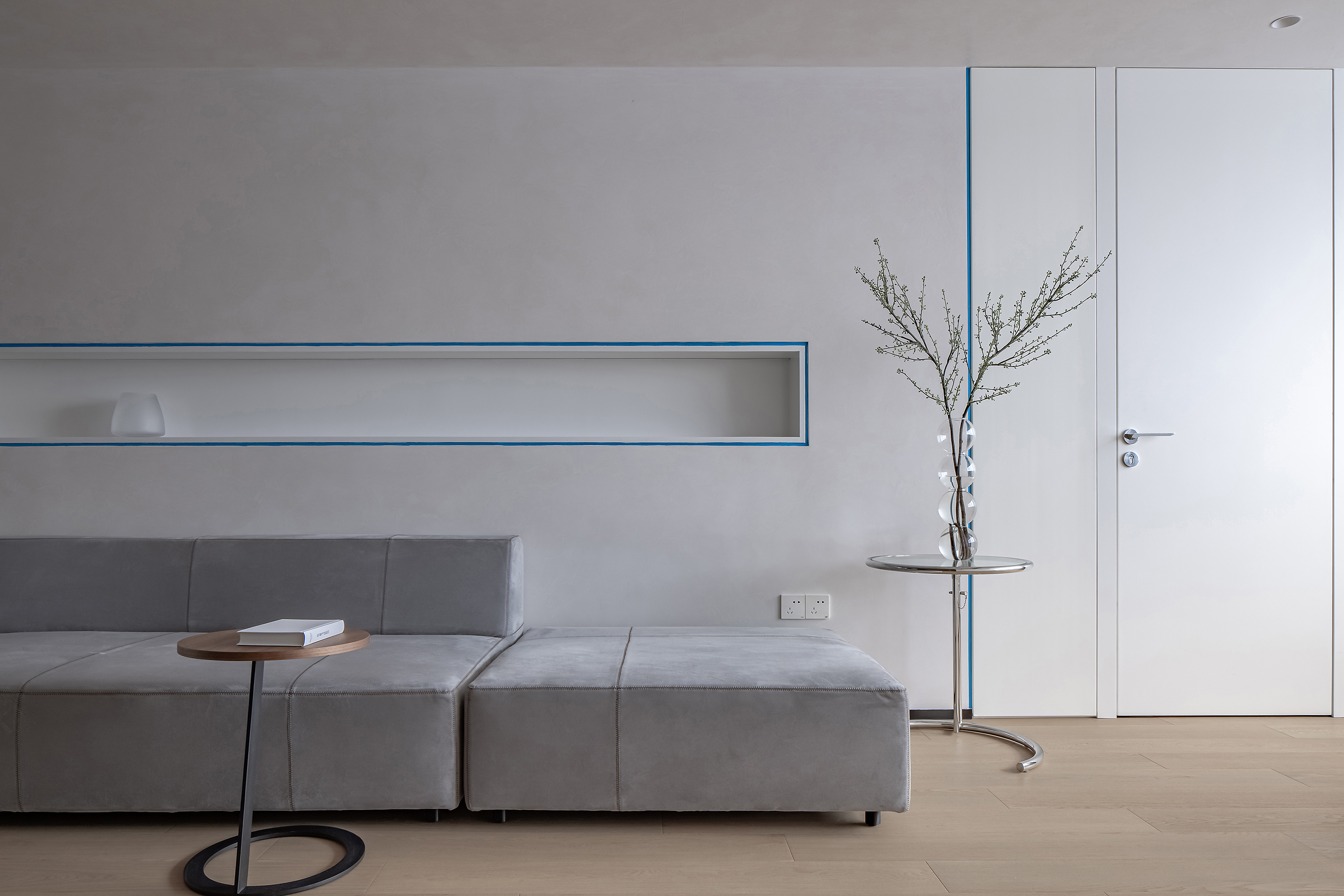 客厅沙发墙面和主卧门处理为统一立面,整体中有细节。蓝色脱缝勾勒处壁龛和柜体边界。脱缝处理也是为了处理两种材质之间的平面对接关系。