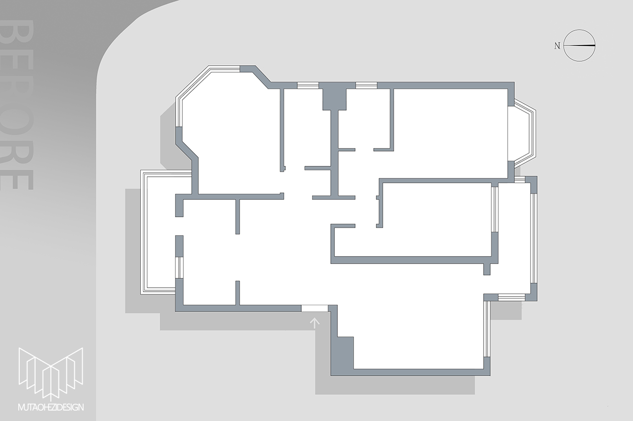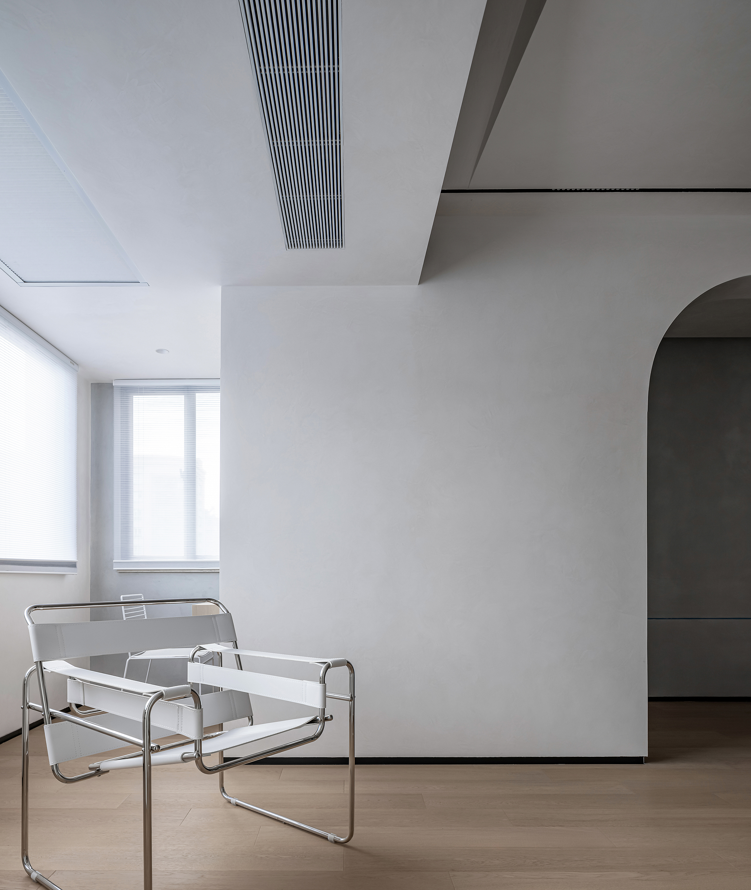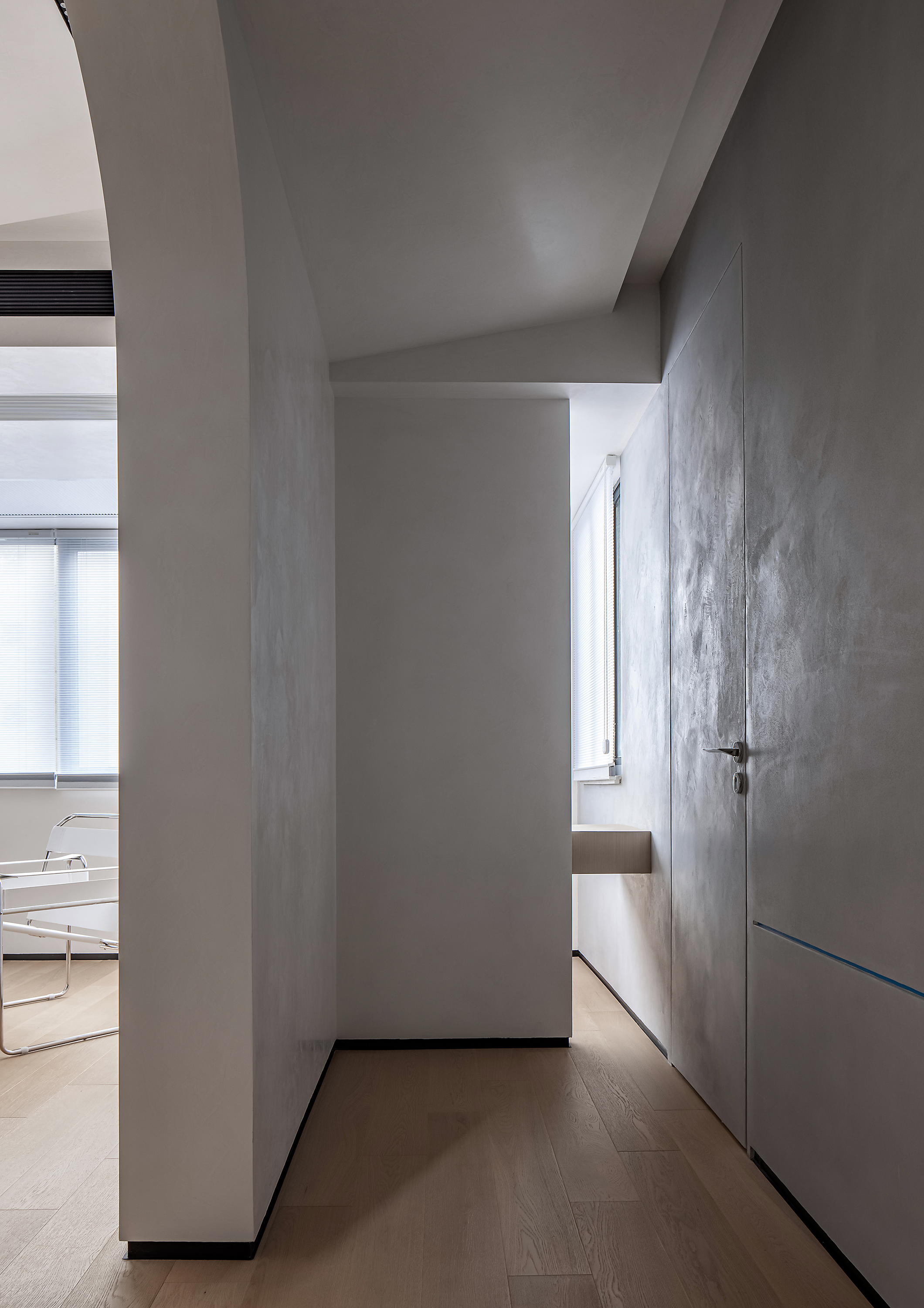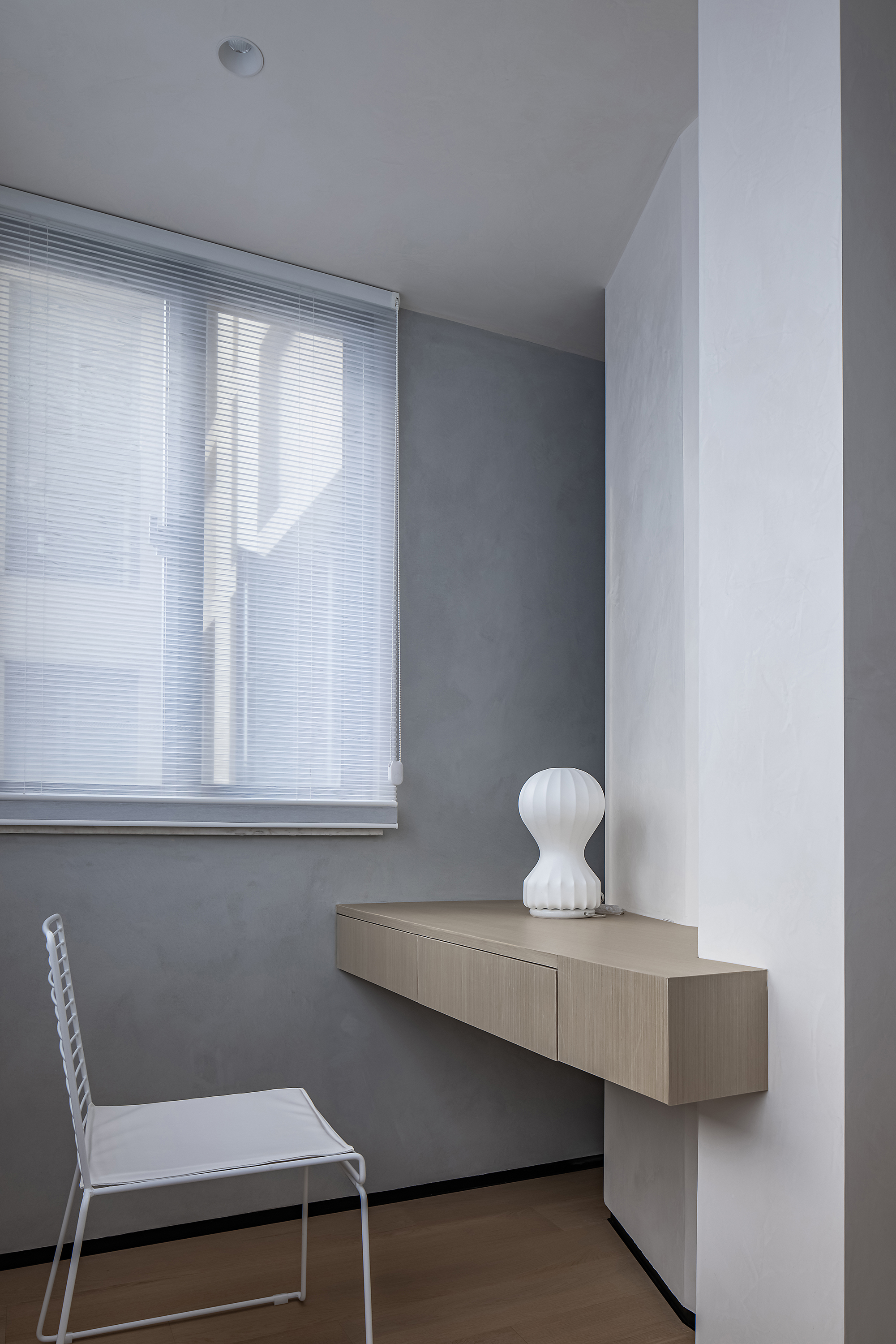 L型墙体为不可动混凝土部分,此墙也刚好处理为次卧门和主卧门之前的挡墙,让两个空间增加私密性。后方放置写字台,写字台与墙的结构留缝形成重叠,气、光、行、情互通。