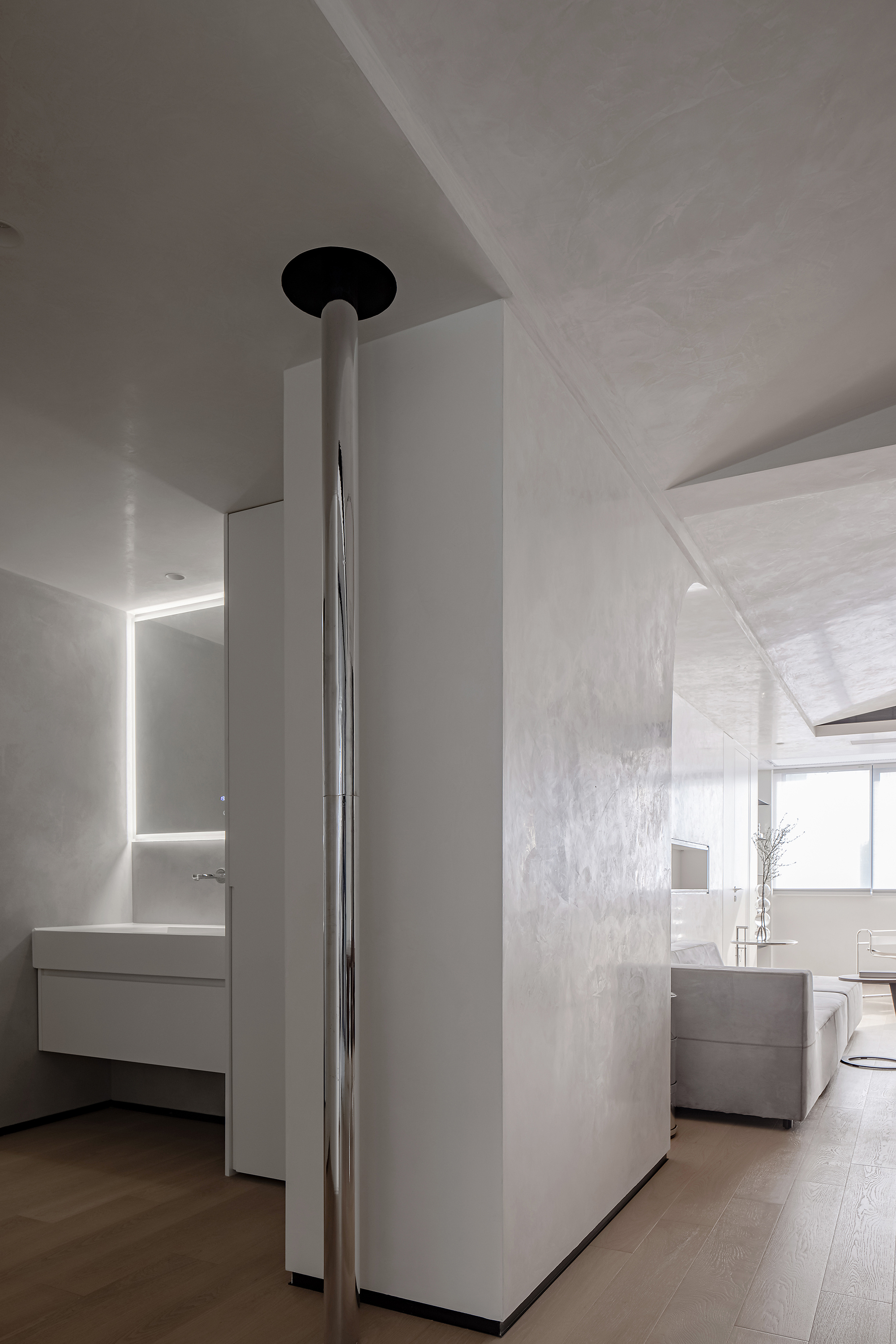 客卫干区,储物柜背墙同时也起到干区和餐厅遮挡划分作用。定制不锈钢铬色立柱和沙发后吊灯呼应,样式上和整体协调,同时也起到保护墙角的功能。
