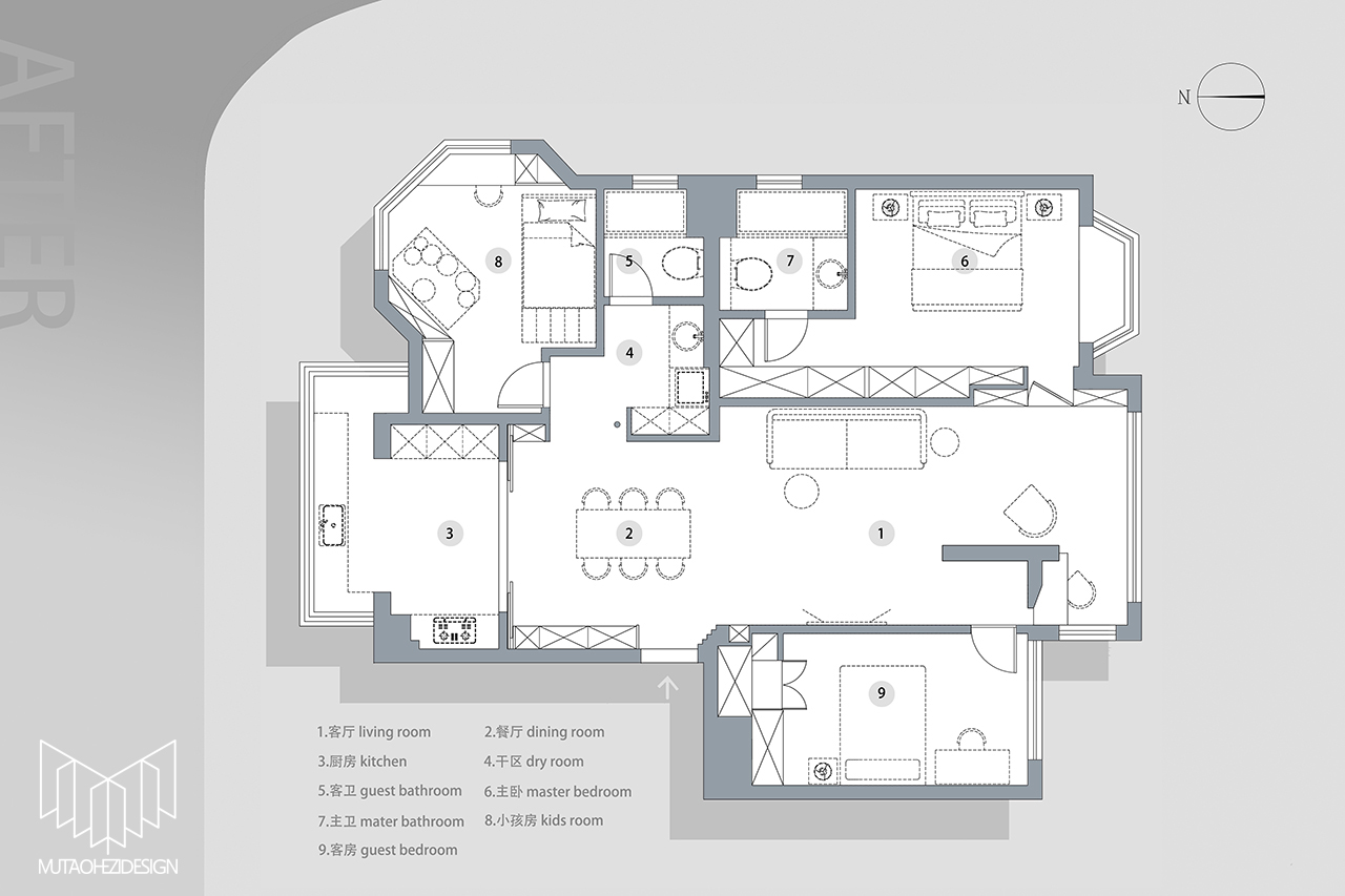 项目定位:本案是一套旧房改造,原有结构不够合理。因此做了以下优化处理: 1、客厅和次卧室对调,让客厅和餐厅一体化,让整个空间规整明亮,通风顺畅,光线通透。 2、鸡肋的北阳台归纳给厨房,扩大了厨房面积,增强实用性趋于合理,同时拆除墙体后,增加采光量,视线开阔。 3、南阳台归纳于客厅,进一步增大客厅面积,同时利用承重墙体结构,制作写字台,增强互动性,让阳光真正洒进客厅。 4、洗衣机烘干机嵌入柜体,至于公卫干区,并制作储物柜用于存放洗衣用品及杂物,让整个空间更加整洁。 5、微调主卫墙体,调整主卧和主卫之间的面积关系,置入