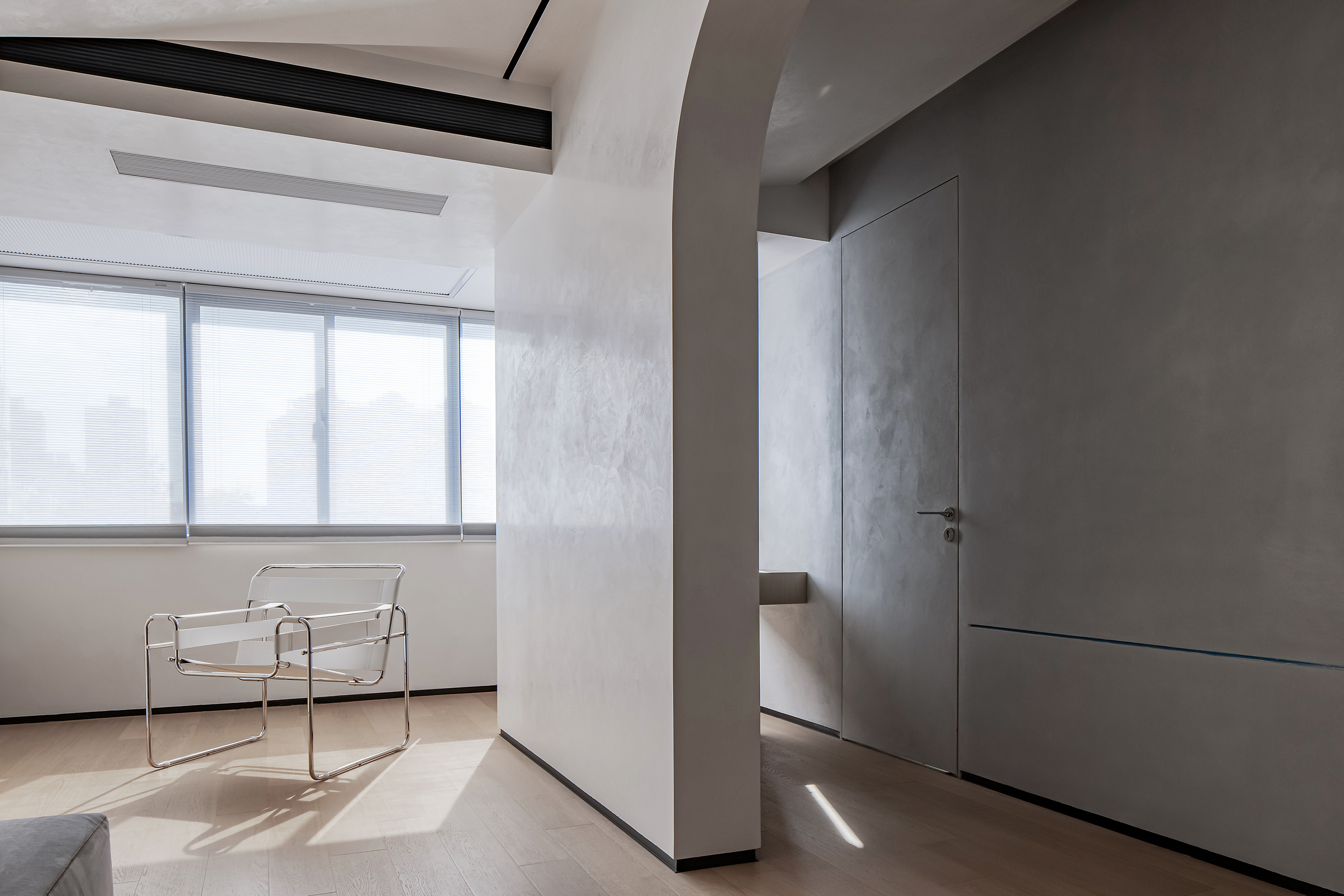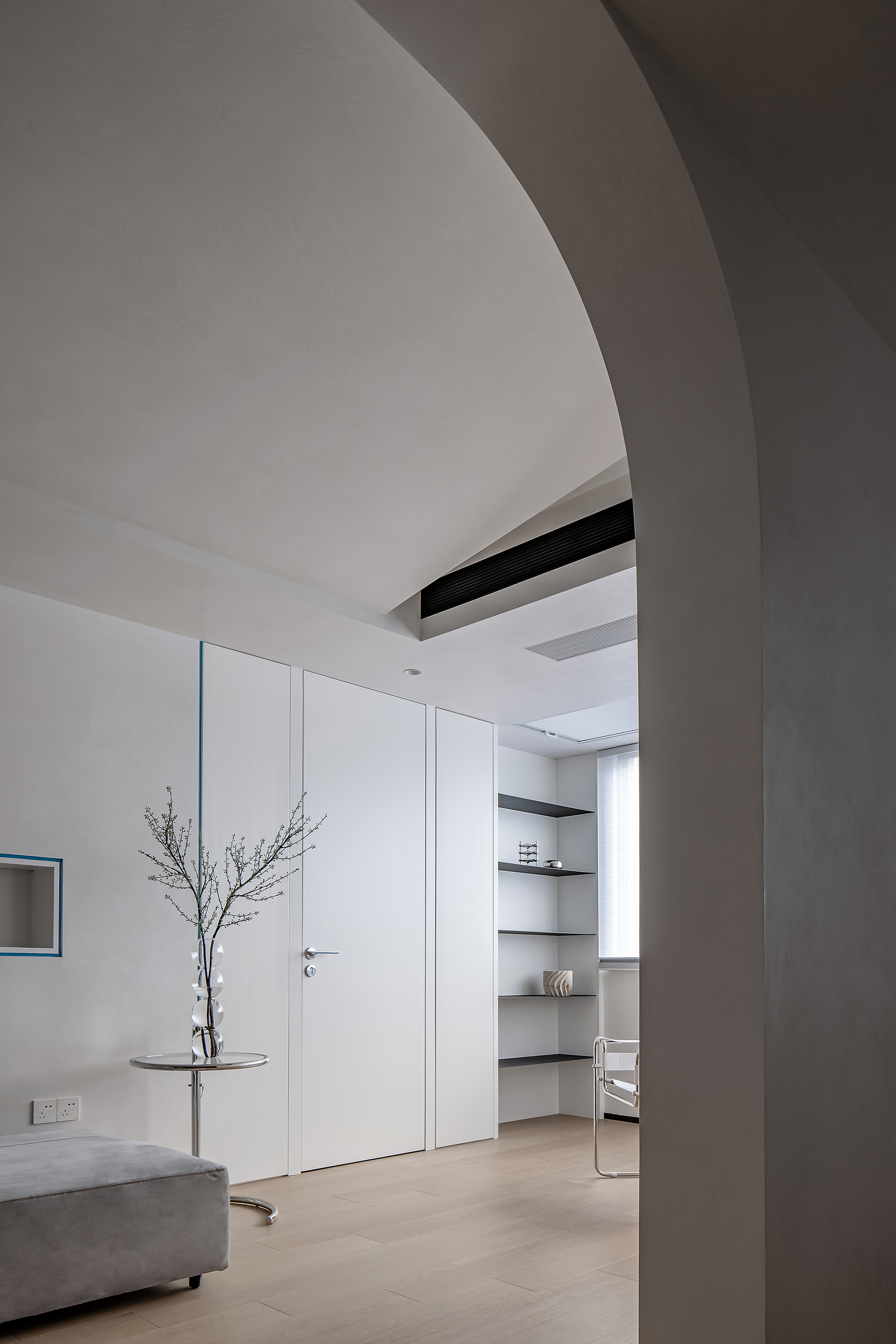 电视墙处看向主卧门,整体简约克制。近处是不可动混凝土墙体,顺势做弧形处理,和沙发墙面呼应。