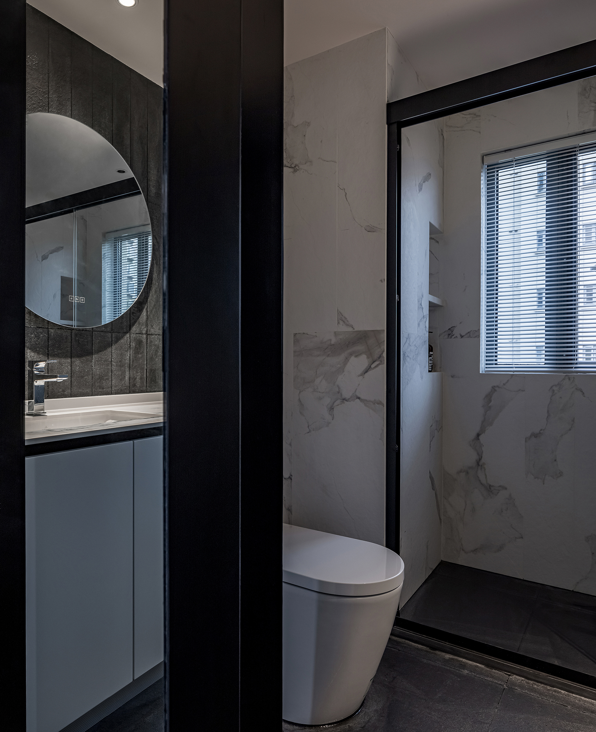 主卫黑色门口放置全身镜,扩大空间感受,也增加了实用性
