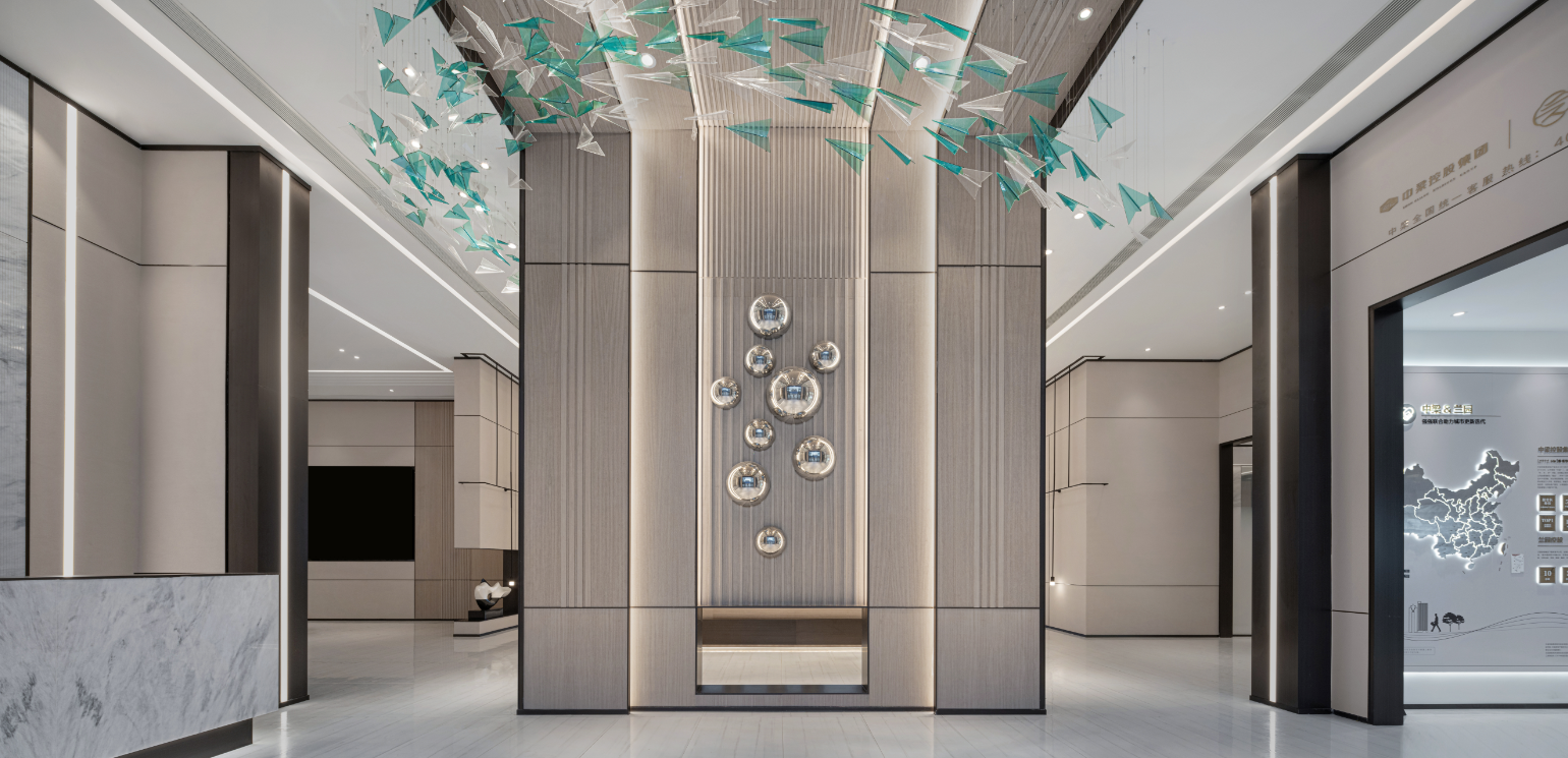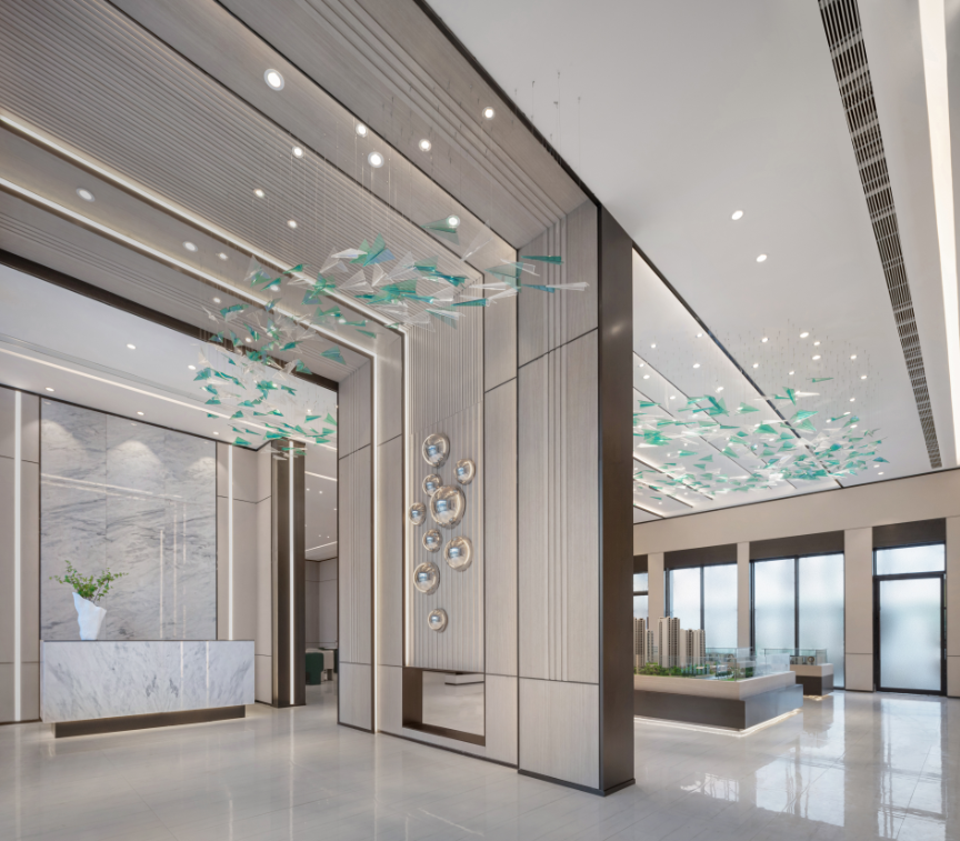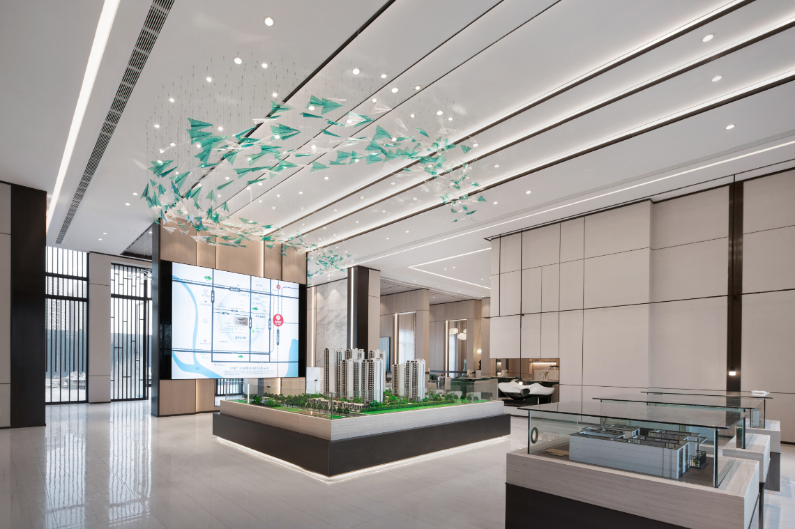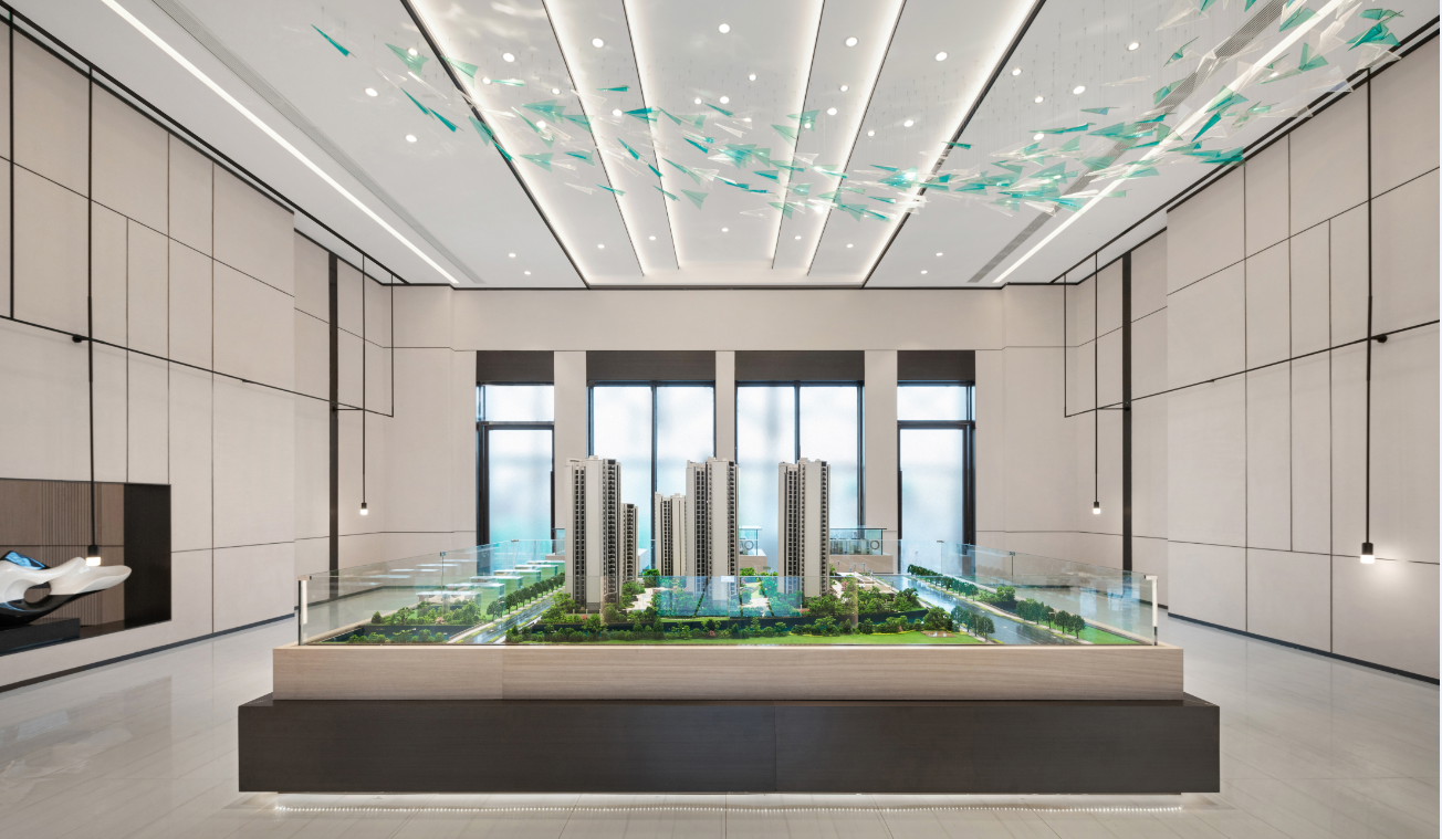 设计选材:灯饰的序列感和垂直线条将现代极简气质再次提拔,背景玻璃砖墙增强了空间的明亮度与通透感。沙盘区墙面的设计,仿石材效果的墙面漆取代了石材,既保留了质感,又倡导了绿色健康的设计理念,同时节省资源和降低了成本。