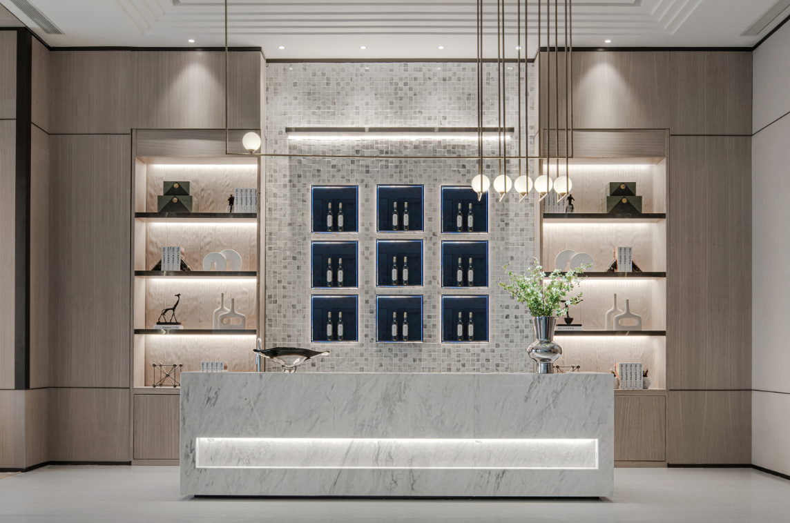 水吧台在材质和形体上与销控台有异曲同工之妙,但又各自演绎不同的节奏。