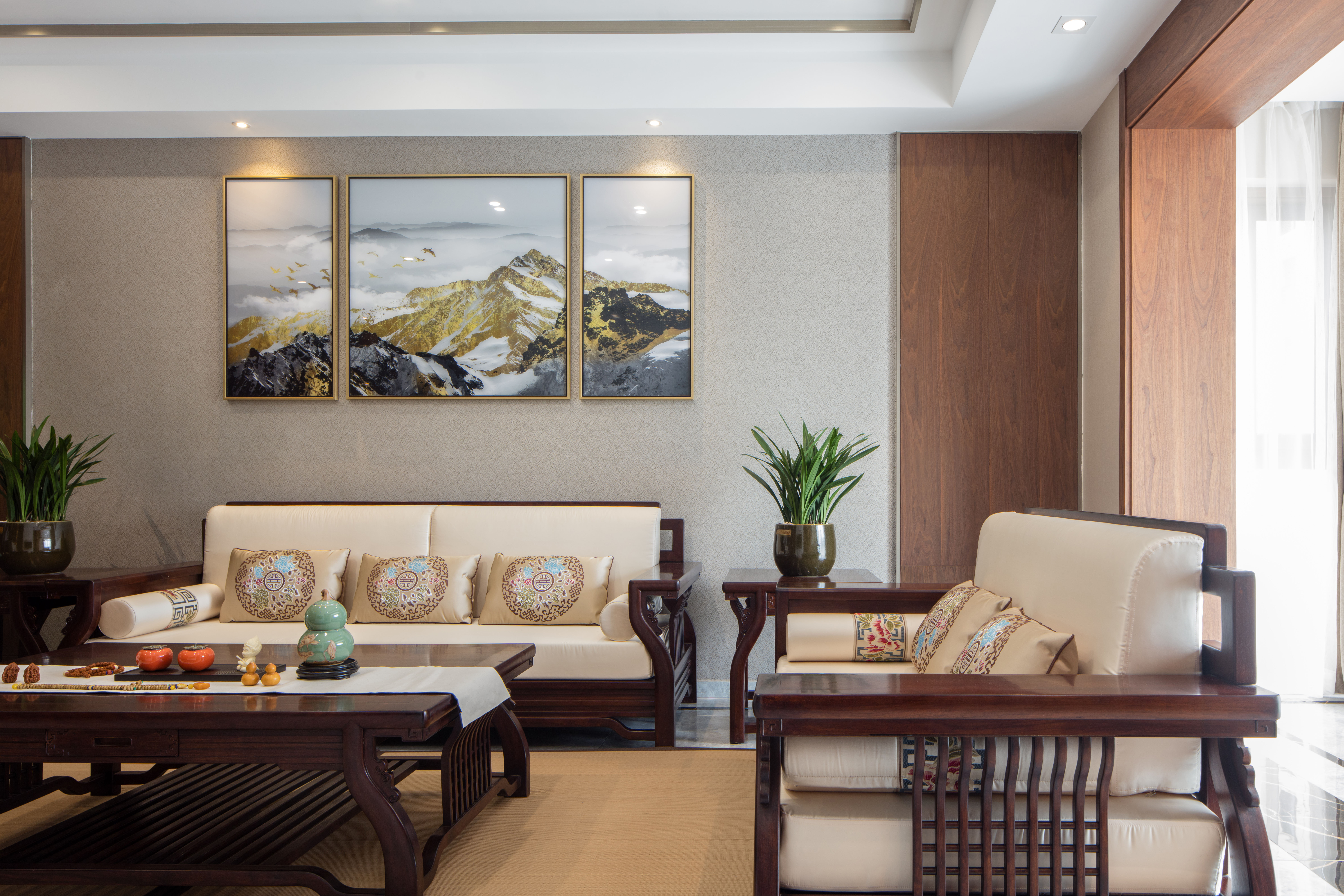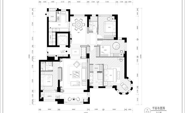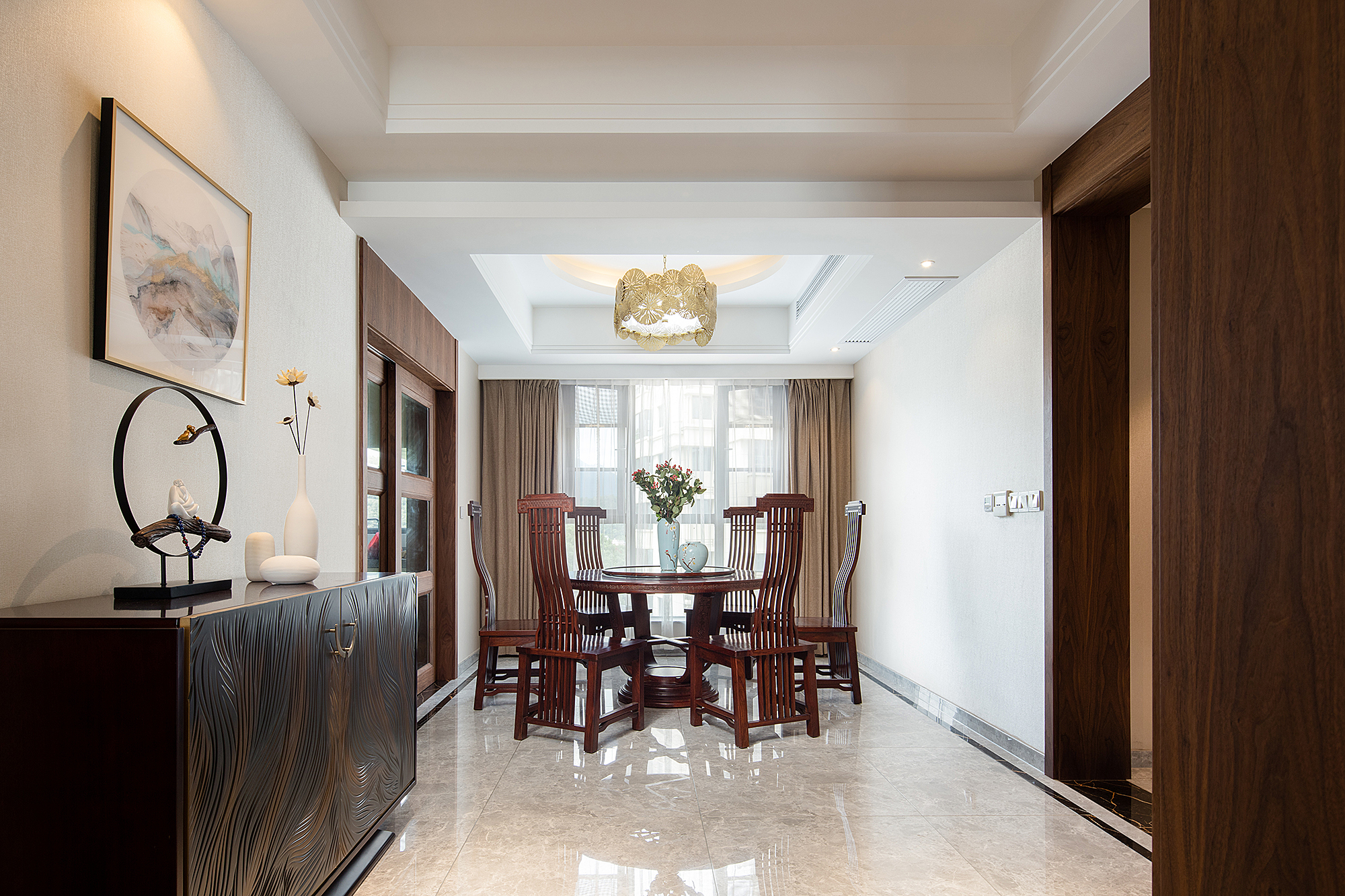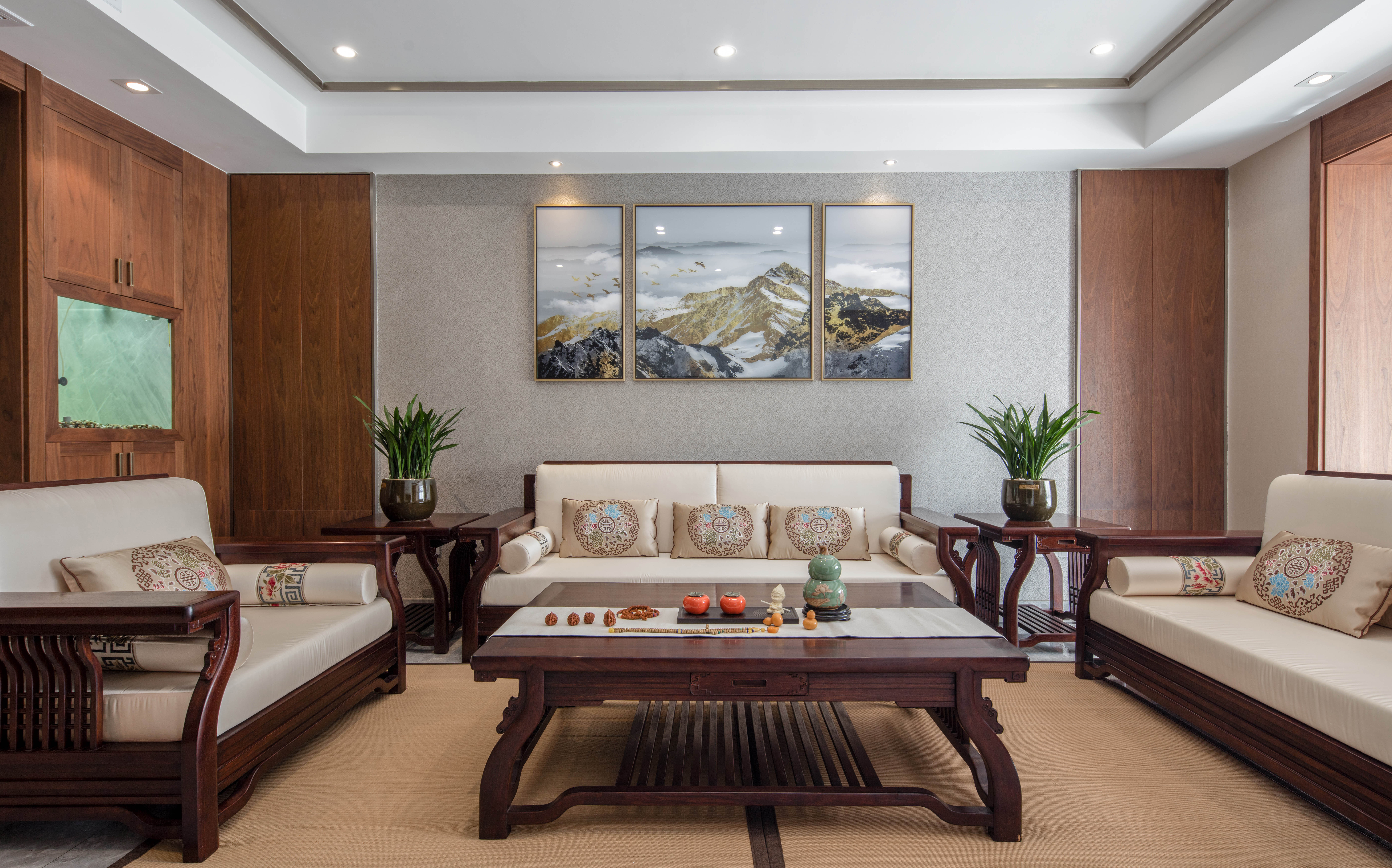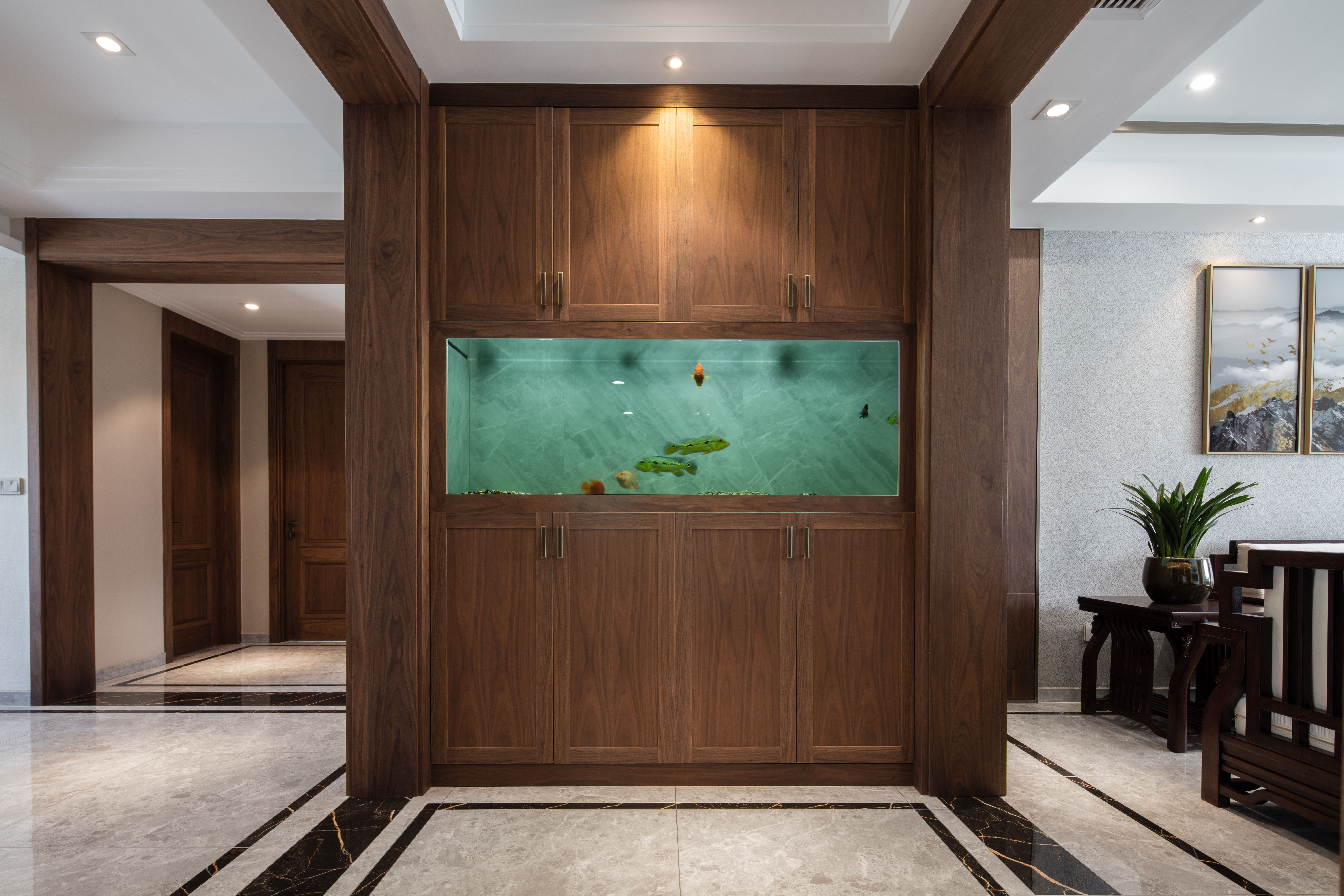本案为207平方平层结构,整个户型为东南北三面通透,入户门位于西侧中部位置。 养鱼是业主的一大爱好,以这个为出发点,进门玄关处正对面设置的鱼缸落地柜,也是整个户型的中心位置,下班到家就能见到自己的喜好。玄关将餐厅和客厅独立在各自的区域,整体色调上以胡桃木色和米色形成深浅的暖色搭配,地面的灰色砖恰到好处地起到了色平衡的作用。地面的竹席和墙面石材在材质上软硬搭配亦是如此。 选一副精致茶具,邀二、三好友家中小聚,品茶畅聊老子的无为之道。