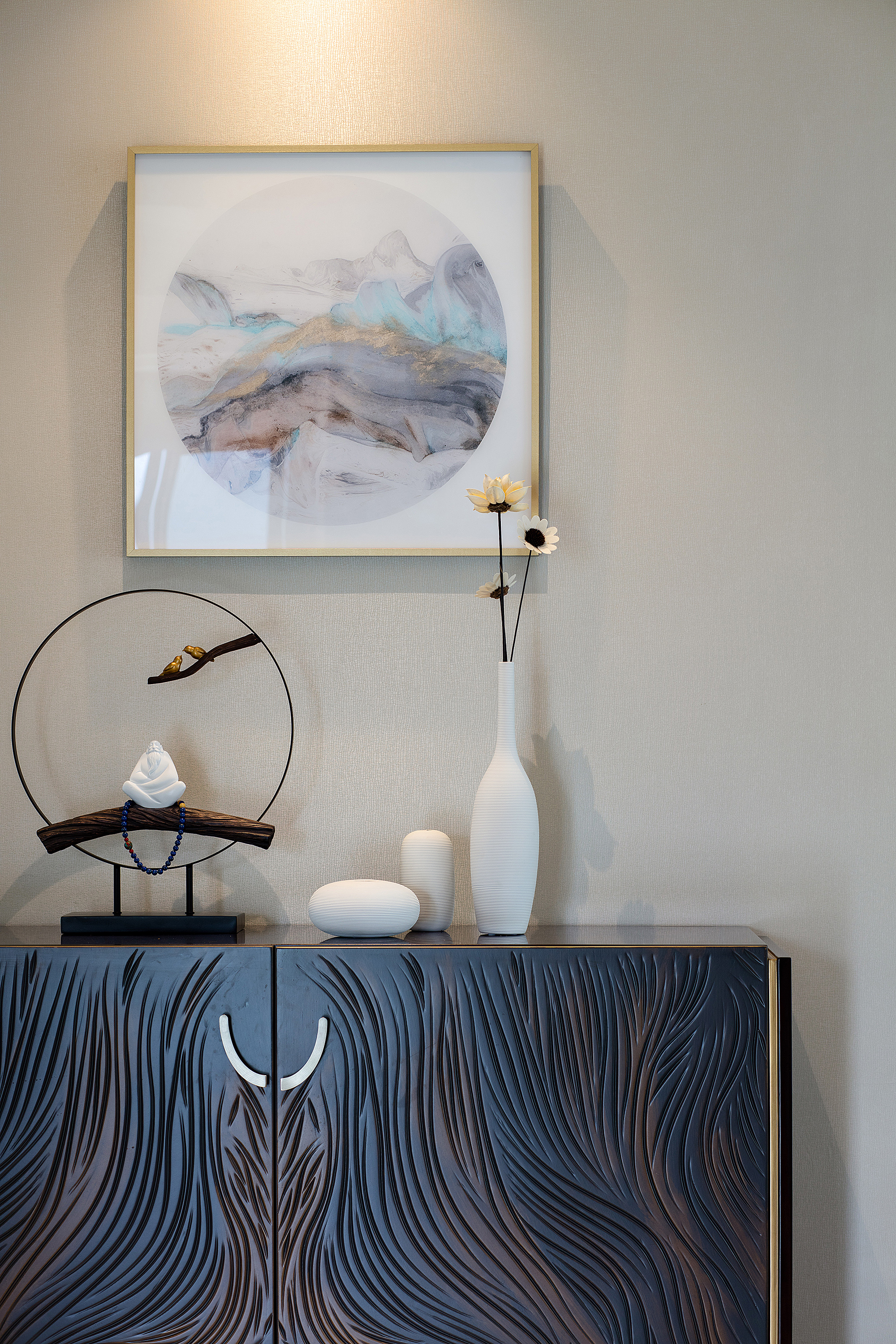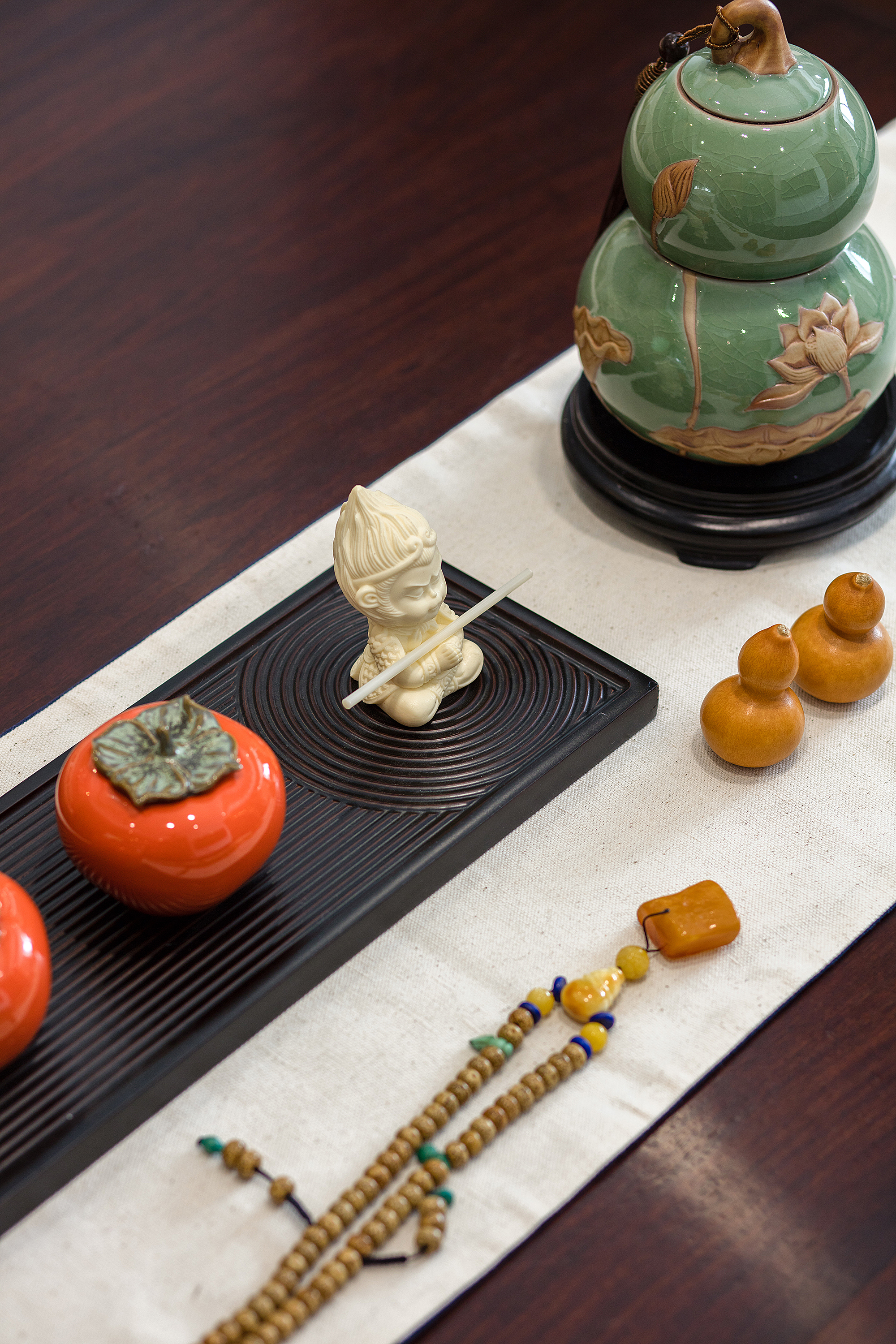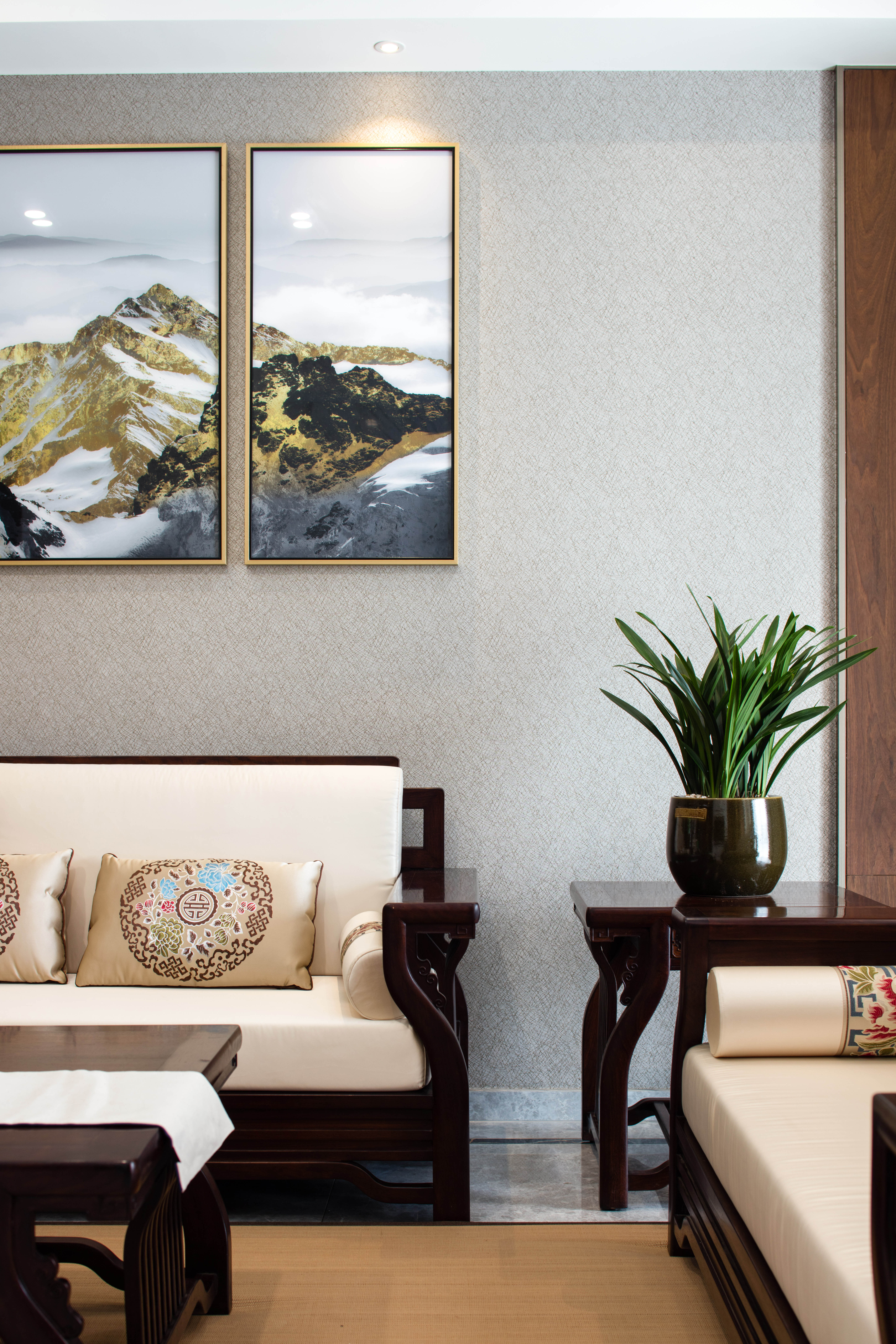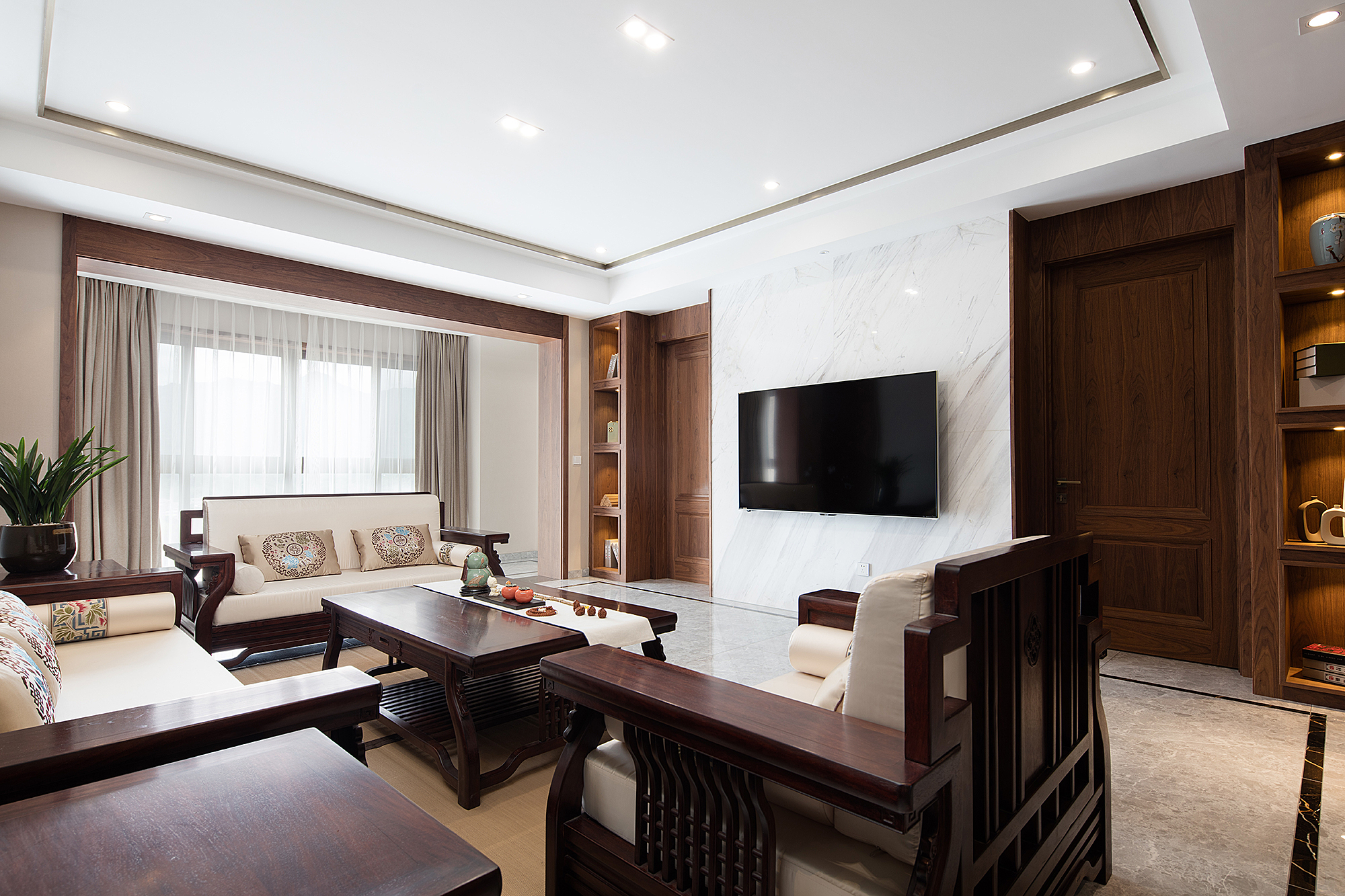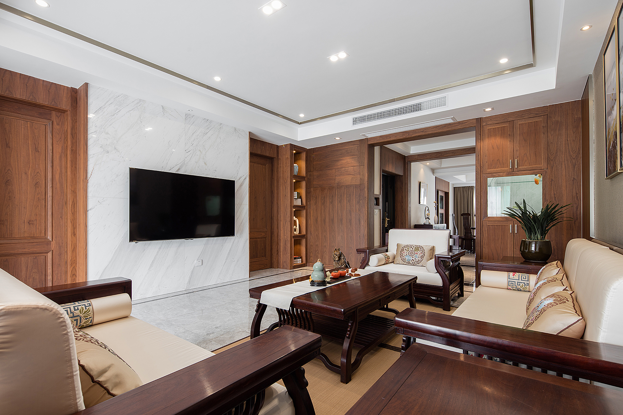 本案为207平方平层结构,整个户型为东南北三面通透,入户门位于西侧中部位置。 养鱼是业主的一大爱好,以这个为出发点,进门玄关处正对面设置的鱼缸落地柜,也是整个户型的中心位置,下班到家就能见到自己的喜好。玄关将餐厅和客厅独立在各自的区域,整体色调上以胡桃木色和米色形成深浅的暖色搭配,地面的灰色砖恰到好处地起到了色平衡的作用。地面的竹席和墙面石材在材质上软硬搭配亦是如此。 选一副精致茶具,邀二、三好友家中小聚,品茶畅聊老子的无为之道。