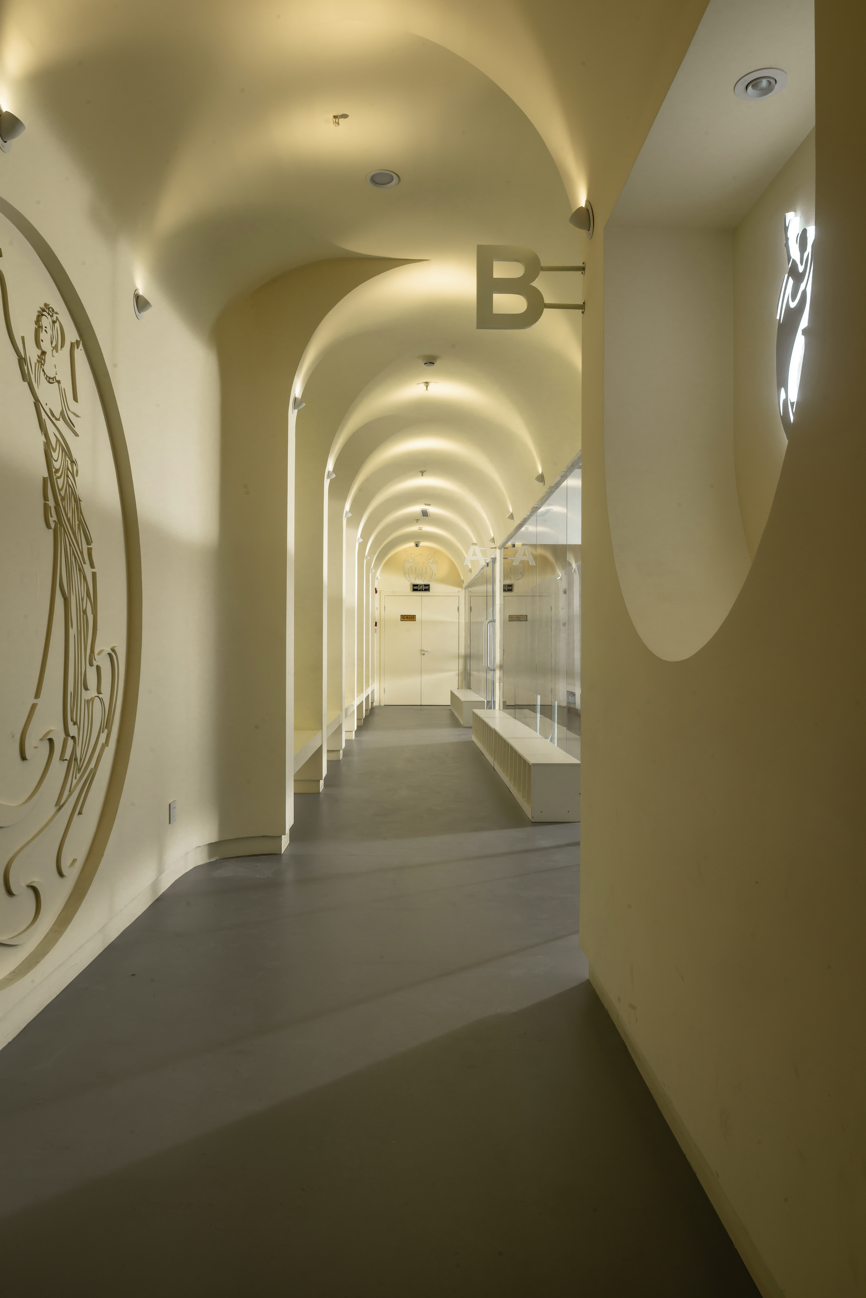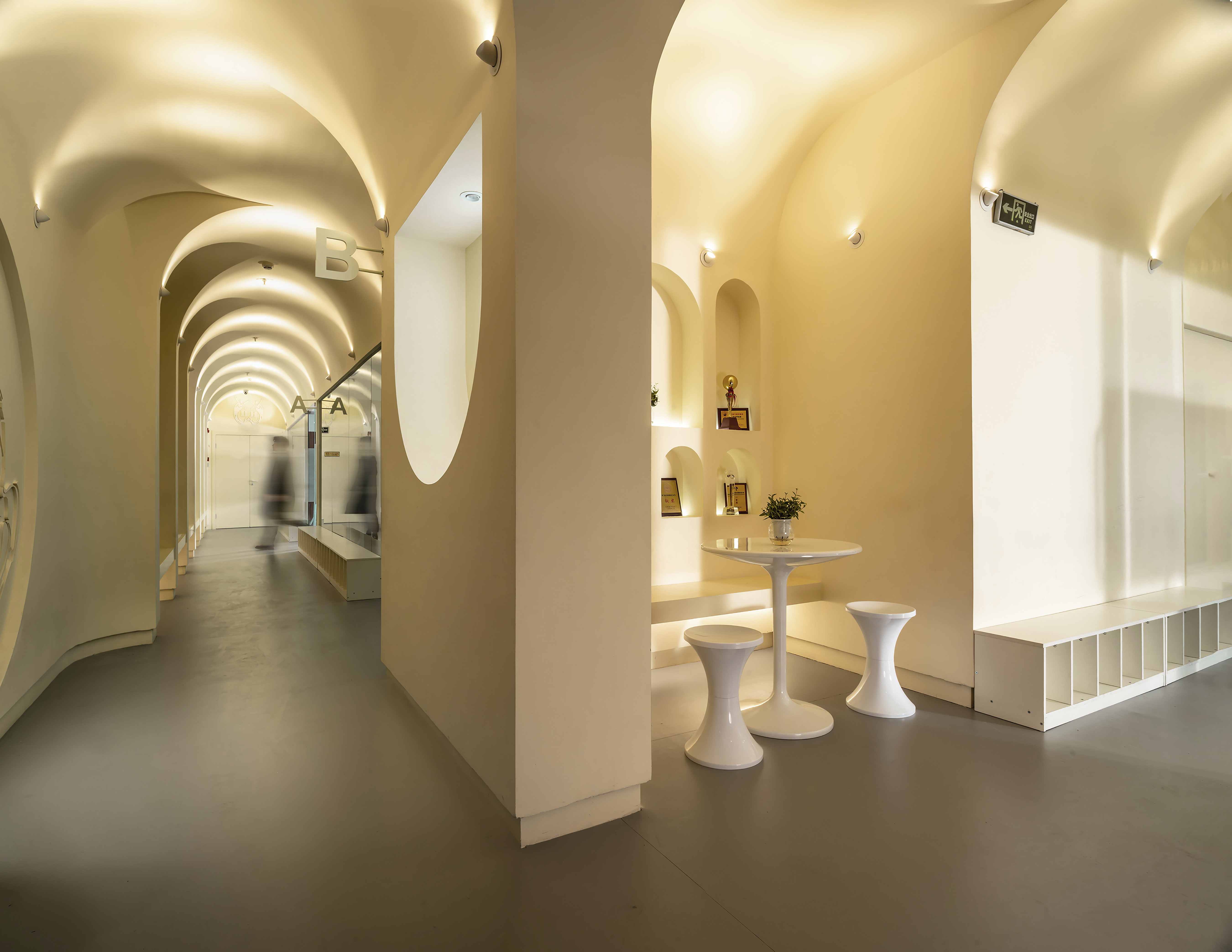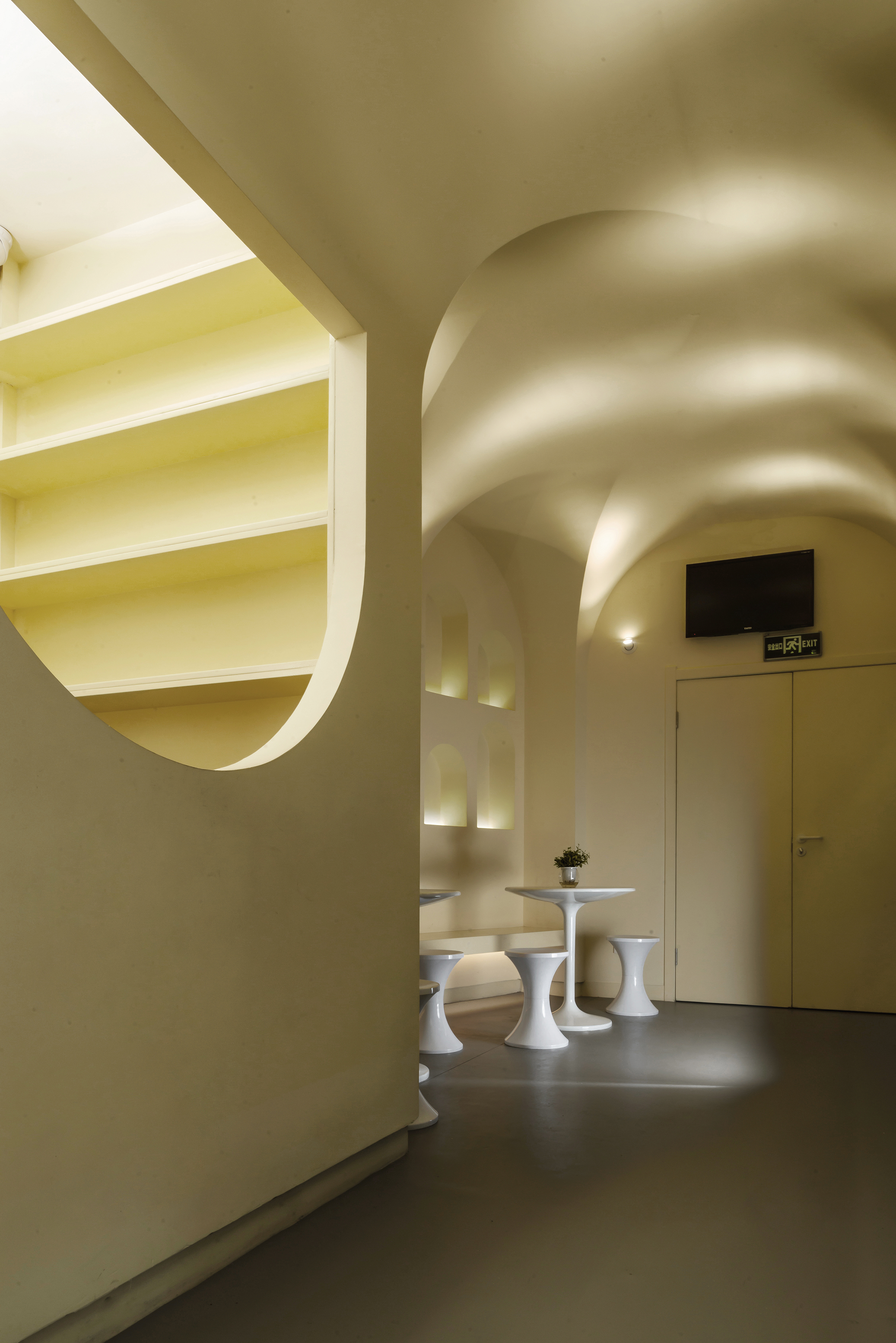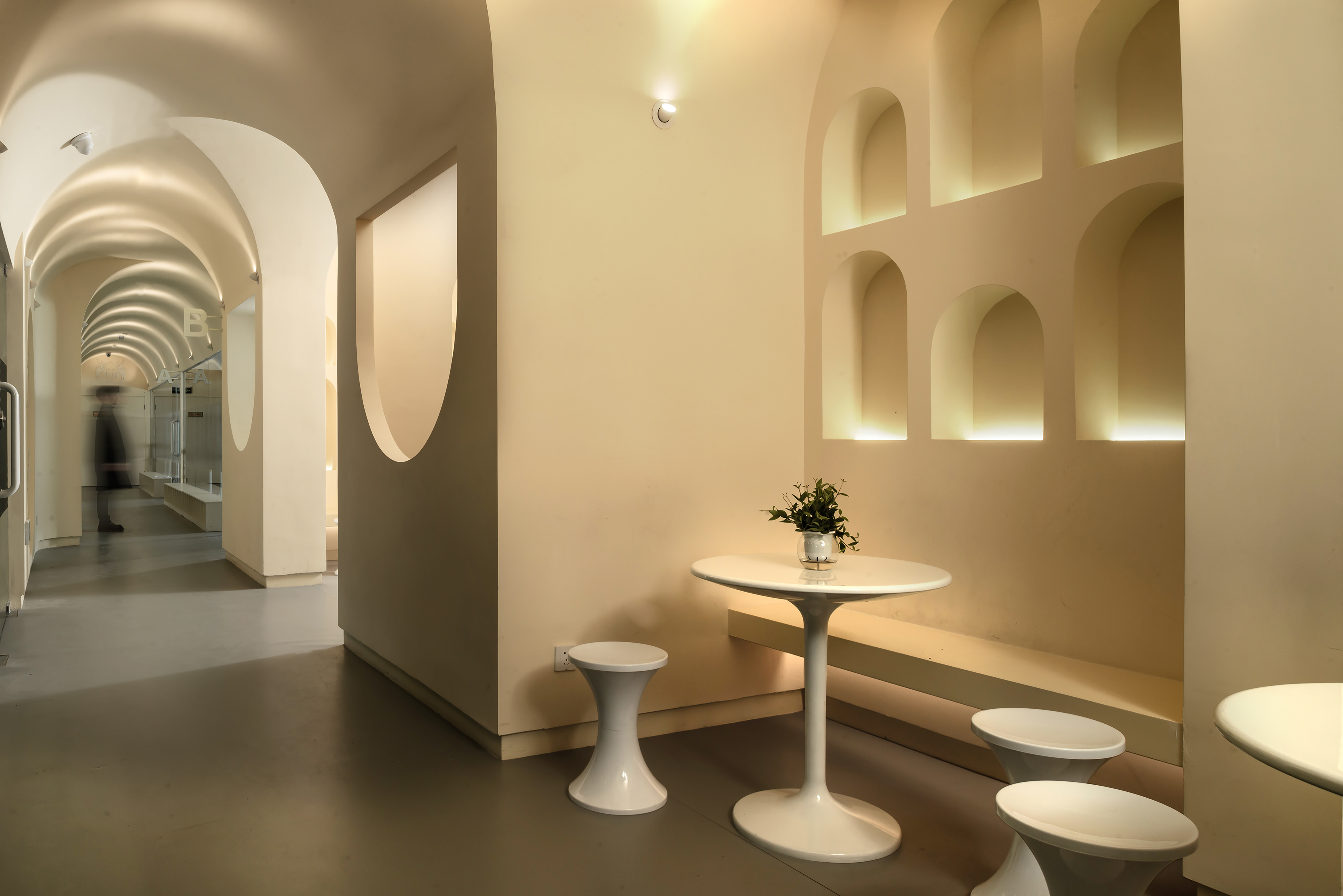 公共空间1 墙体素极,石膏、腻子、乳胶漆足矣,而在工艺上,以原始泥灰墙手法结合现代材料,既是一种延续和继承,又在材质上不会过于陈旧。空间中看不见的气韵是设计追问的本质所在,气所呈现的美以及韵所表达的质,需要物理化建构的结果去依附。建构的核心是理念,是材料,还有对造型、灯光,包括对自然的理解,对人活动的呵护,及对文化的回望。所以在整个公共空间,汲取洞窟造型加以韵律化设计,呈现的是经年积淀的文化底蕴