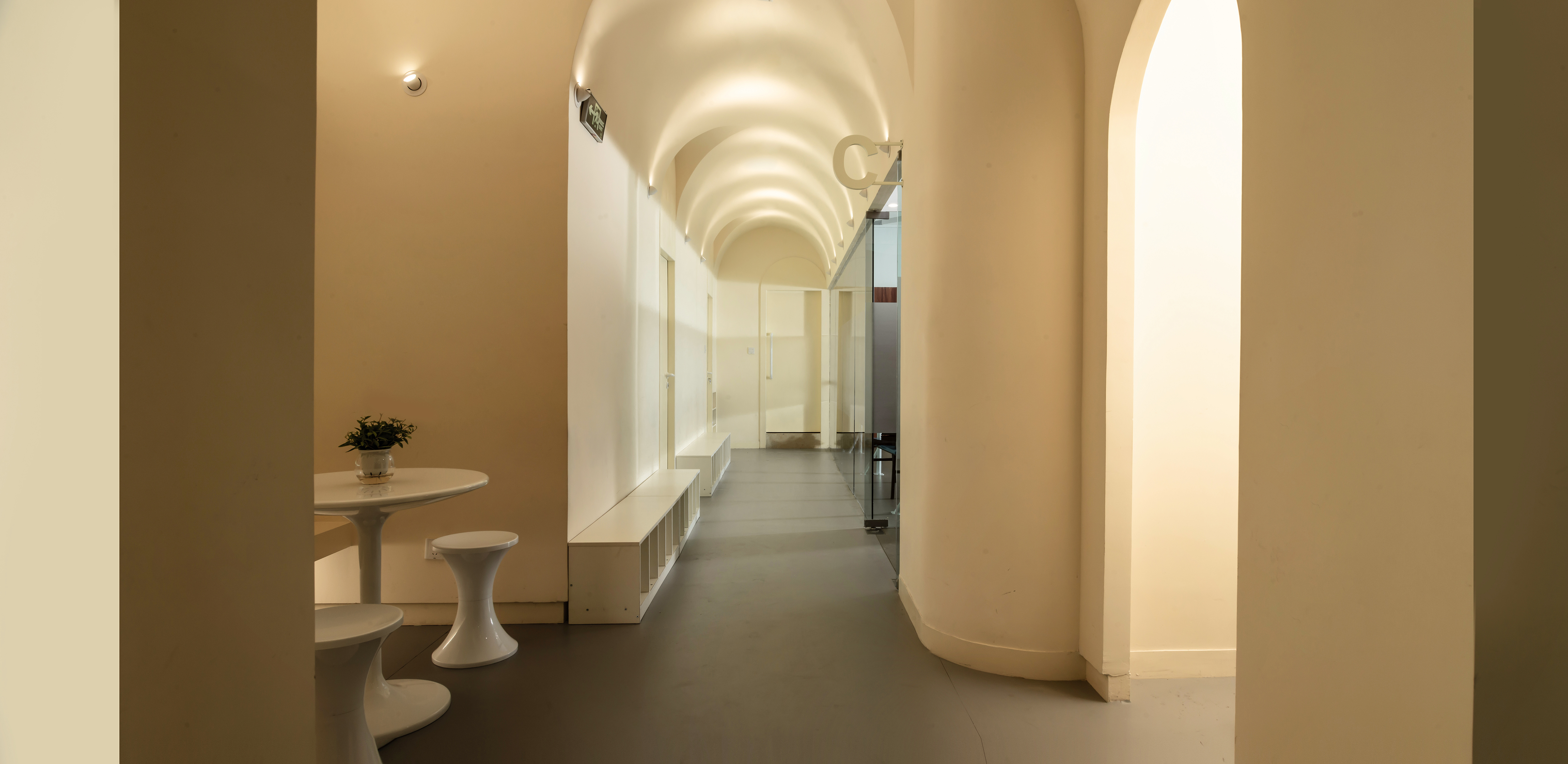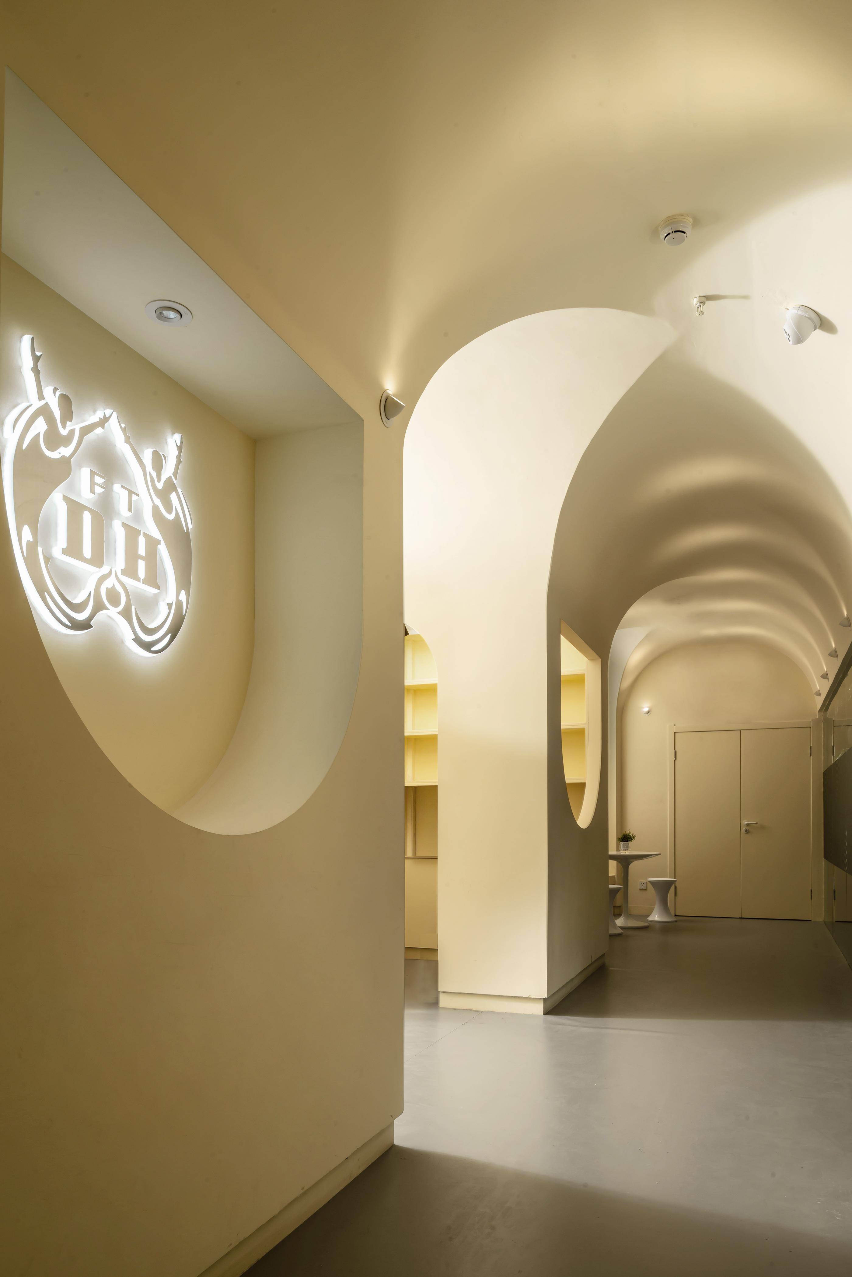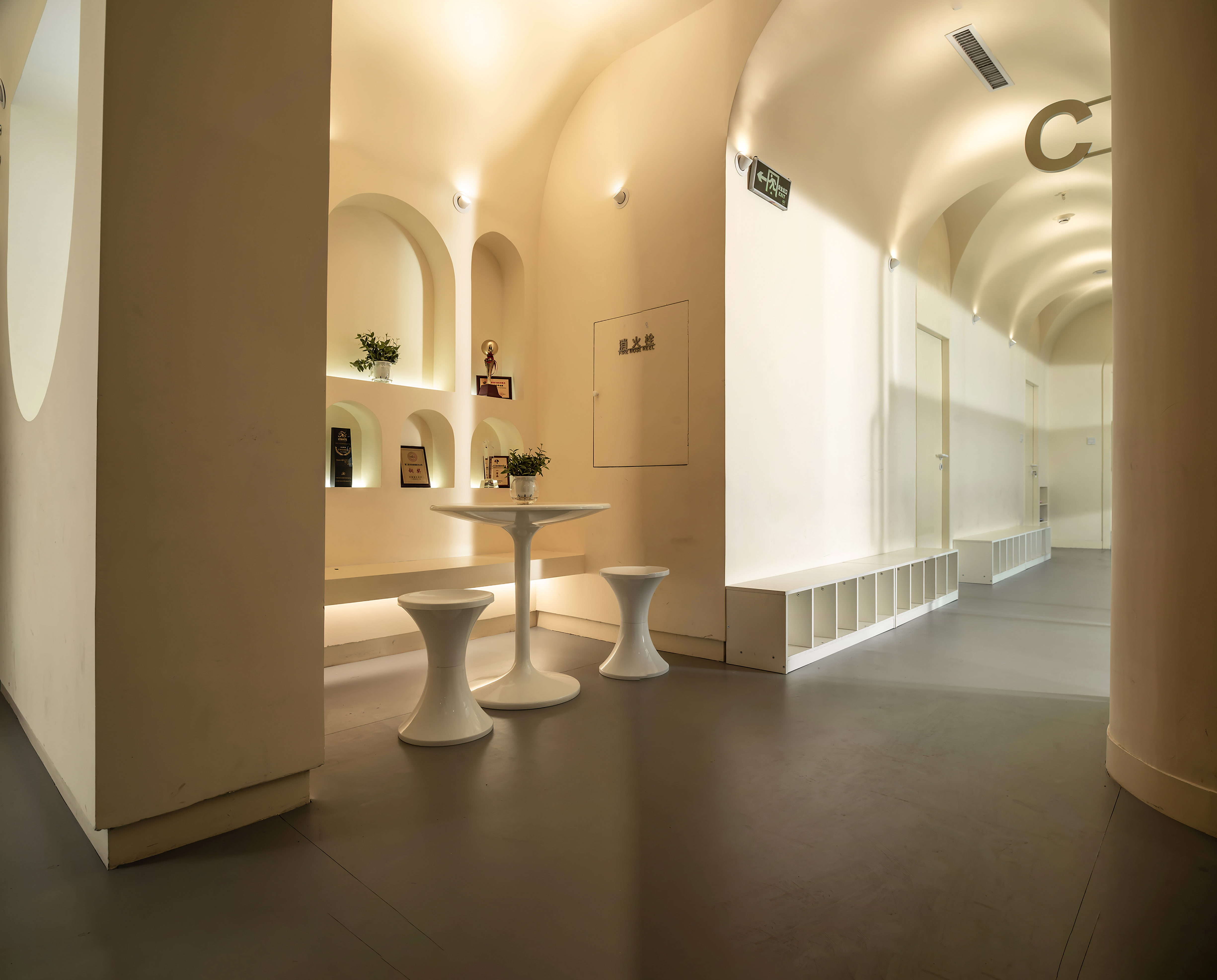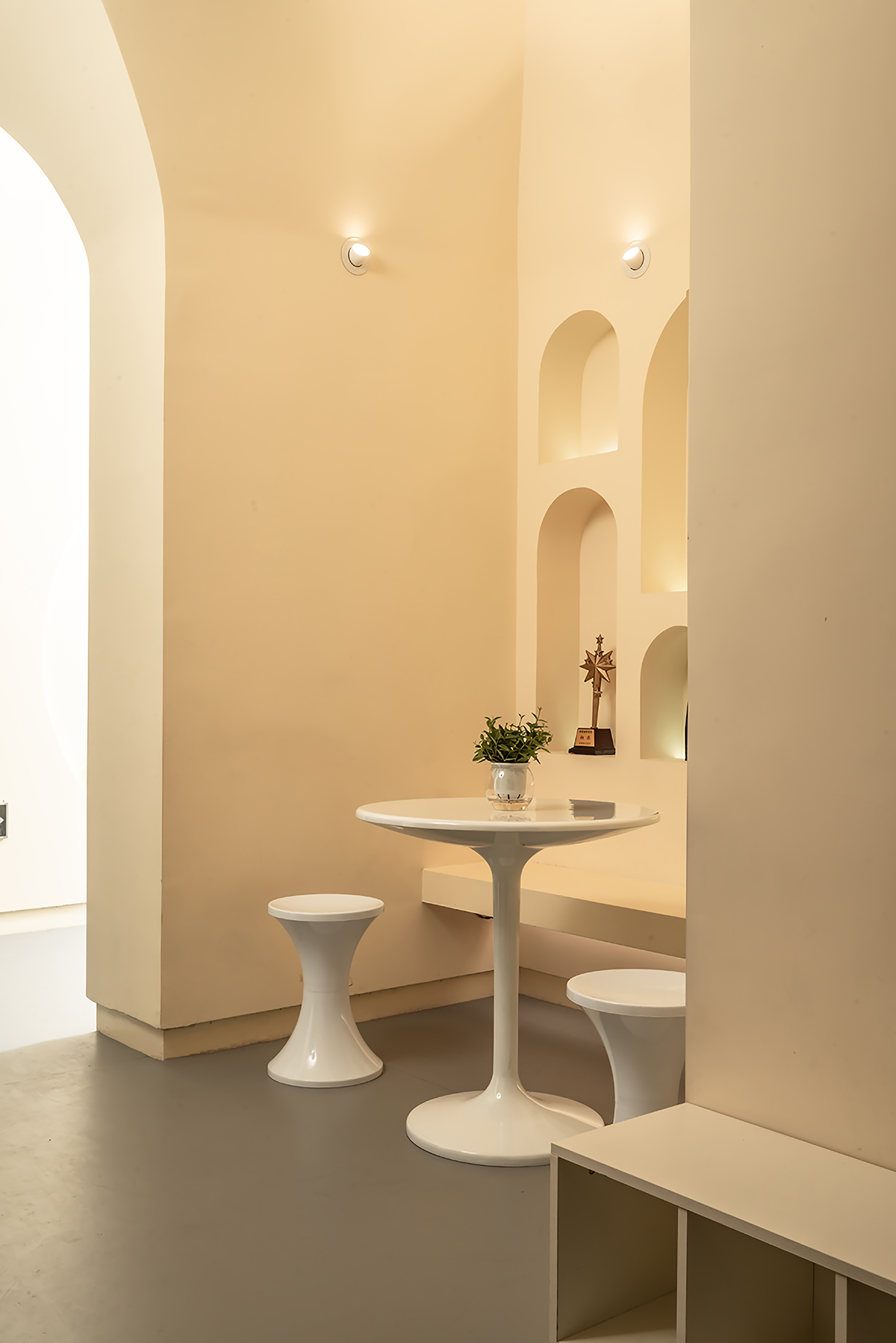 公共空间1 墙体素极,石膏、腻子、乳胶漆足矣,而在工艺上,以原始泥灰墙手法结合现代材料,既是一种延续和继承,又在材质上不会过于陈旧。空间中看不见的气韵是设计追问的本质所在,气所呈现的美以及韵所表达的质,需要物理化建构的结果去依附。建构的核心是理念,是材料,还有对造型、灯光,包括对自然的理解,对人活动的呵护,及对文化的回望。所以在整个公共空间,汲取洞窟造型加以韵律化设计,呈现的是经年积淀的文化底蕴