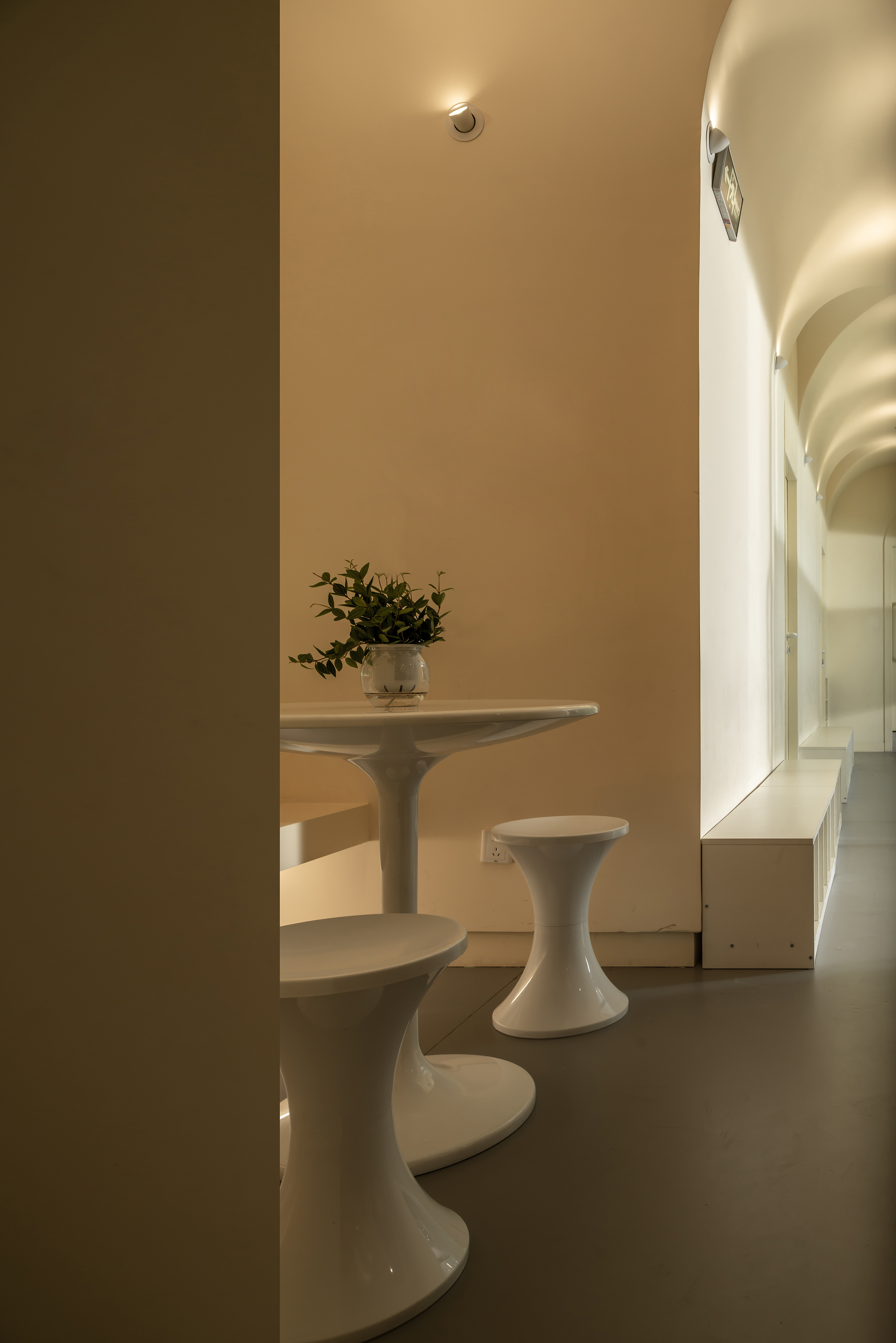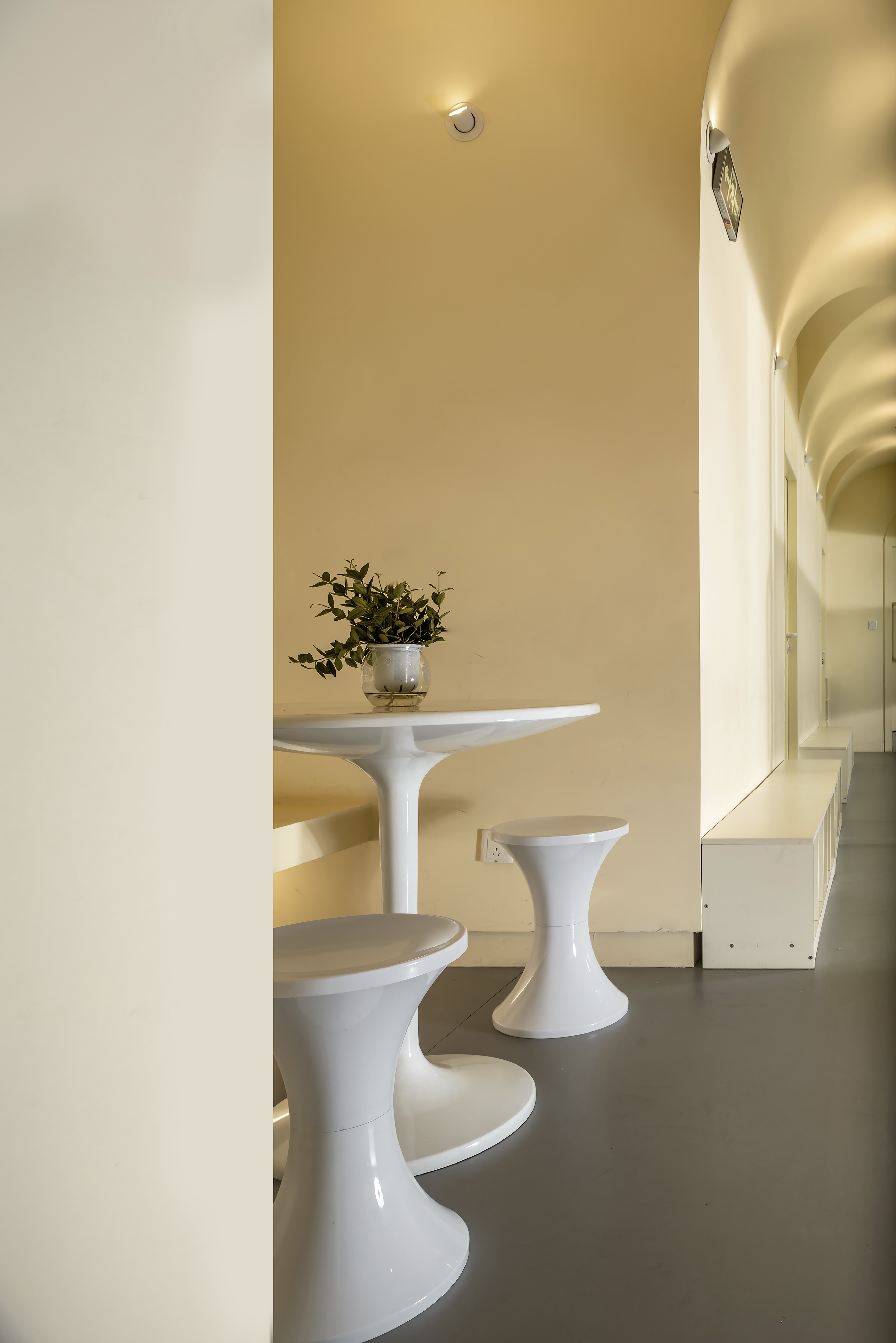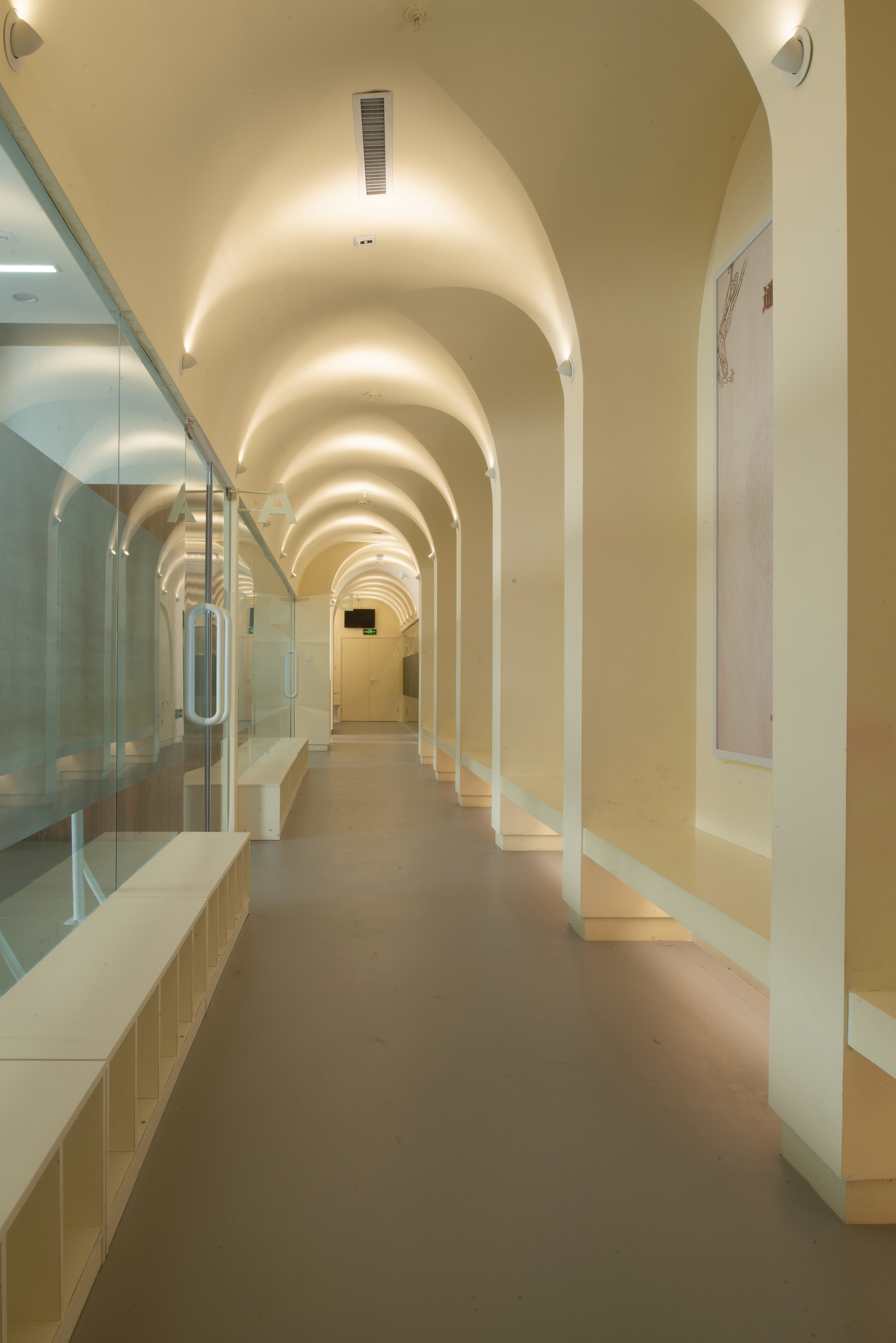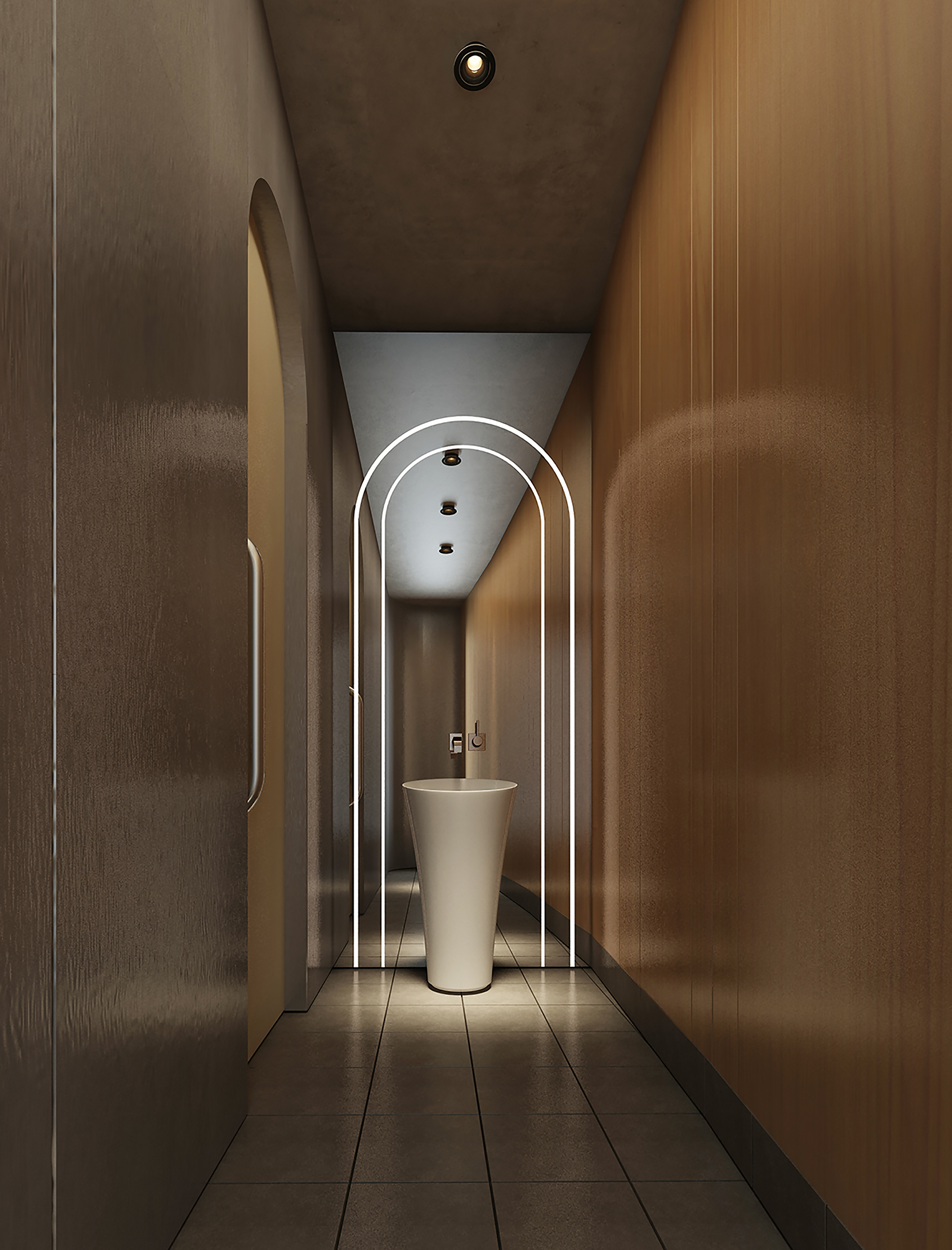 公共空间1 墙体素极,石膏、腻子、乳胶漆足矣,而在工艺上,以原始泥灰墙手法结合现代材料,既是一种延续和继承,又在材质上不会过于陈旧。空间中看不见的气韵是设计追问的本质所在,气所呈现的美以及韵所表达的质,需要物理化建构的结果去依附。建构的核心是理念,是材料,还有对造型、灯光,包括对自然的理解,对人活动的呵护,及对文化的回望。所以在整个公共空间,汲取洞窟造型加以韵律化设计,呈现的是经年积淀的文化底蕴
