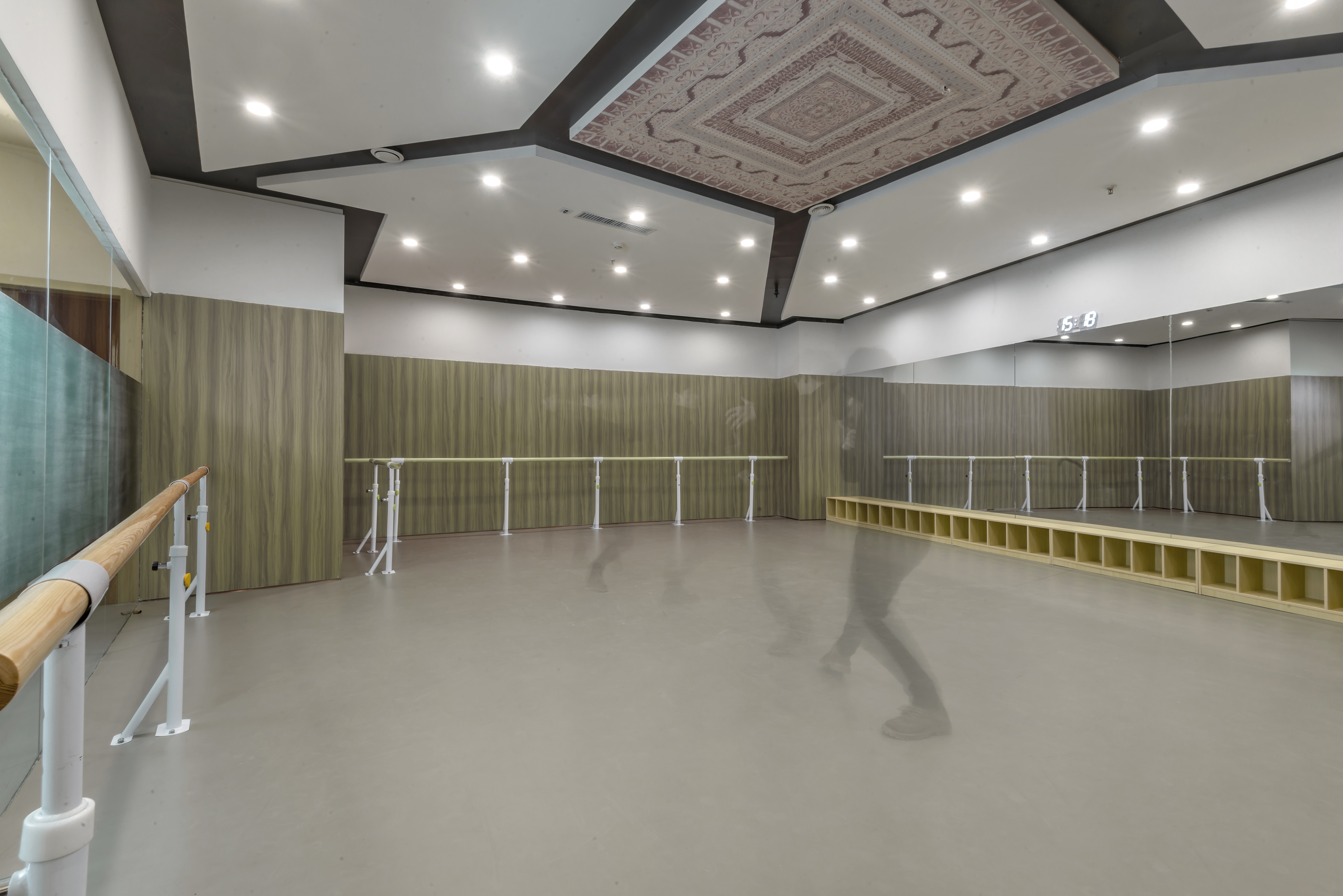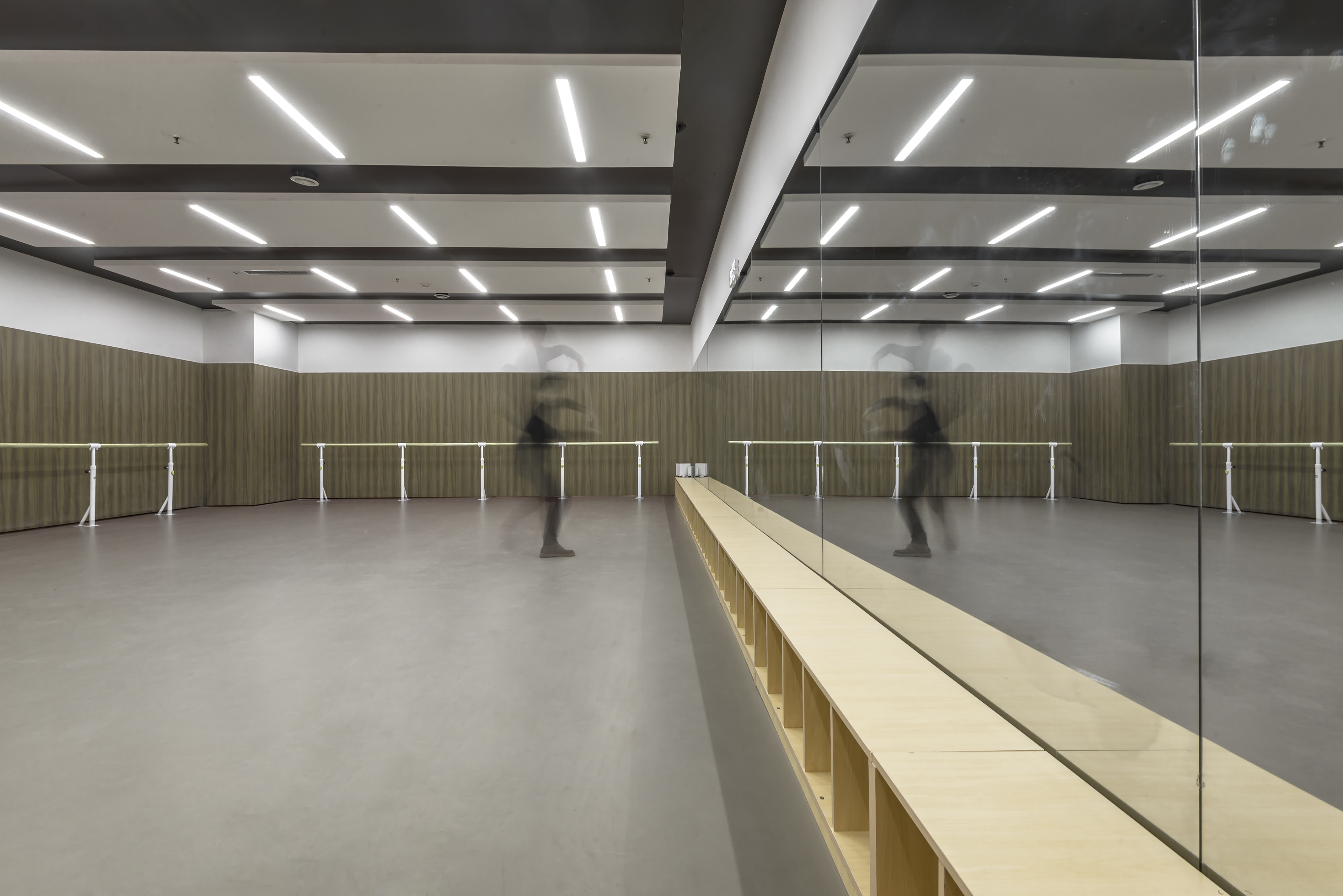在舞蹈教室的设计中,以木色墙板为基调,辅以灰色塑胶地板、白色及灰色乳胶漆,延续公共空间部分的简洁手法 -