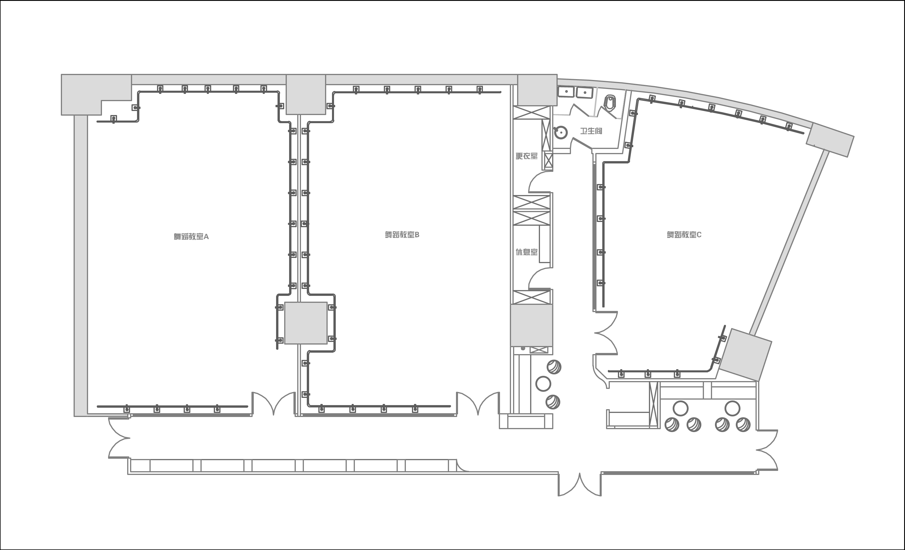 舞蹈教室1 以木色墙板为基调,辅以灰色塑胶地板、白色及灰色乳胶漆,延续公共空间部分的简洁手法,本着归真、淳朴的理念营造一种温馨和谐的舞蹈环境。当艺术和空间在一起的时候,两者更像是音乐和舞者之间的关系。只会让彼此更丰富而有内容。