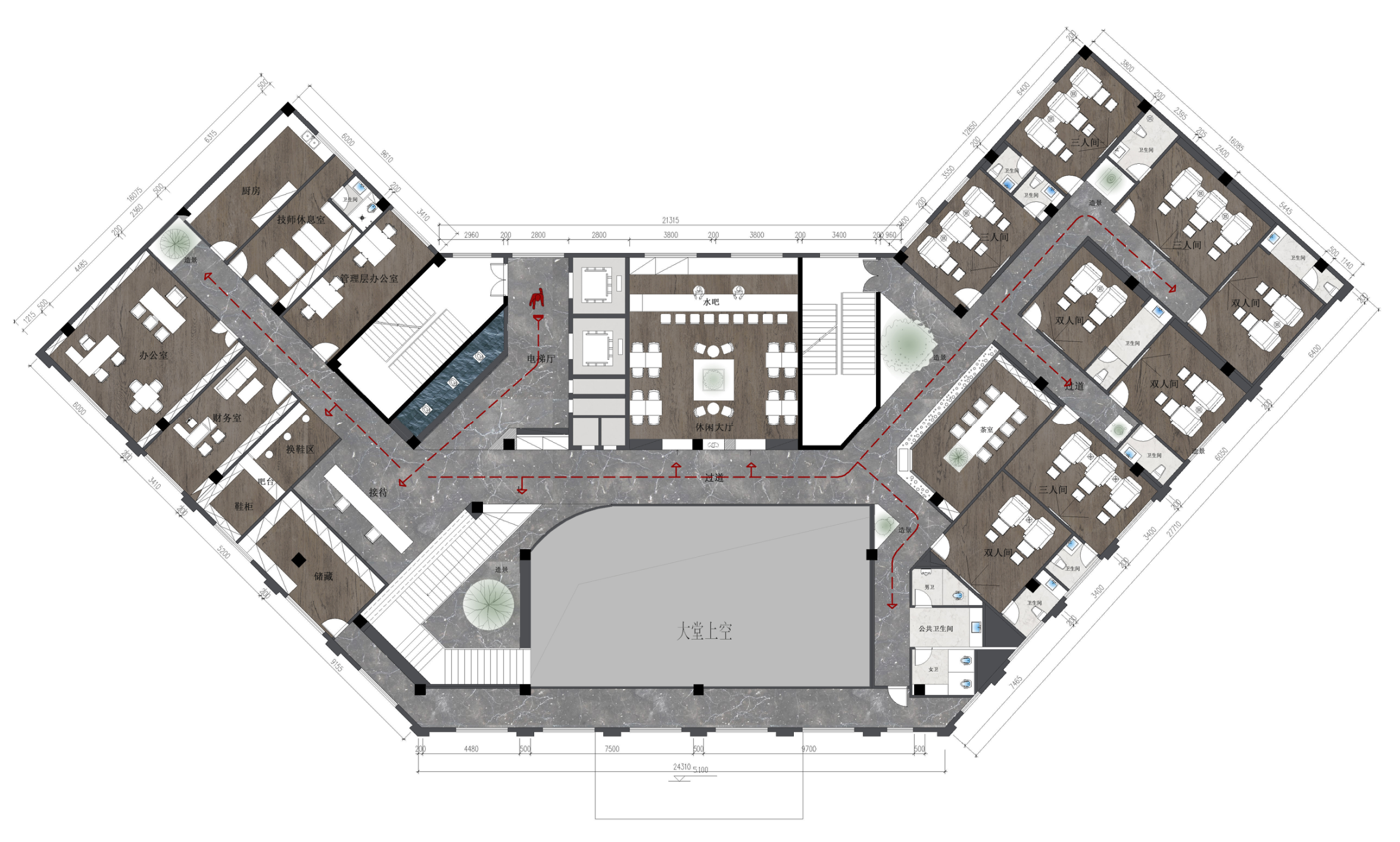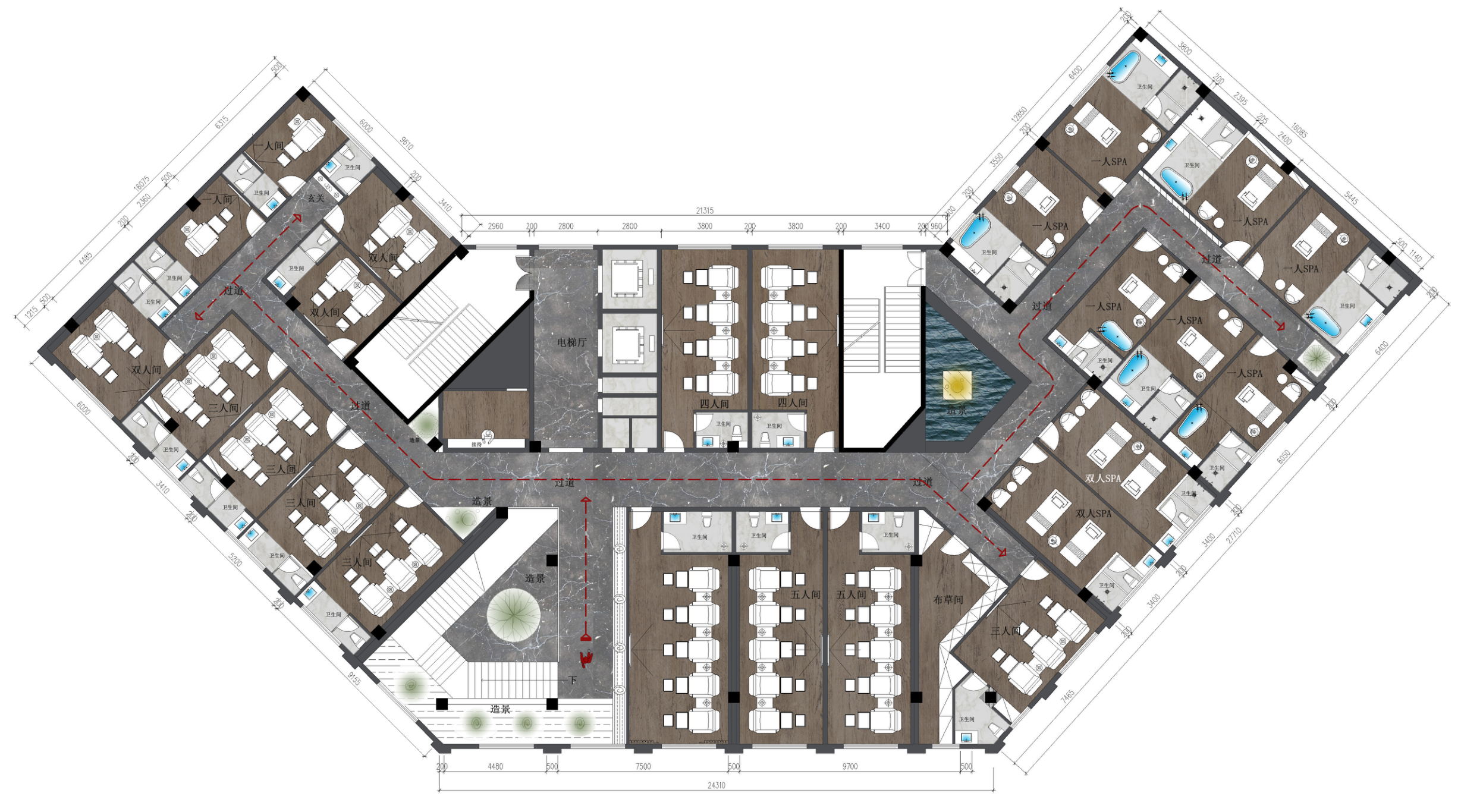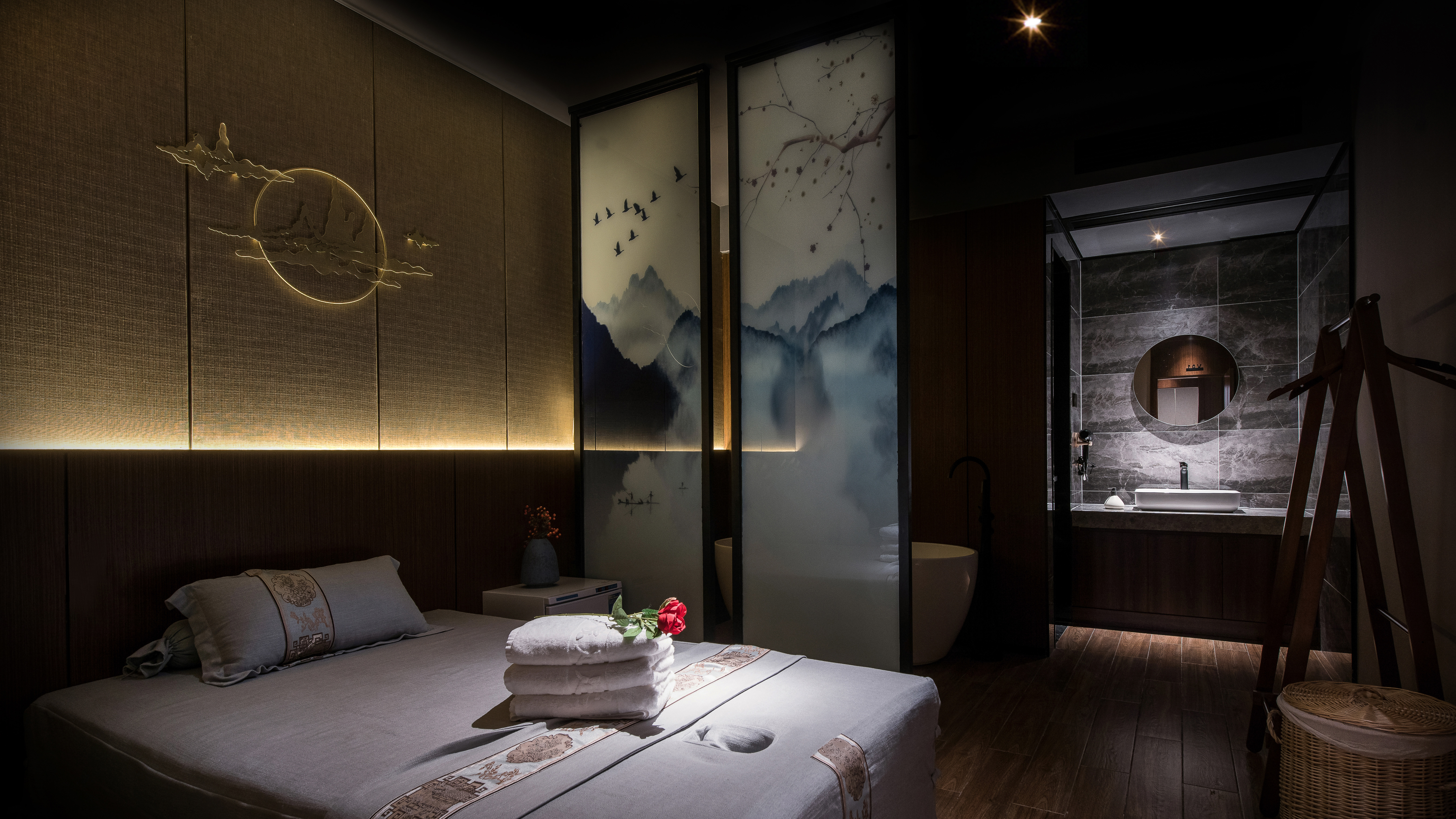 空间布局:用近景式的体验方式对空间进行演绎,做到曲径通幽,一步一景、移步换景的视觉效果。整体空间秩序井然,浑然统一基调中各功能区个性亦获得鲜明表现,时尚的休闲调性下、完整空间叙事脉络贡献出舒适惬意的场所体验。通过创造一个多功能复合空间,建设喜足健康养生足道,营造出有温度.有情怀.有智慧的休闲空间!