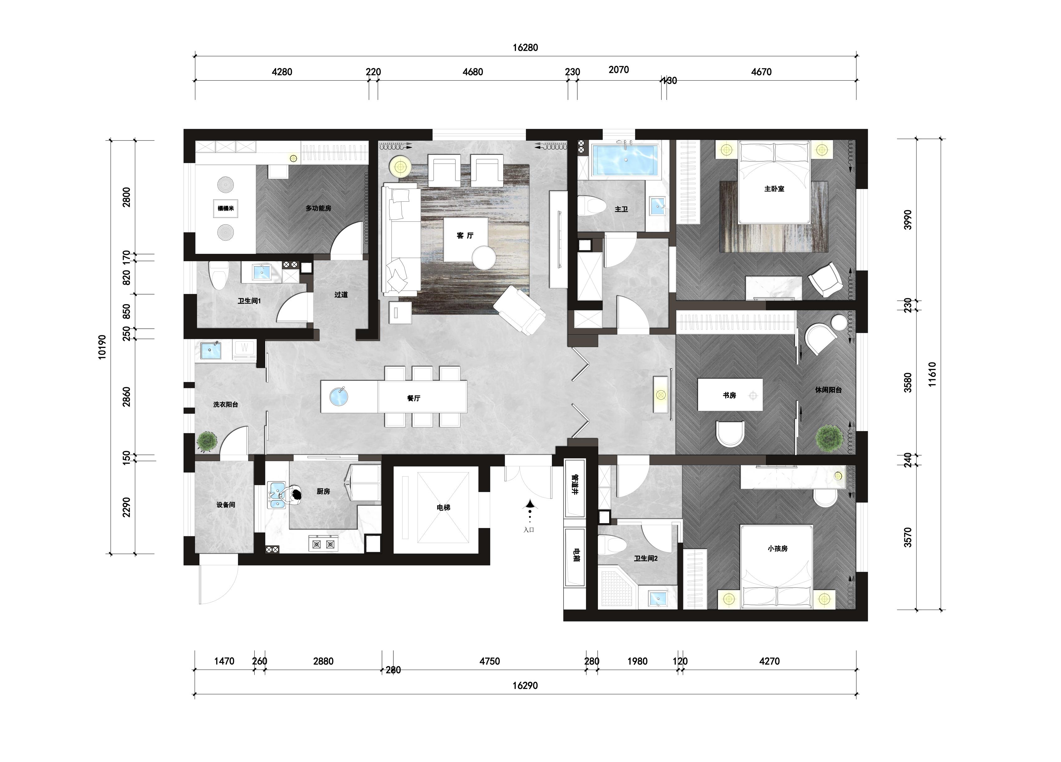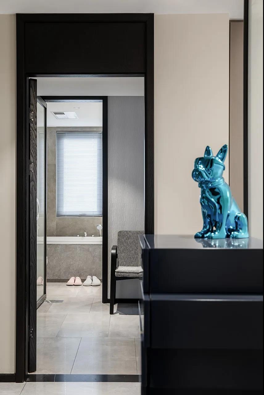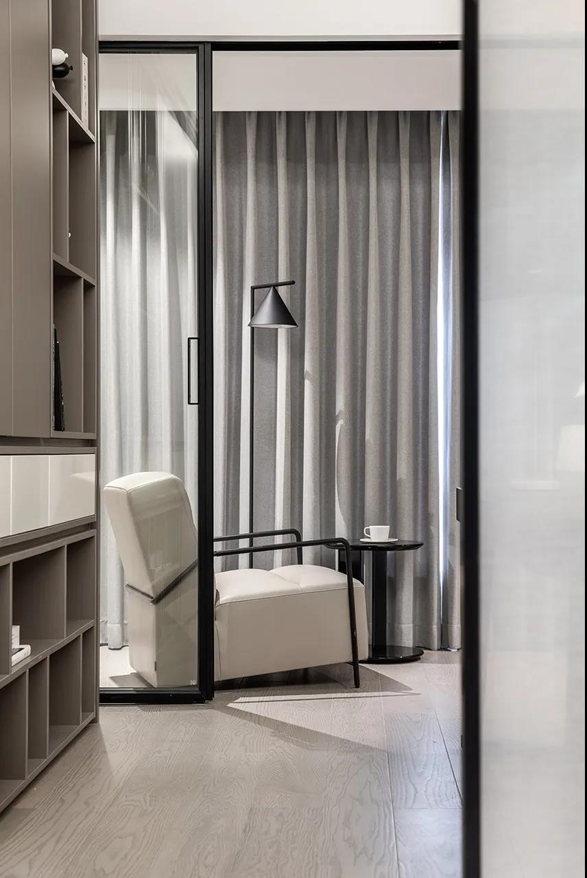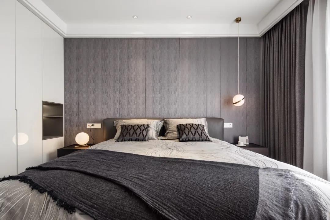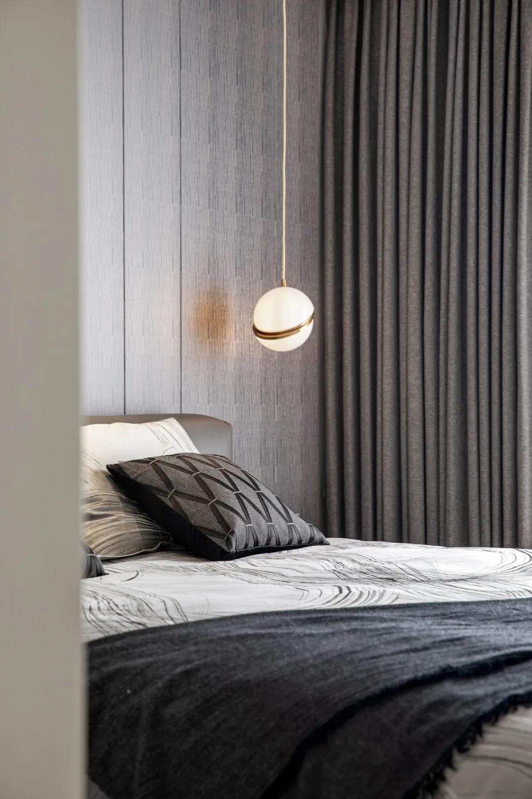 主卧和次卧呈对称布局,分列书房的东西两侧,各自带独立卫生间,并在入口和卫生间之间做了一个过渡收纳区,便于衣物的更换。黑白灰的低饱和色调, 呈现卧室宁静安和的氛围。