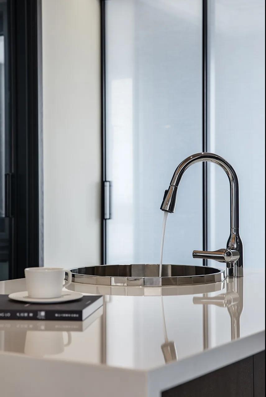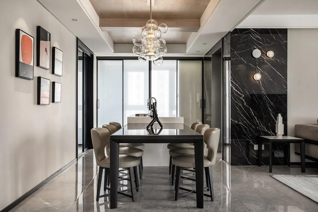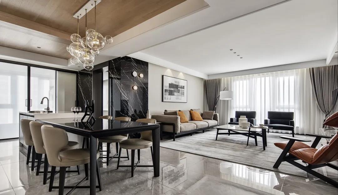 首先,设计师选择把客厅和餐厅连成一体,并通过一字形的吧台和餐桌设计,让厨房和餐厅之间有了较好的过渡,也使得北阳台洗衣房和餐桌之间有了一个合适的距离。拓展的空间,一体化的设计,使得餐厅的舒适度得到了很大的提升,并且不影响客厅给人的大气感受。