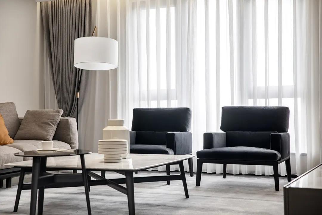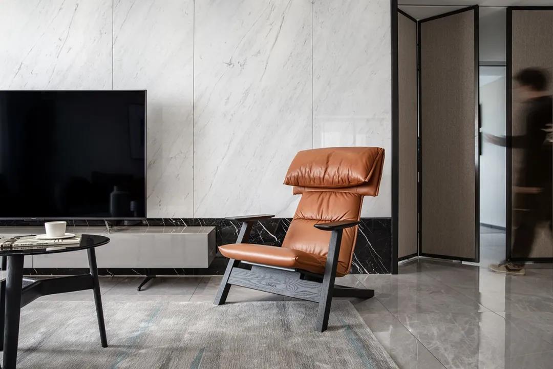客厅部分简约舒适,整面的落地窗和无主灯的设计,使空间显得尤为干净大方。亚麻的组合沙发与原木的真皮单椅,给空间带来自然、温馨的氛围。大块面的理石墙面,黑白两色穿插设计,显现了空间的品质感。