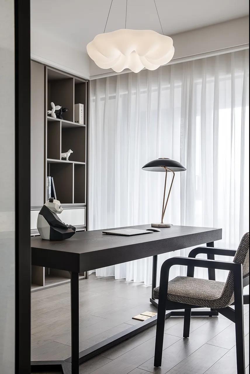 南面的书房是客餐厅和两个卧室之间的过渡区域,兼具多重功能。由于其位置直对着餐厅,所以设计师通过设置折叠门的方式增强了空间的灵活性:白天打开折叠门,让书房与餐厅、客厅的空间连接起来,使空间变的开阔和灵动,同时也把自然光和风迎了进来;书房过道处的绢丝玻璃屏风又与餐厅的移门呼应了起来,使空间有种朦胧的美;晚上把折叠门关起来,又让书房成为了主卧的一部分,既相连又独立。