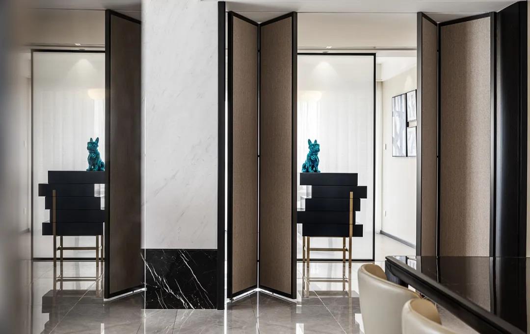 我们把四扇绢丝玻璃移门做成了屏风的形式,同时也解决了餐