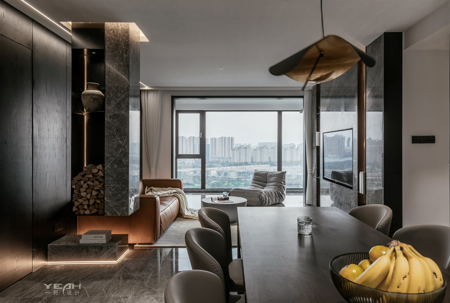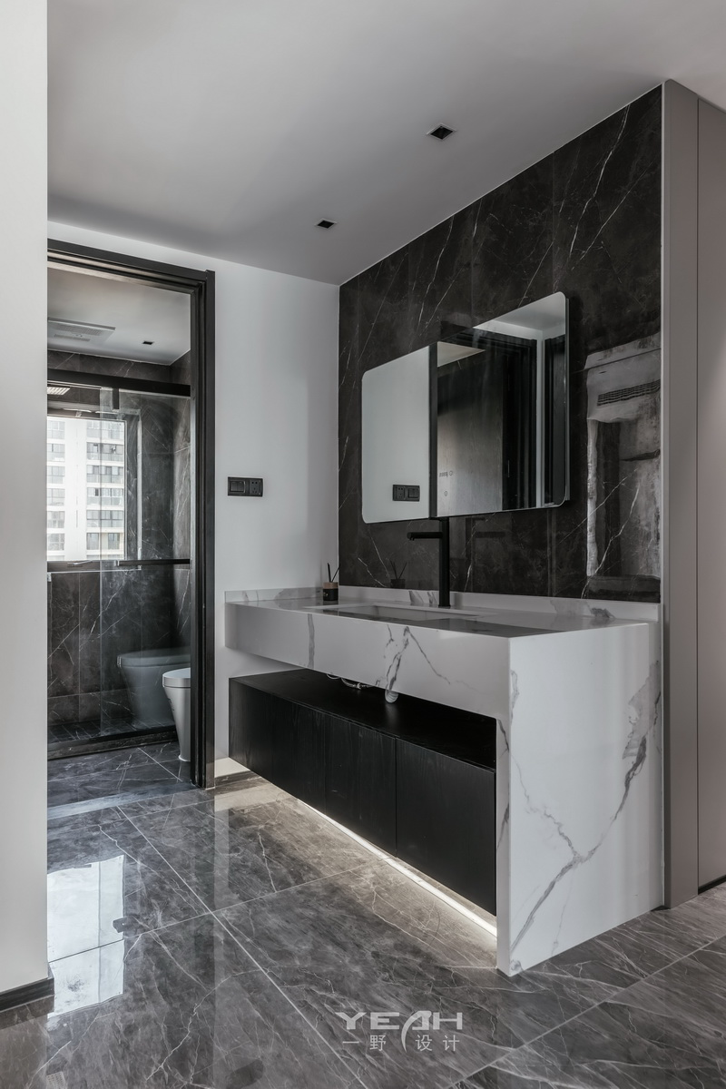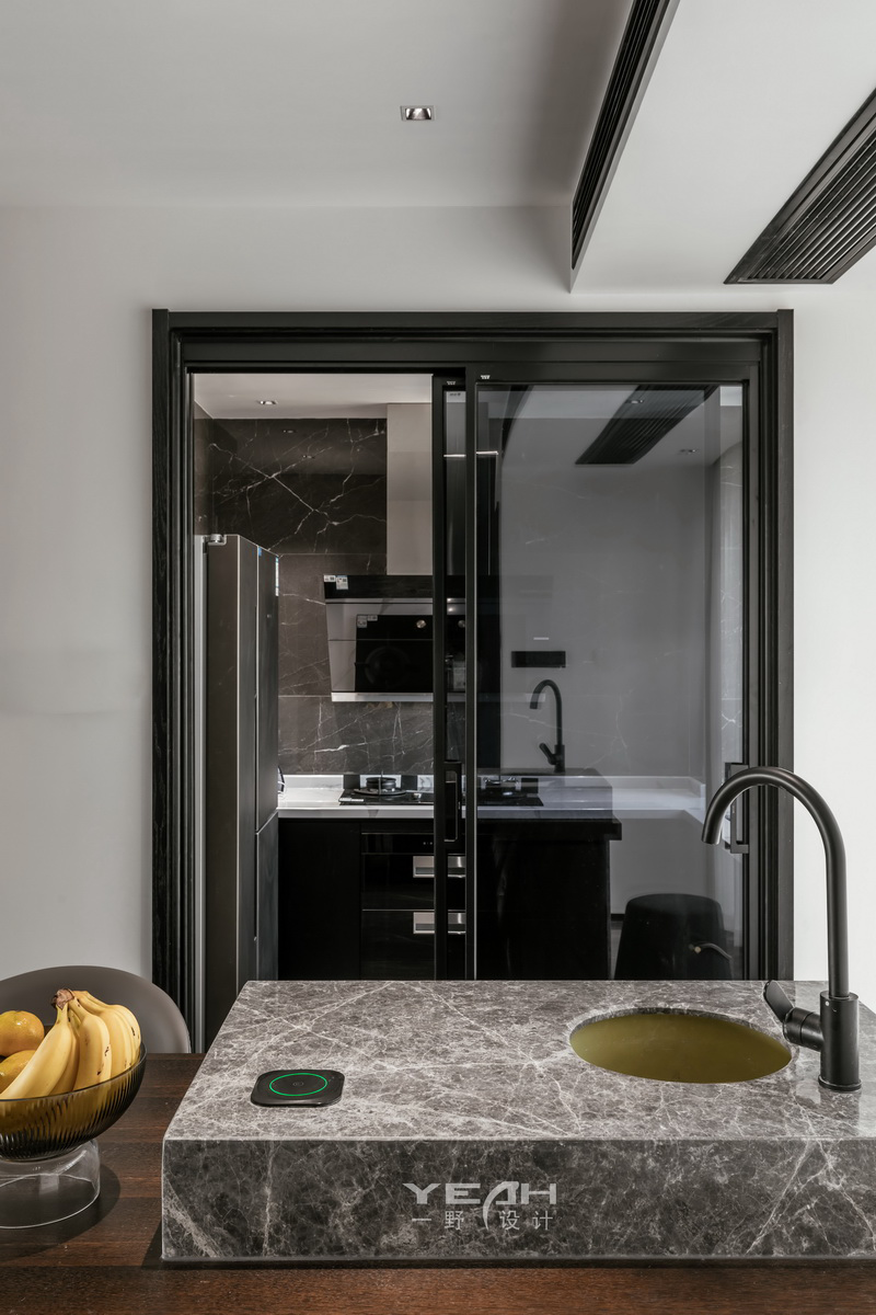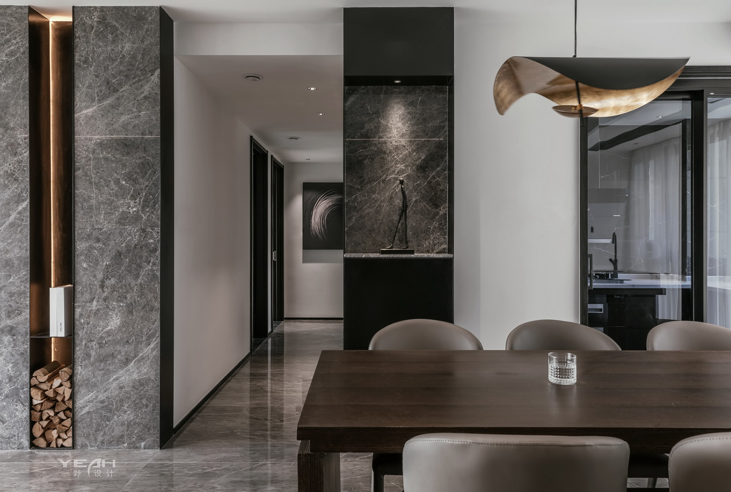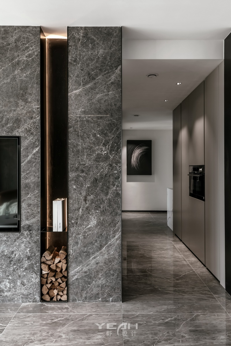 客餐厅的大理石,木饰面及黑钢与灯带,通过不同造型组合,让材料有不同的构架,灯线穿透 ,空间放大的体验。 整面的落地窗,将最美好的自然光引入室内,每一刻所感受到“光”都具有不同的意义。