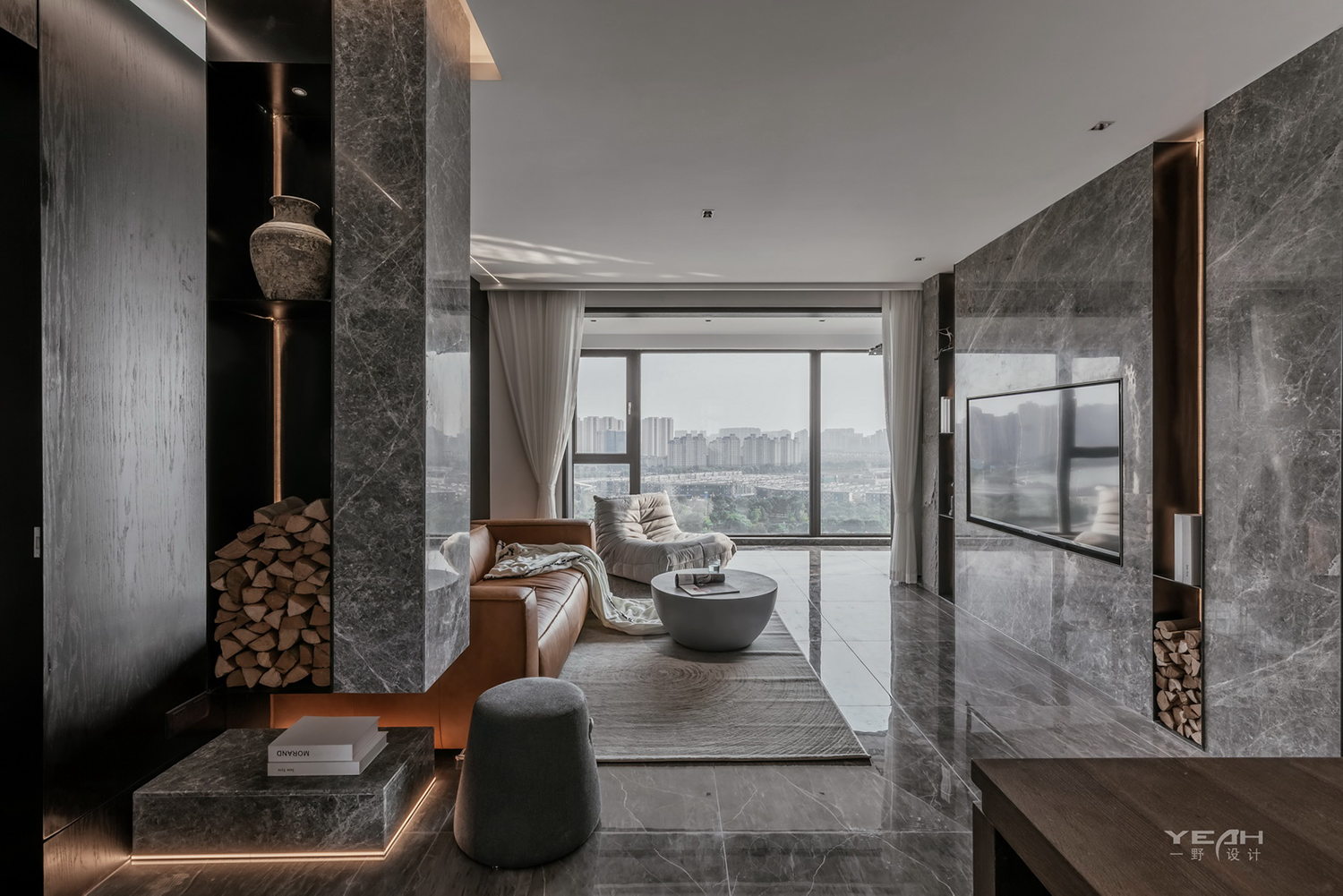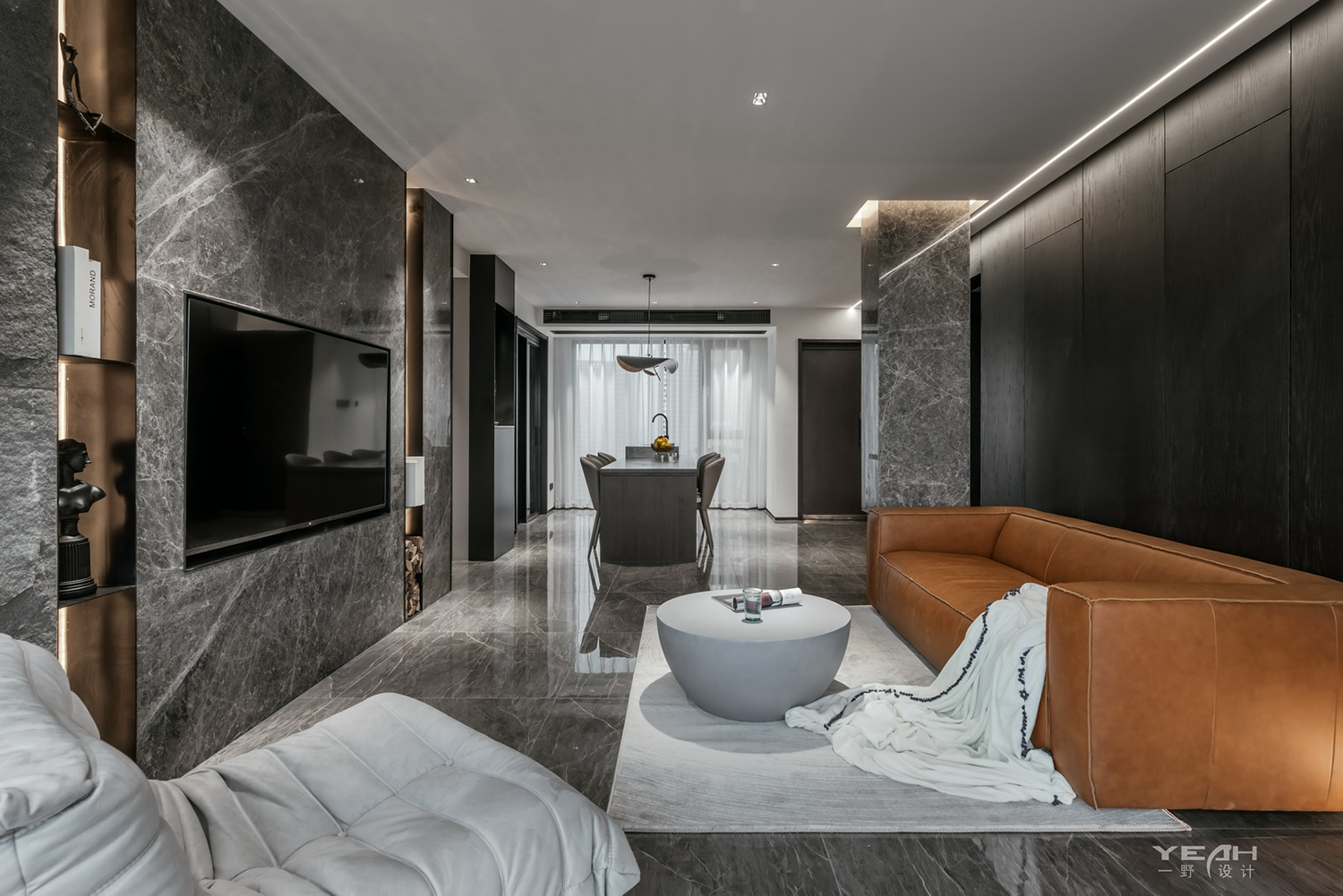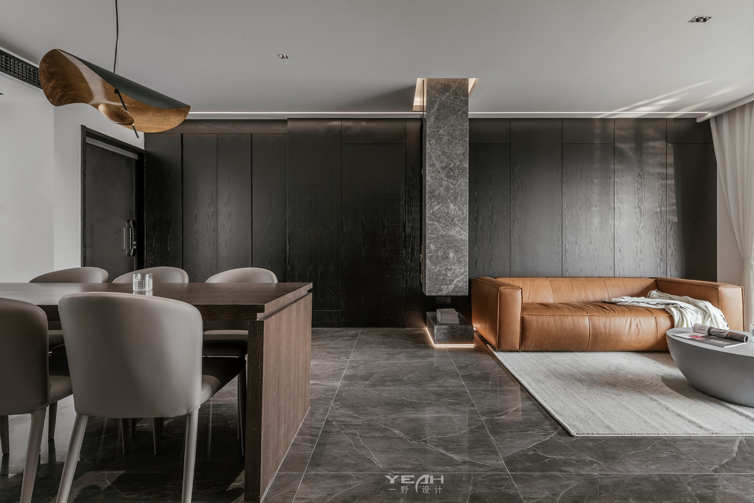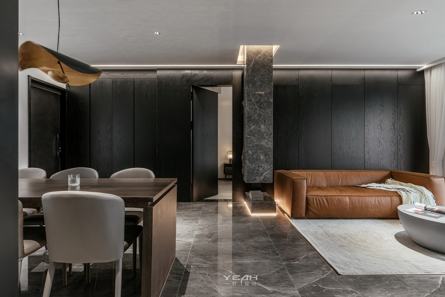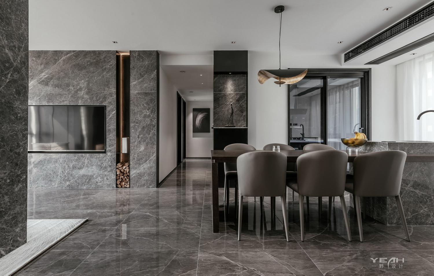 客餐厅的大理石,木饰面及黑钢与灯带,通过不同造型组合,让材料有不同的构架,灯线穿透 ,空间放大的体验。 整面的落地窗,将最美好的自然光引入室内,每一刻所感受到“光”都具有不同的意义。