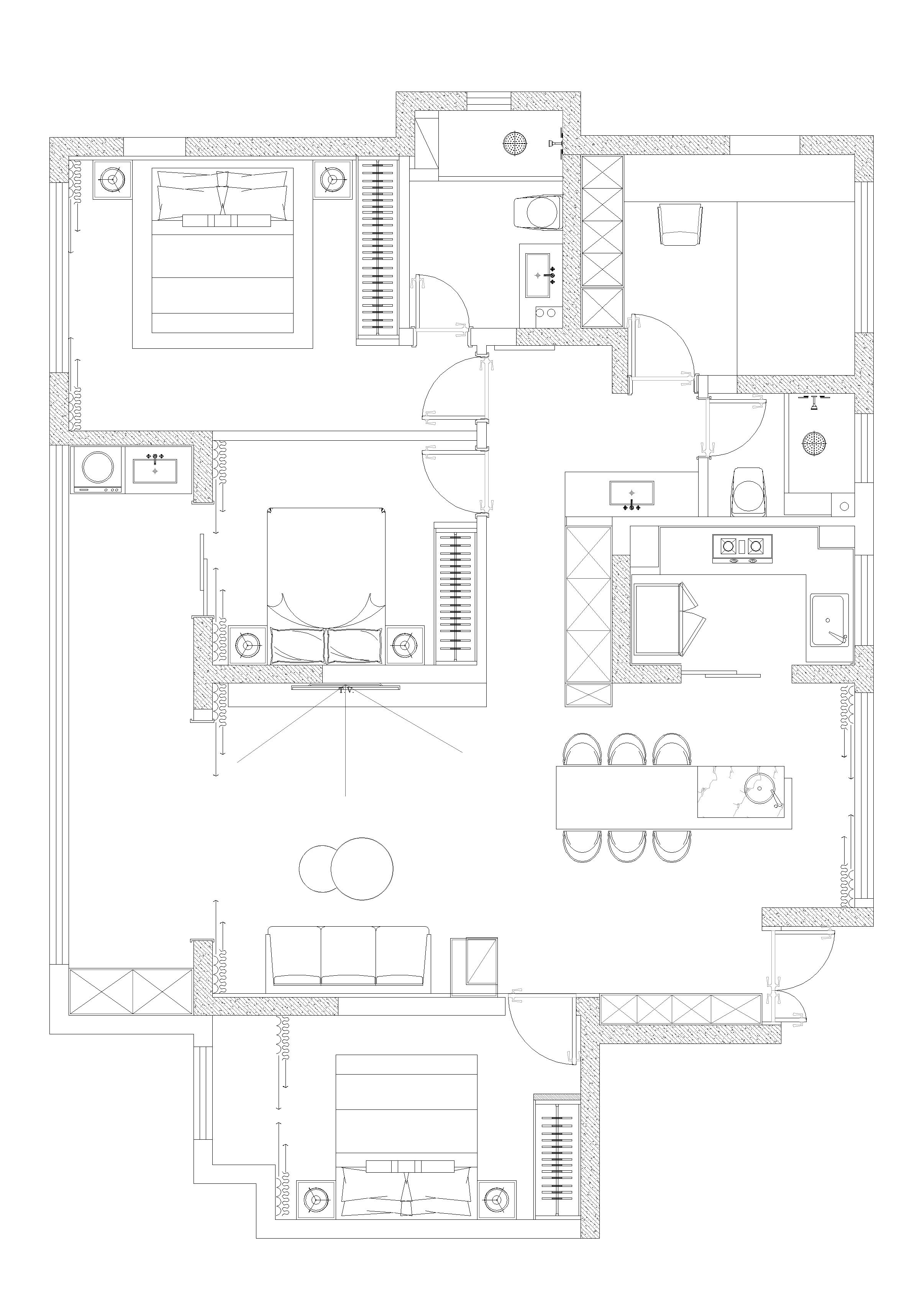 原结构阳台太多,也使得能够利用的空间更多。承重墙体较多,卧室可变动性不是很大,厨房餐厅及入户玄关过小