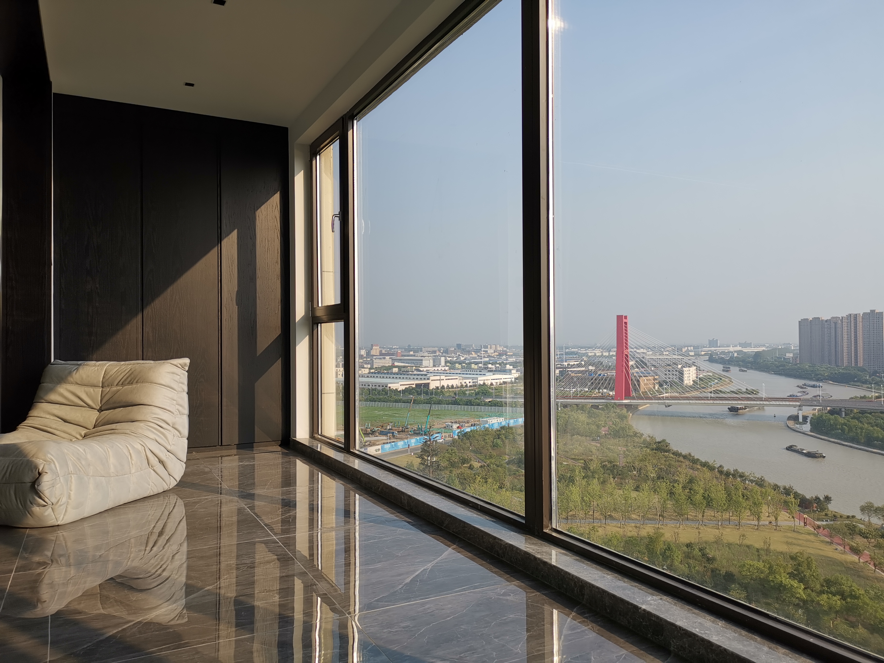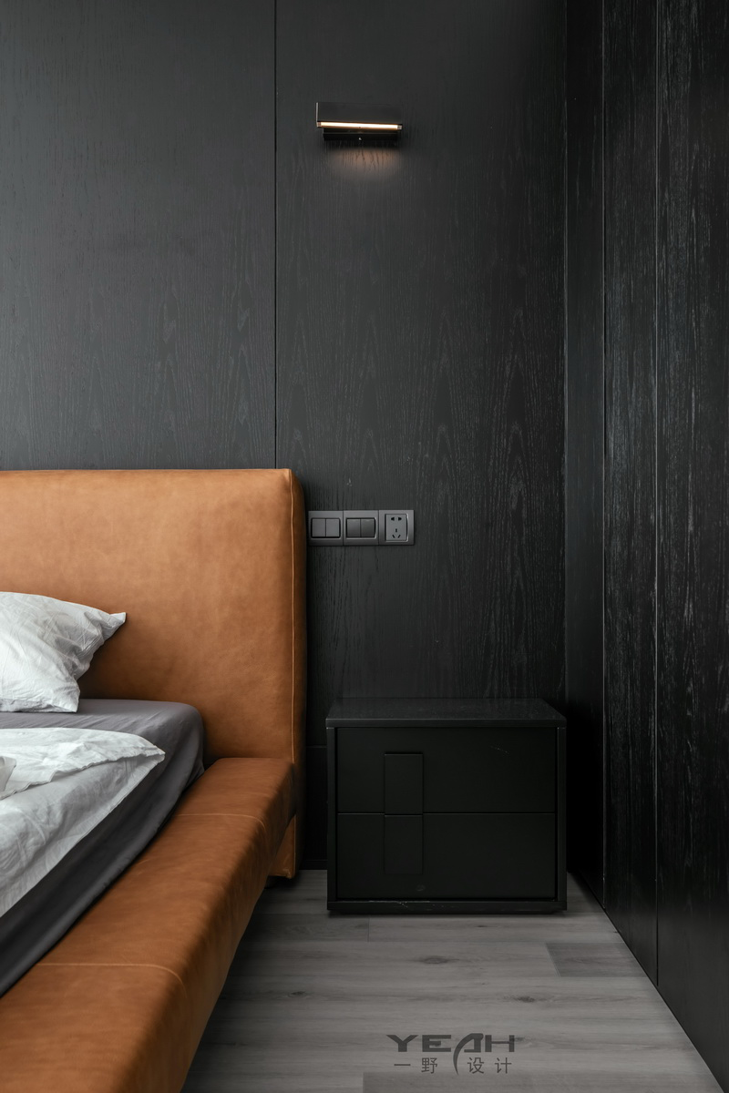 私人领域,须经过一个灰色空间的设定。卧室依旧使用了满墙的饰面板,采用大面积落地增加采光,每日清晨京杭运河便印入眼帘。