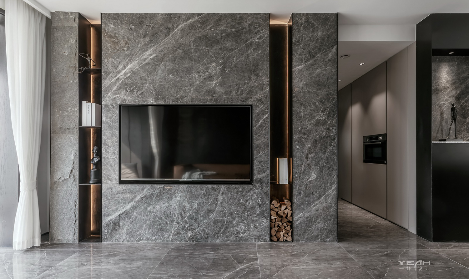设计选材:材料的选择上,大理石,钢板,木饰面。
