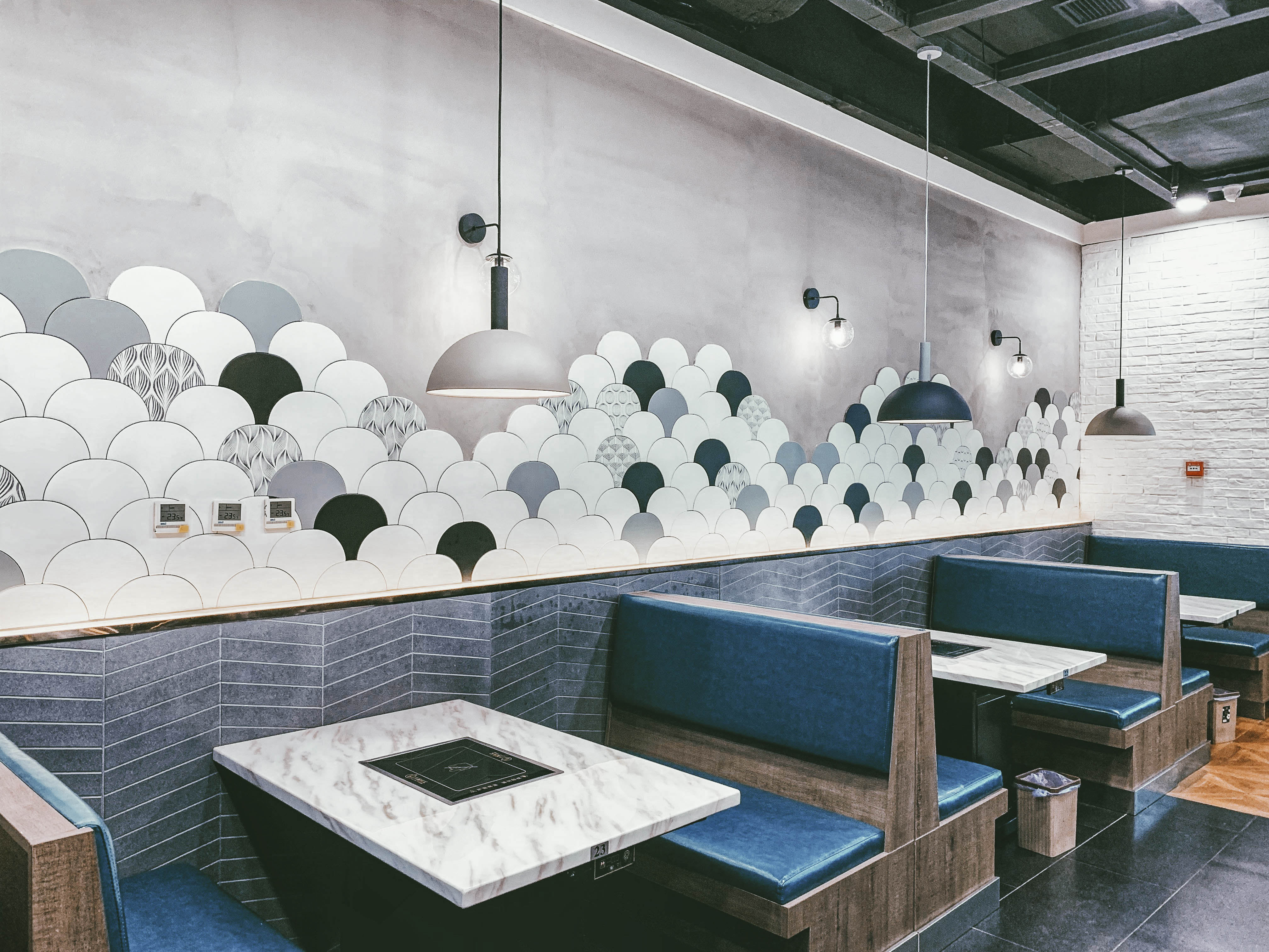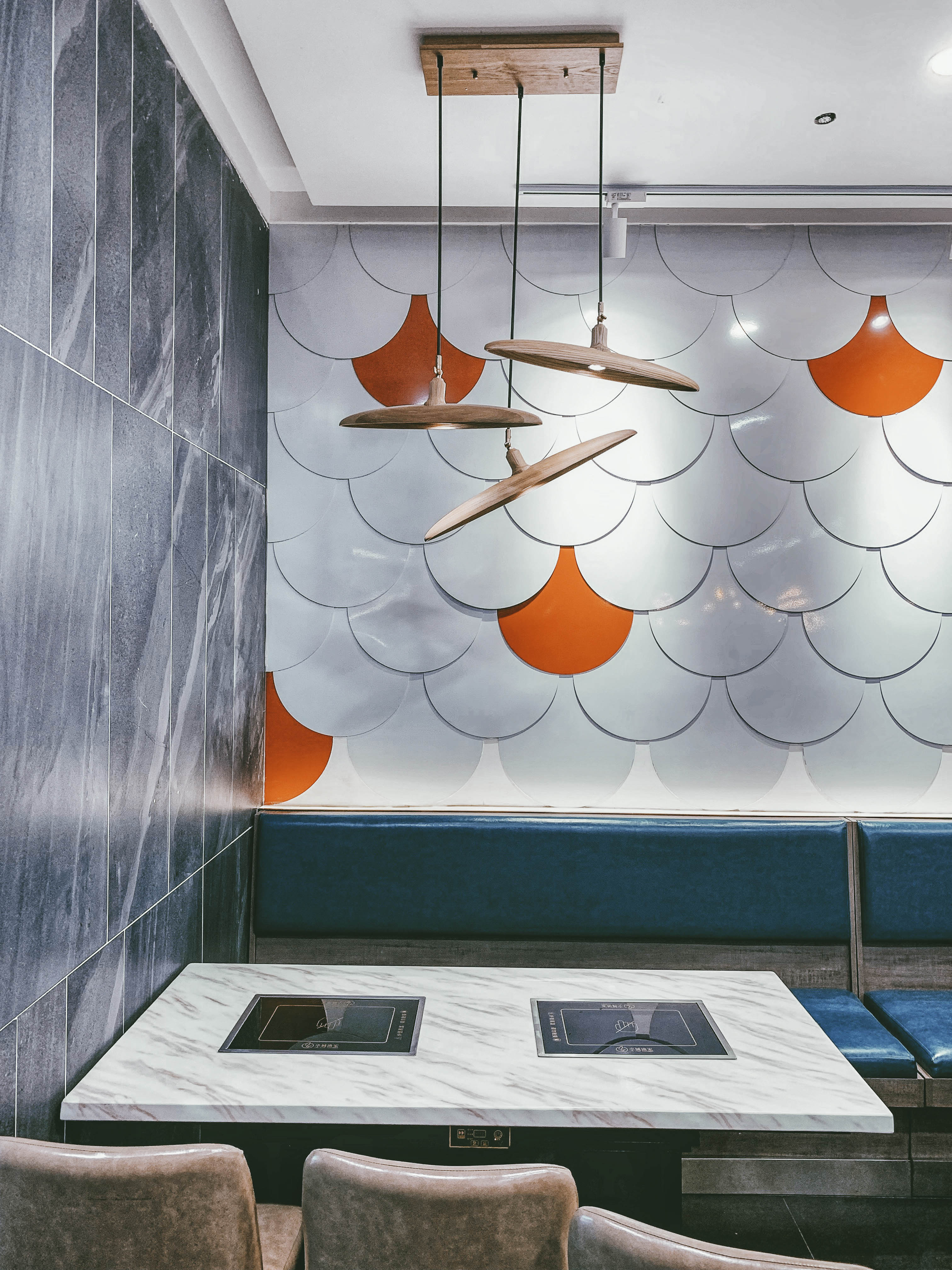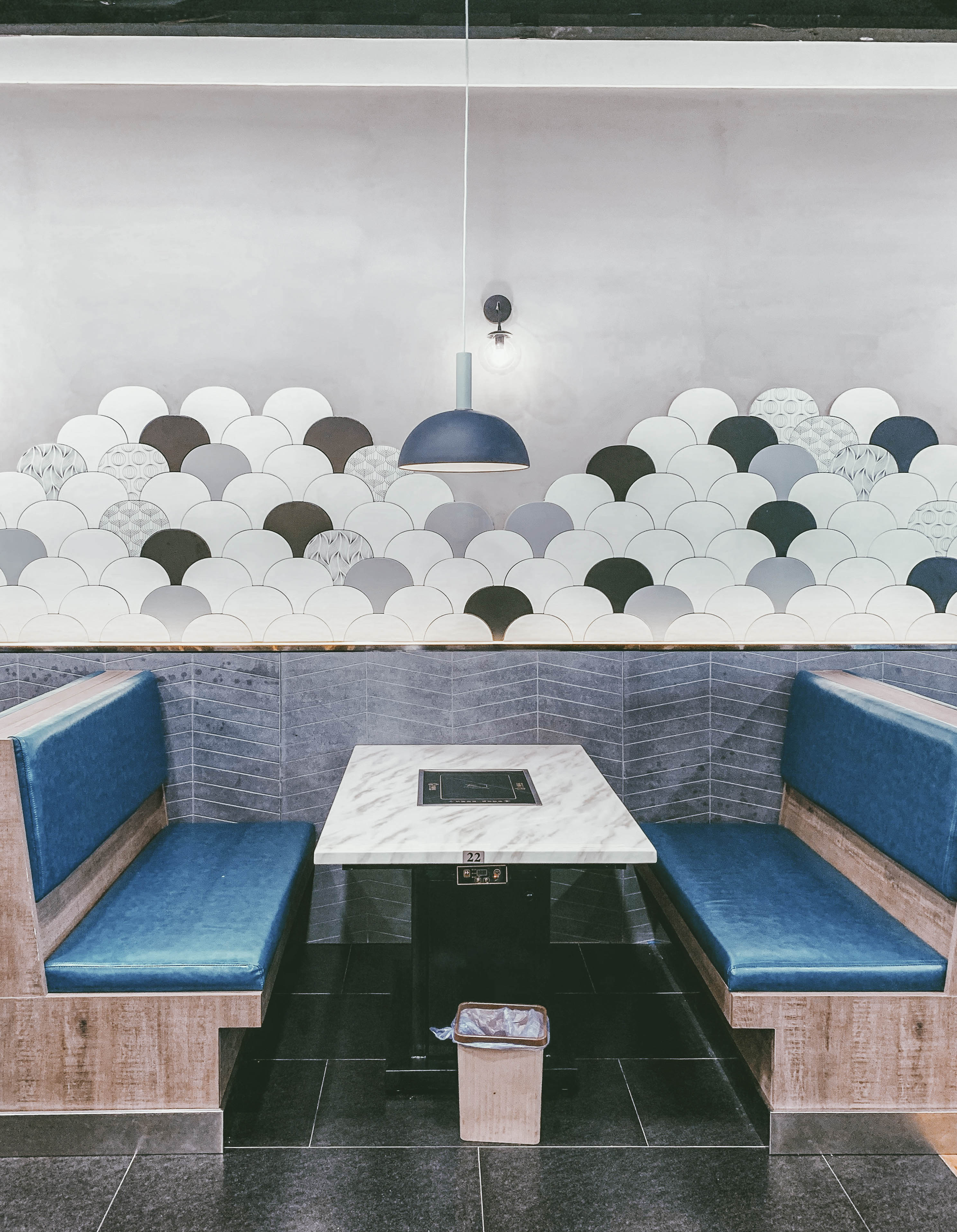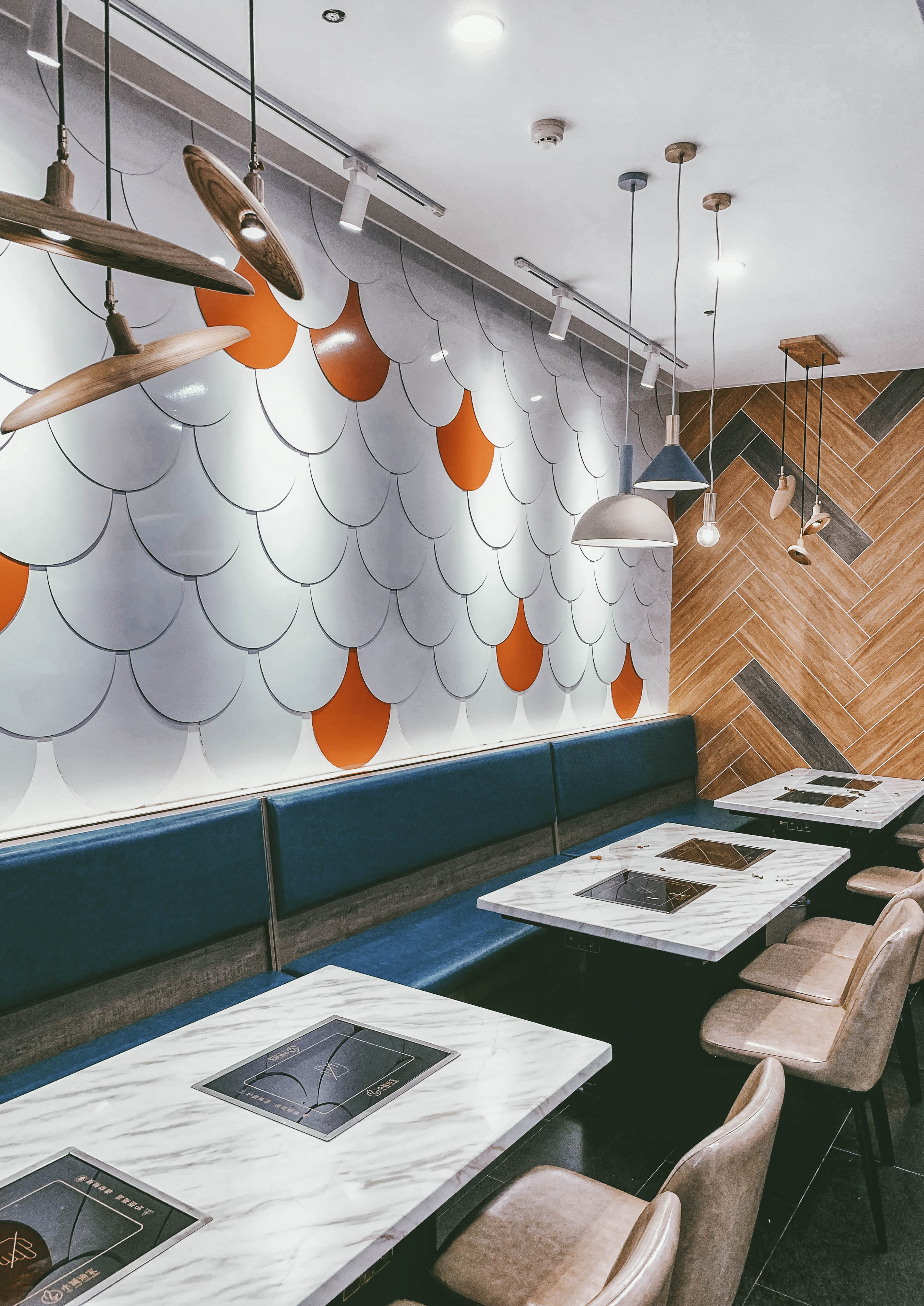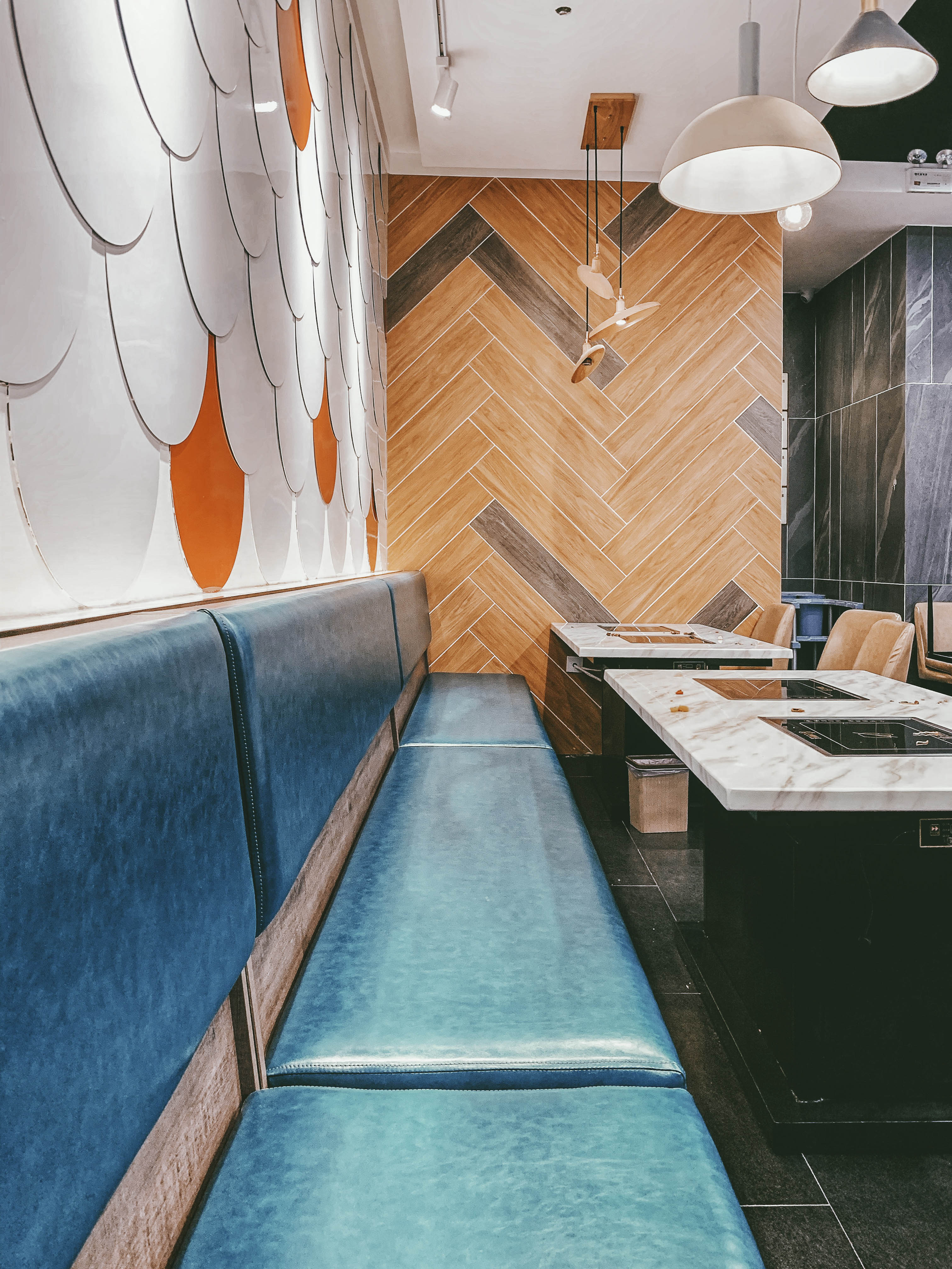 设计选材:为了反应美食烤鱼的元素应用的鱼骨的拼贴方式、灰色的大块面石头纹理偏爱自然材质的江南审美,设计强化了内部平坦与空白的空间。