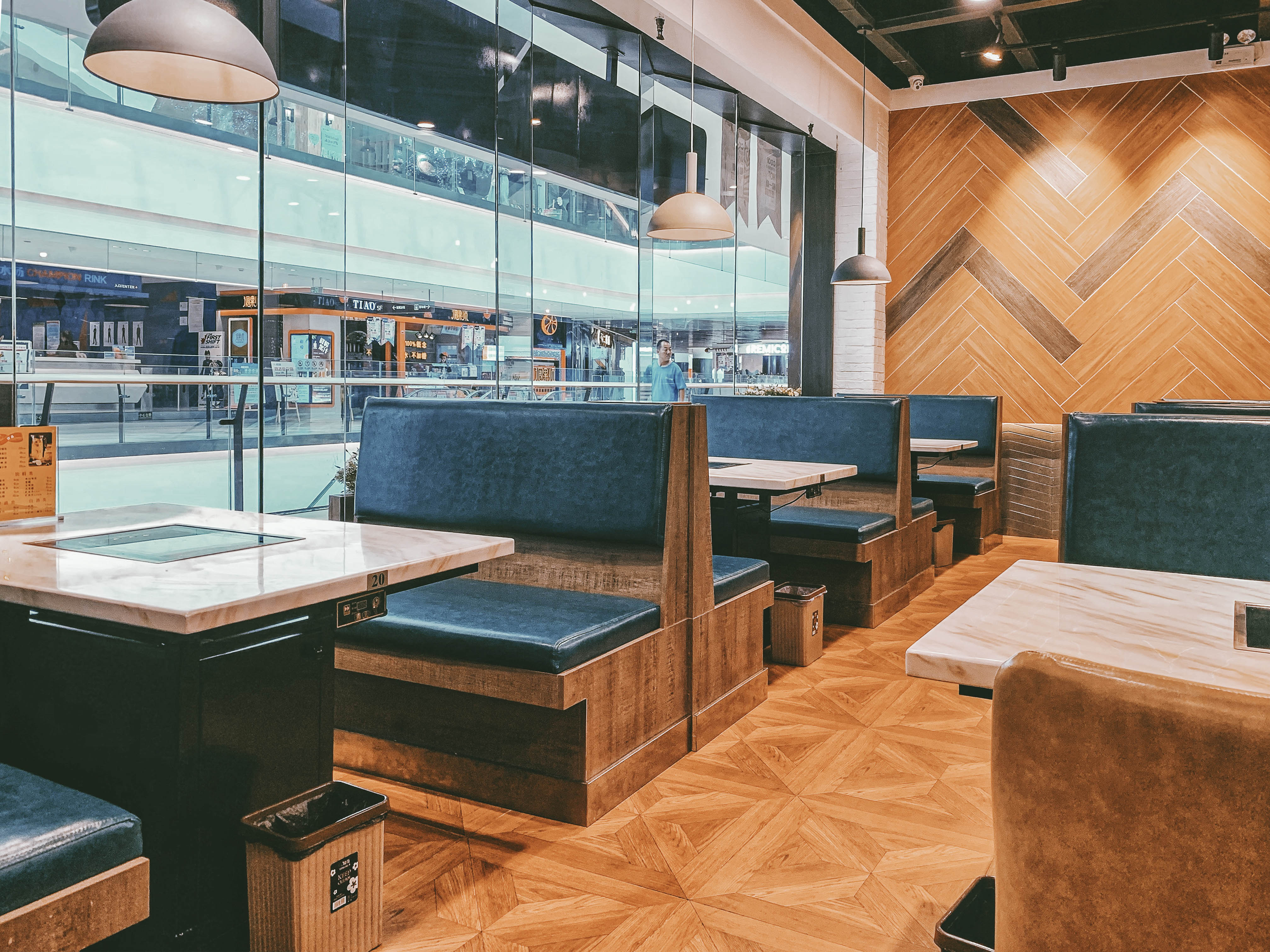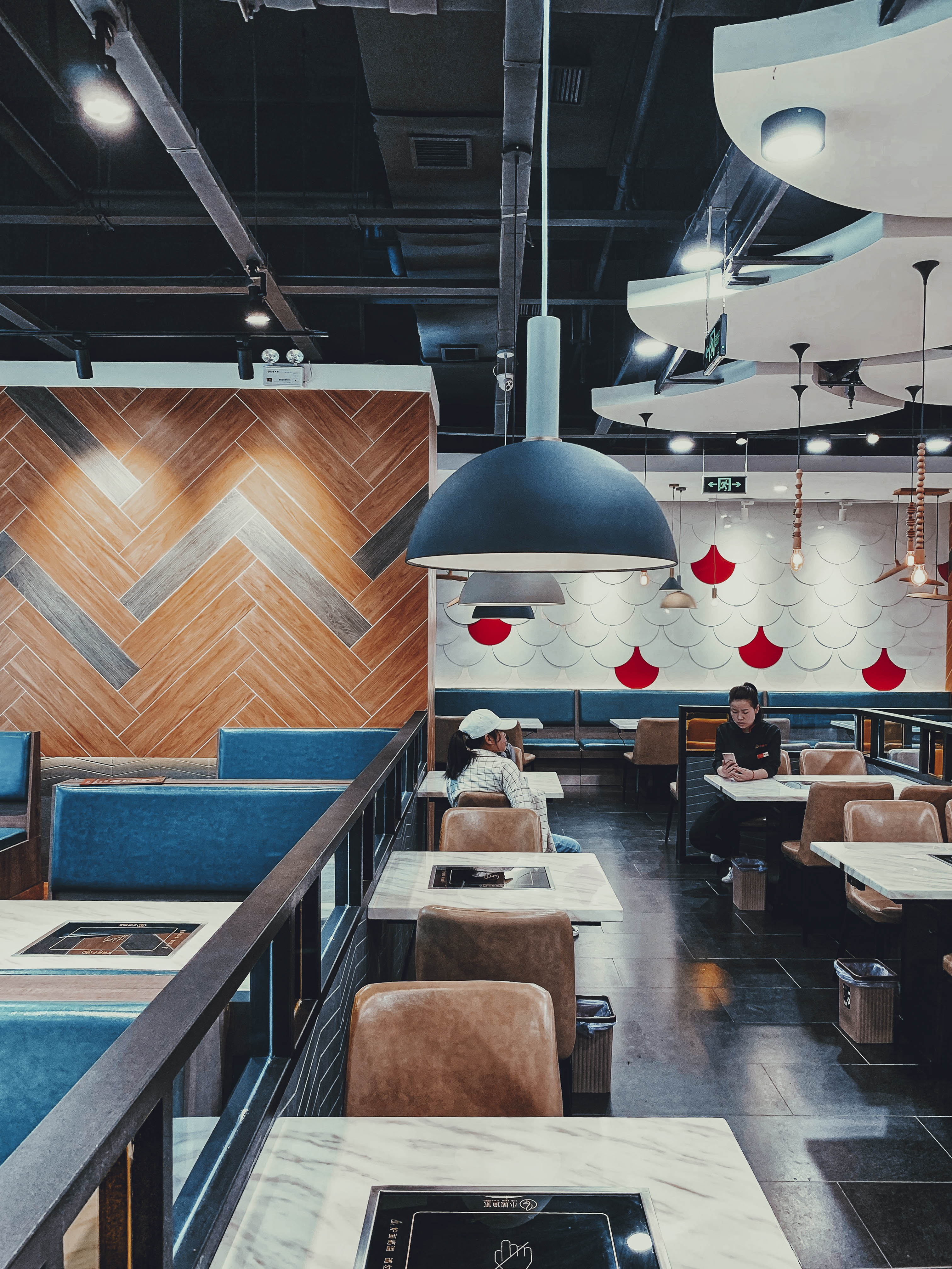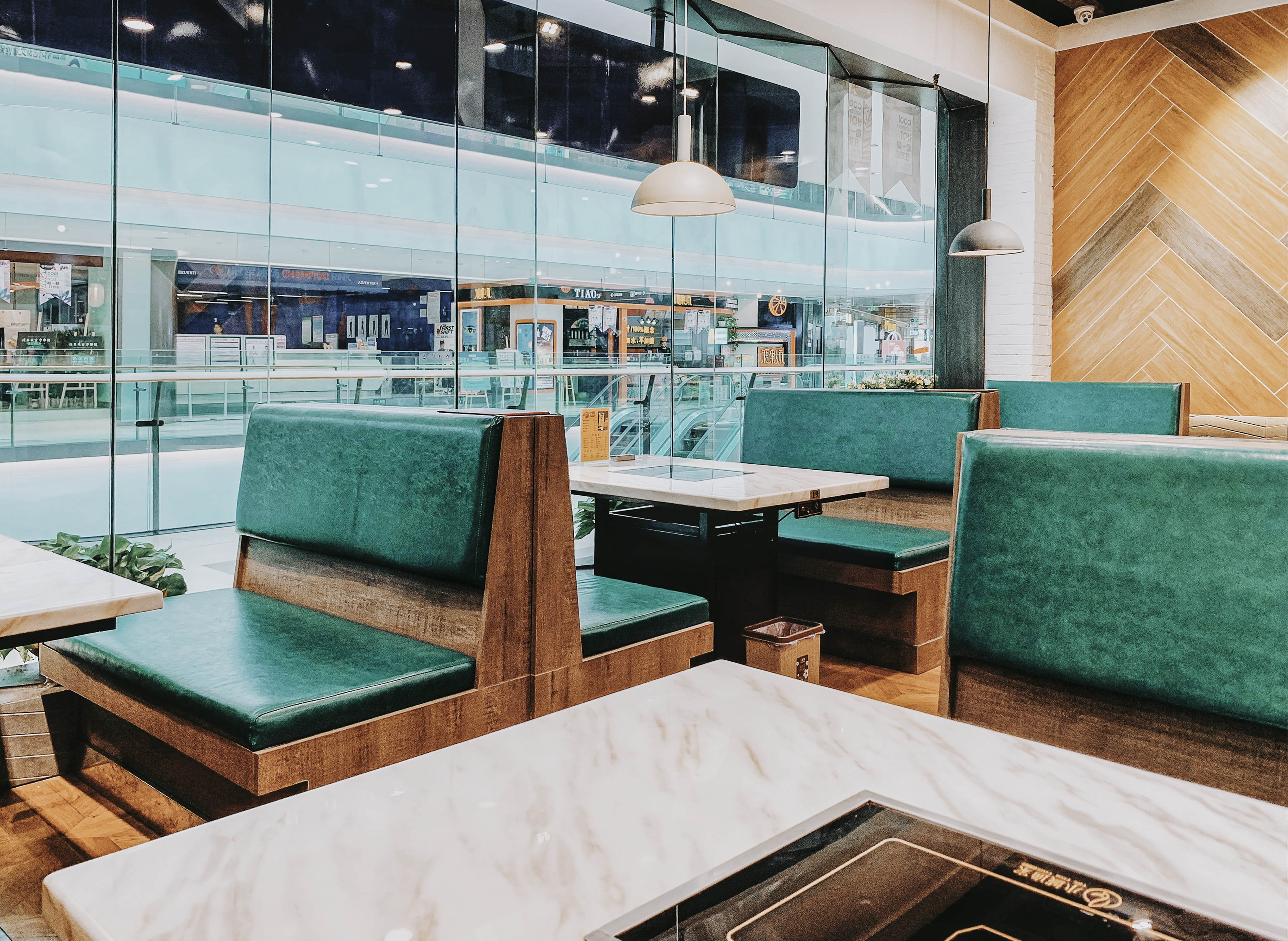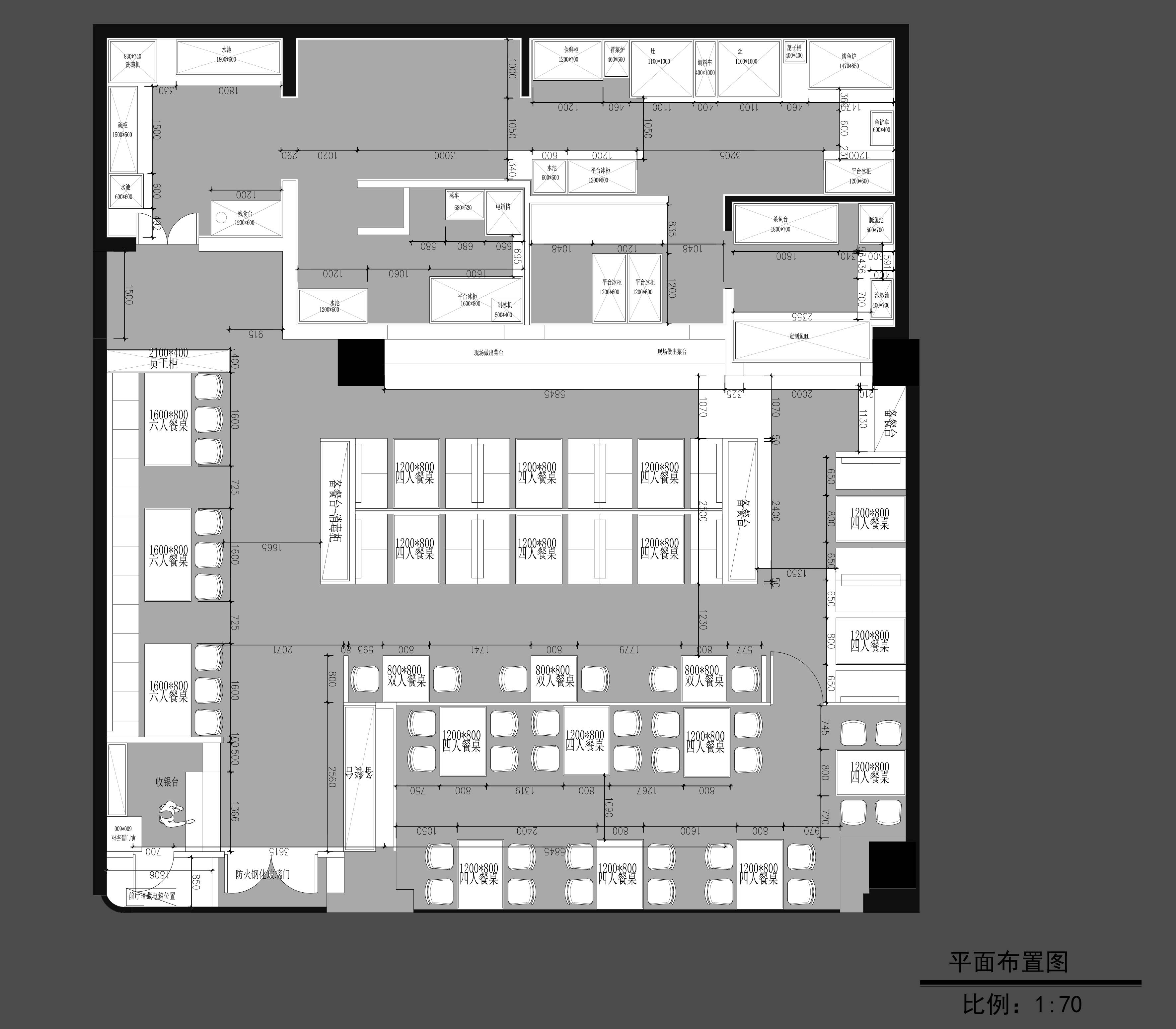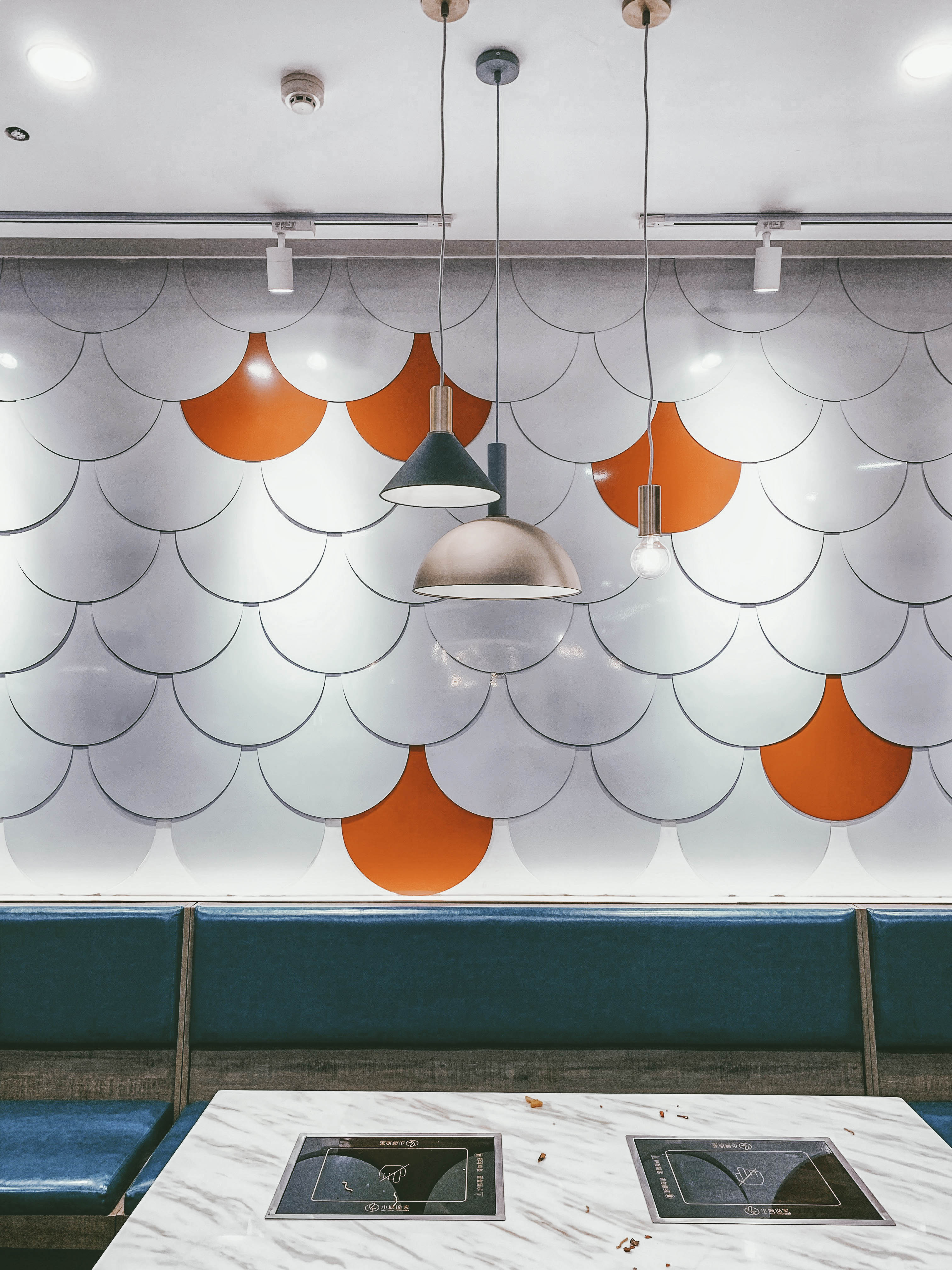 设计选材:为了反应美食烤鱼的元素应用的鱼骨的拼贴方式、灰色的大块面石头纹理偏爱自然材质的江南审美,设计强化了内部平坦与空白的空间。